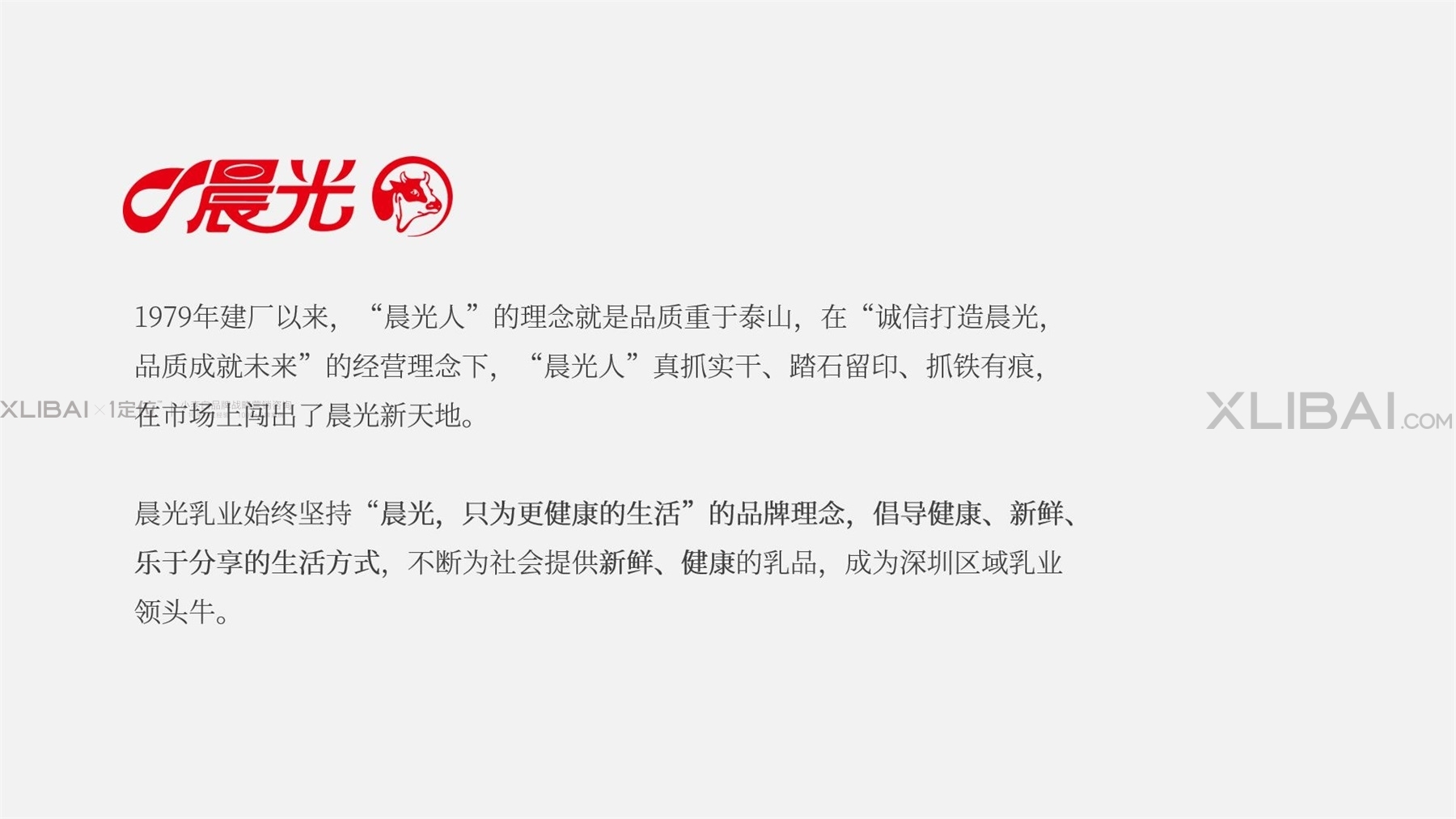 1979年建厂以来,“晨光人”的理念就是品质重于泰山,在“诚信打造晨光,品质成就未来”的经营理念下,“晨光人”真抓实干、踏石留印、抓铁有痕,在市场上闯出了晨光新天地。 晨光乳业始终坚持“晨光,只为更健康的生活”的品牌理念,倡导健康、新鲜、乐于分享的生活方式,不断为社会提供新鲜、健康的乳品,成为深圳区域乳业领头牛。