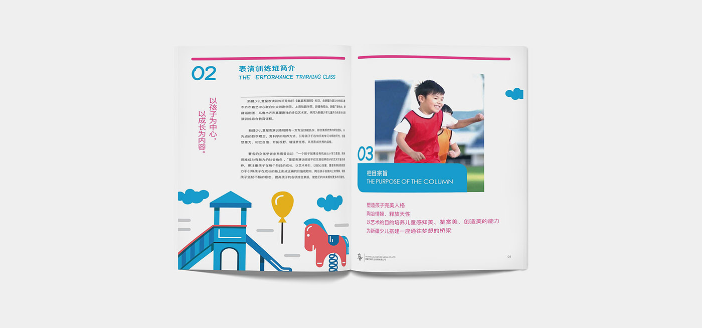嘉艺童星表演训练班是依托新疆电视台童星表演班栏目,由乌鲁木齐市嘉艺中心联合中央戏剧学院、上海戏剧学院、新疆电视台、新疆广播电台、新疆话剧团、乌鲁木齐市嘉墨剧社等艺术家们,共同为新疆少年儿童开办的多元化表演训练综合教育课程。围绕品牌核心,小李白通过提炼品牌的优势和卖点,用品牌思维对嘉艺童星表演班画册进行了板块规划和内容设计,完成了品牌内容丰富逻辑清晰的创意画册设计。