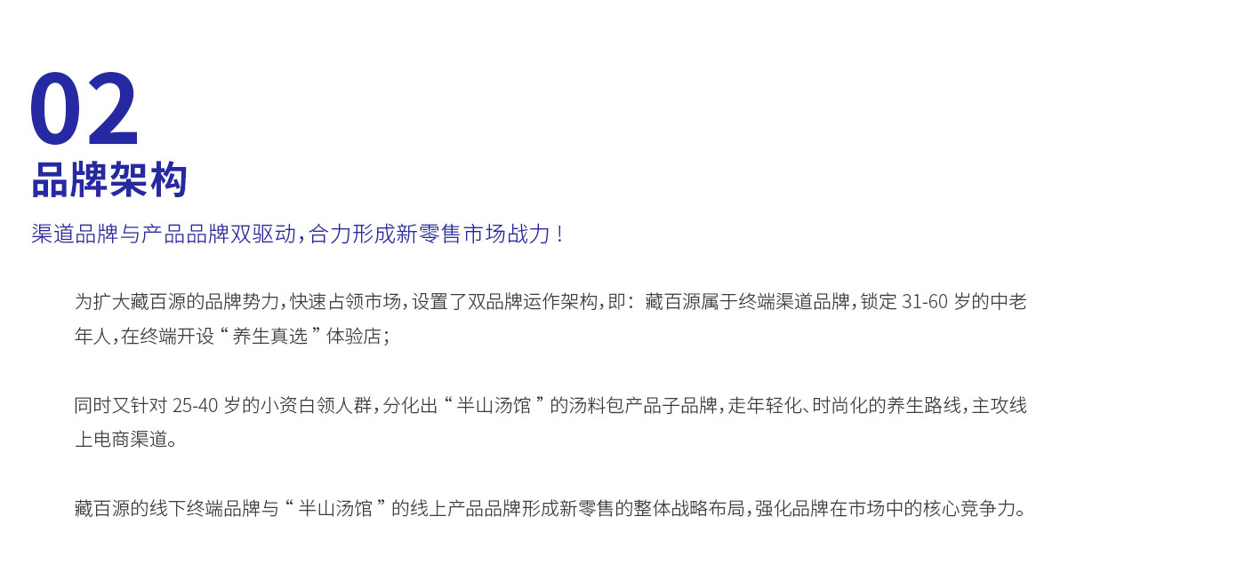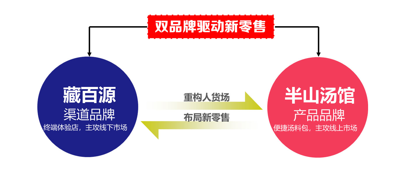2019年藏百源为了扩大品牌势力,分化出“半山汤馆”的汤料包品类子品牌,在面对零售困难的局面下,小李白为藏百源形成新零售的整体战略布局,重构养生人货场,强化品牌在市场中的核心竞争力。对藏百源品牌价值,子品牌产品文化进行全面升级打造,构建独有的滋补养生产品文化,引起了产业一股新风潮。为滋补养生界打造出一个“盒马鲜生”