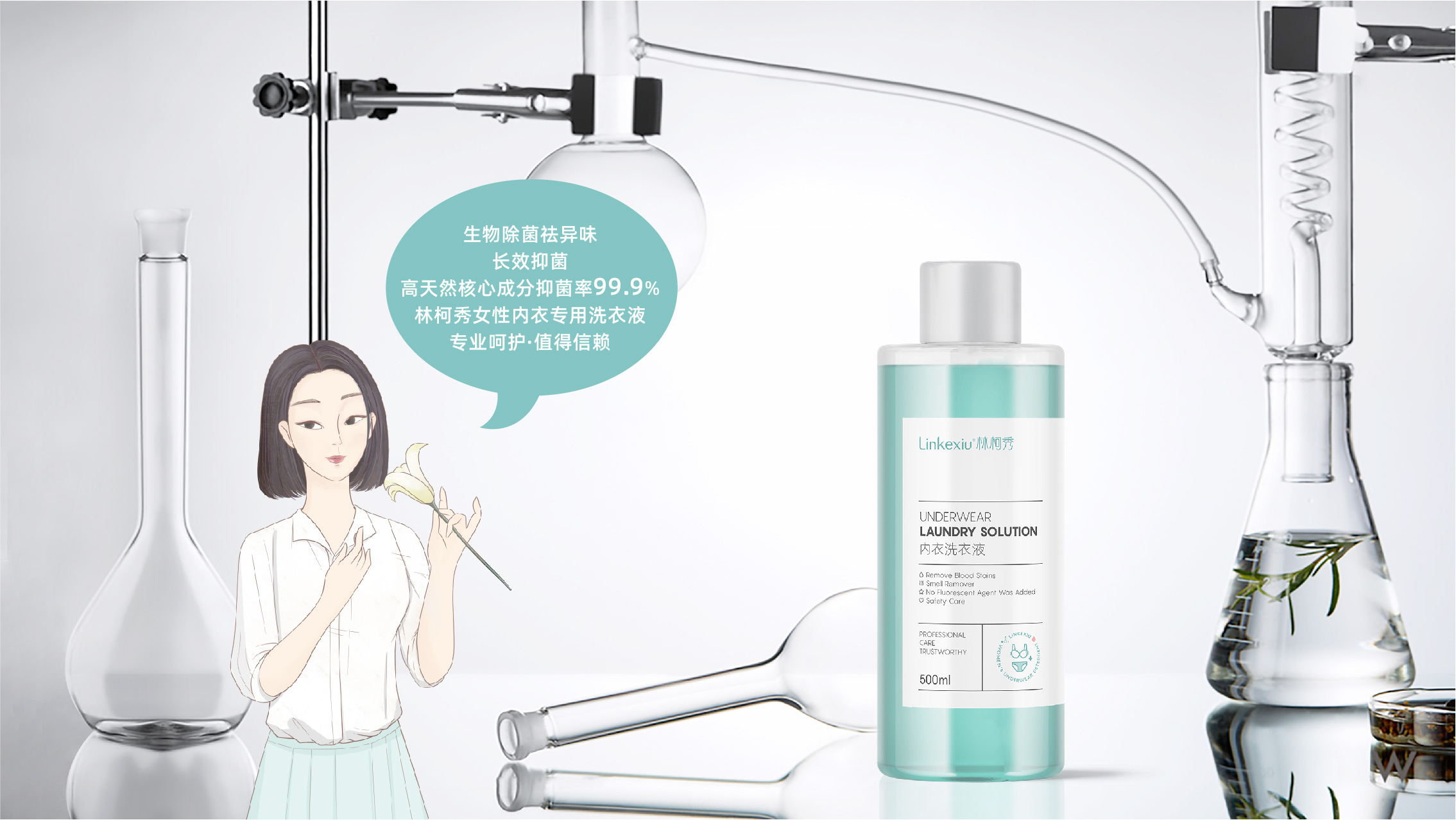 因战略发展需要,林柯秀于2019年委托小李白进行品牌形象全面打造。小李白从品牌战略定位维度出发,以文化核心切入,以倡导“专业呵护•值得信赖”为基因,使林柯秀女性内衣专用洗衣液品牌的品牌价值、文化以直观视觉生动地呈现给消费者。