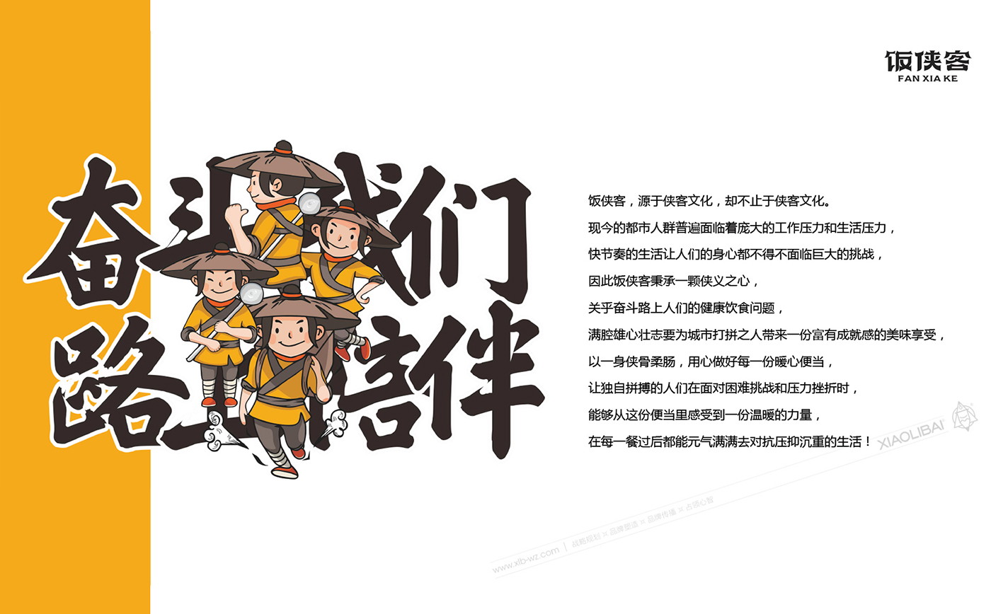 饭侠客,广州亨旺餐饮管理有限公司旗下的互联网便当外卖品牌。为进一步扩大饭侠客品牌的影响力,小李白通过市场洞察发现如今的年轻消费者对餐饮的综合要求已经变成“好吃不贵调性高”, 因此我们的服务定位也从“服务越来越多的人”调整为“为年轻群体提供新的生活方式”。除了性价比以外,关注客体需求、挖掘客群特征,提供难以替代的消费因素,从而得出“暖心励志便当”这一具有传播和营销活力的定位。并在这定位基础上进行了一系列的品牌延展,助力饭侠客初创品牌发展,成就国内餐饮外卖领域的一匹黑马。