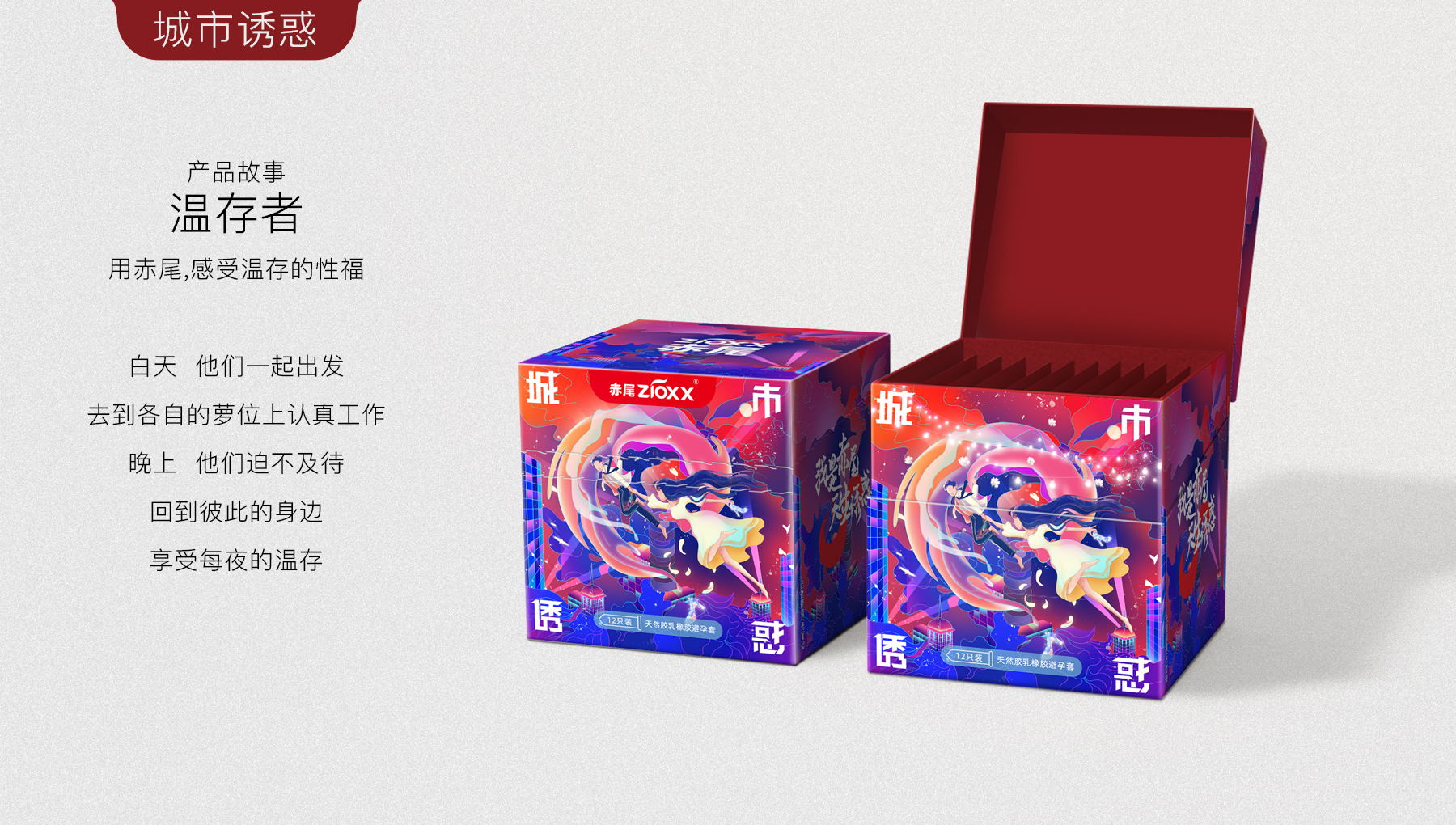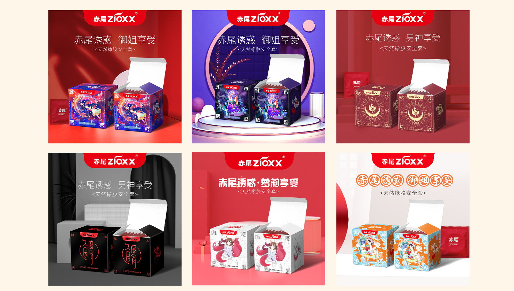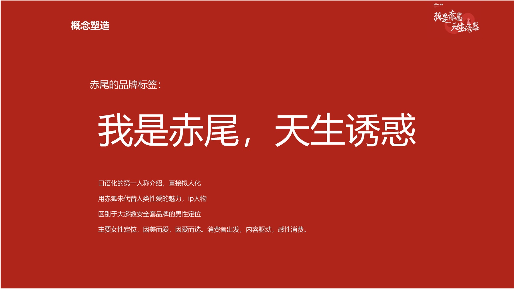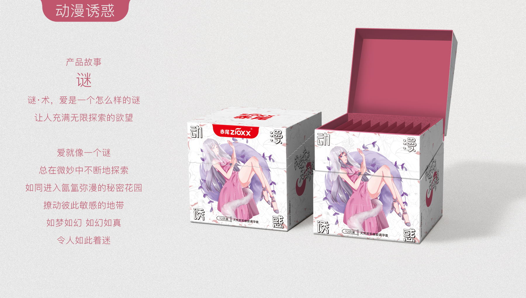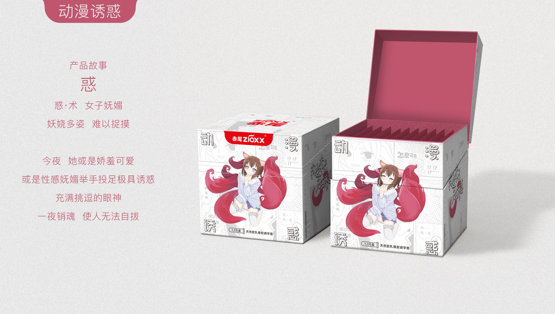 我是赤尾,天生诱惑,口语化的第一人称介绍,直接拟人化,用赤狐来代替人类性爱的魅力,ip人物区别于大多数安全套品牌的男性定位,主要女性定位,因美而爱,因爱而选。消费者出发,内容驱动,感性消费。根据市场消费升级的需求,小李白对“赤尾“进行品牌升级,重新升级赤尾VI、EVI、产品包装、赤尾IP形象等视觉输出。