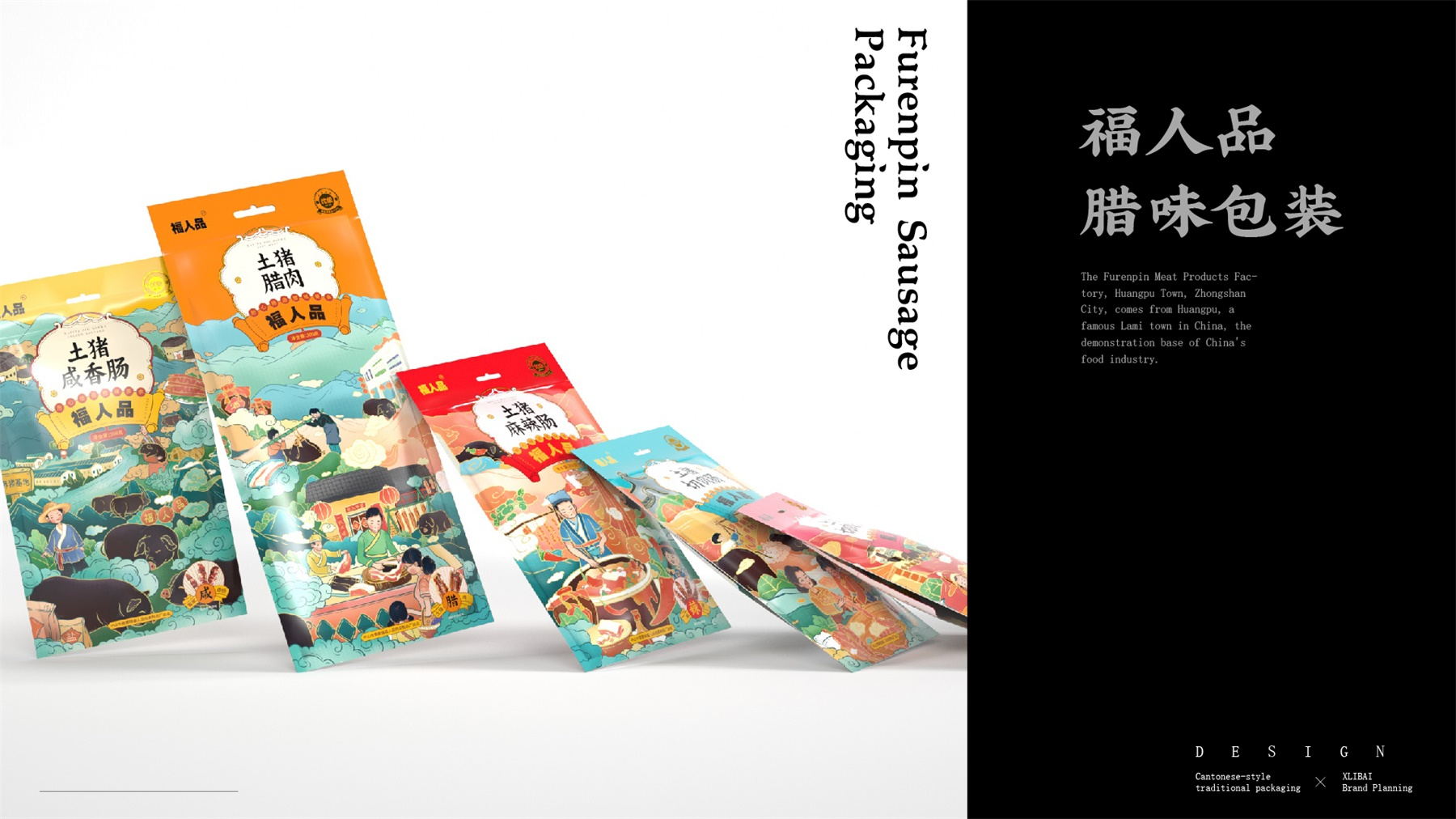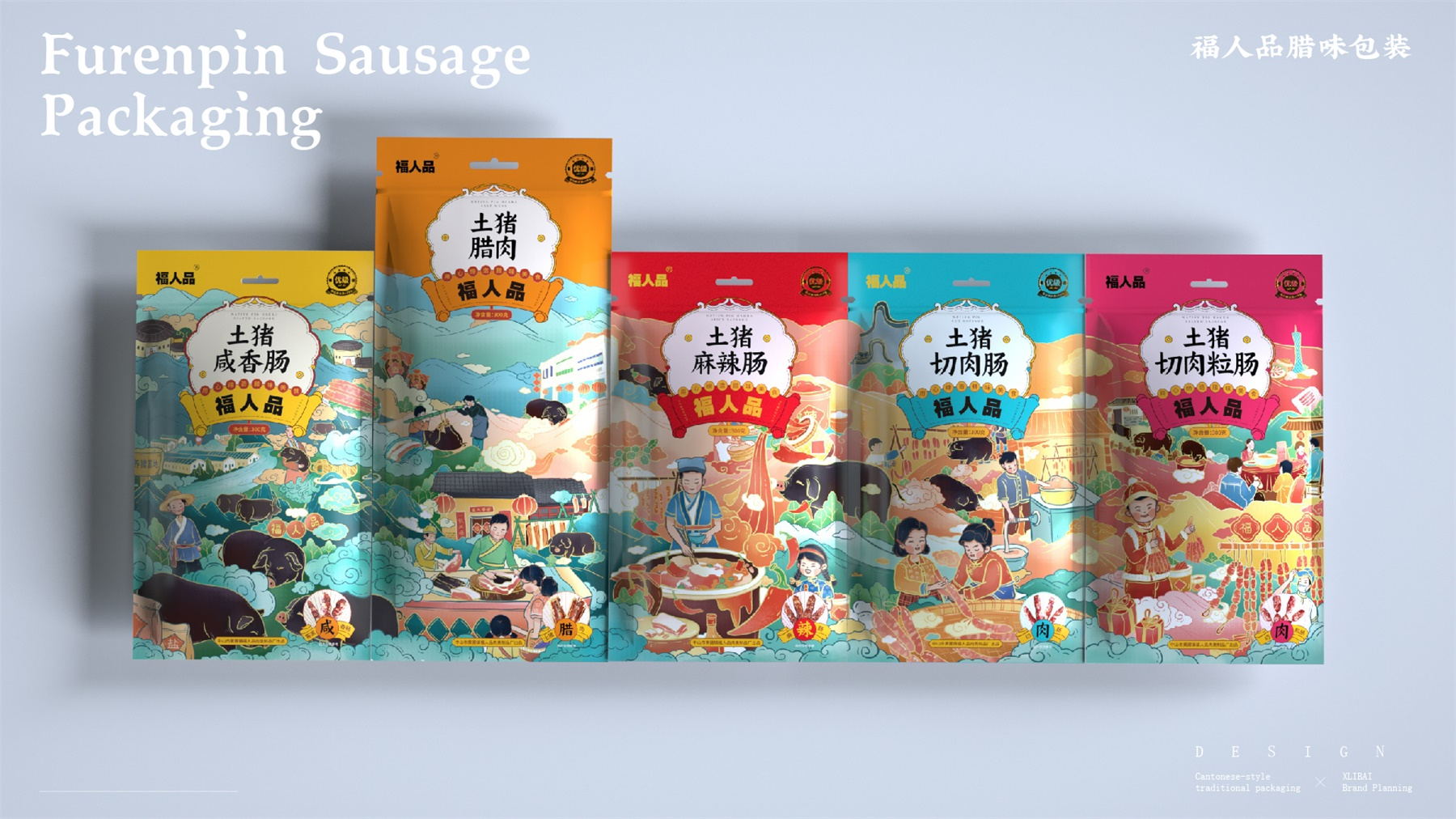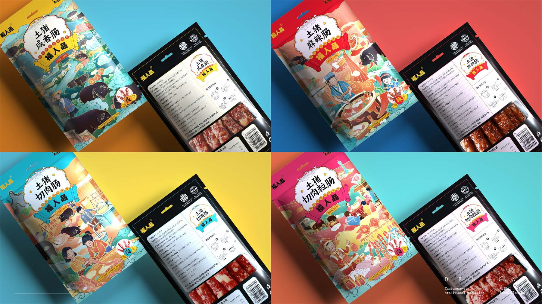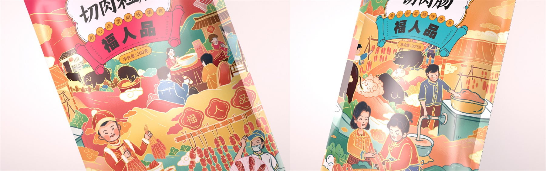 中山市黄圃镇福人品肉类制品厂来自中国食品工业示范基地中国腊味名镇——中山黄圃。主要生产腊味制品,制作工艺传承三代。目前市面上同类型的线下渠道腊味包装,多保持了传统的韵味,福人品的产品如想脱颖而出,就要在产品包装上进行升级。产品包装需要符合消费者对经典产品的印象,又要满足审美升级的需求。小李白设计师对于福人品的产品包装设计,是在传统韵味上采取更年轻的配色寻求差异化。将福人品古法手工的文化基因与消费者对腊味的美好寄托利用插画的形式铺开,徐徐道来。利用蒙太奇的手法穿插腊肠制作工艺、家庭食用场景及时间排序的广式建筑,打造一个热烈温馨的氛围。