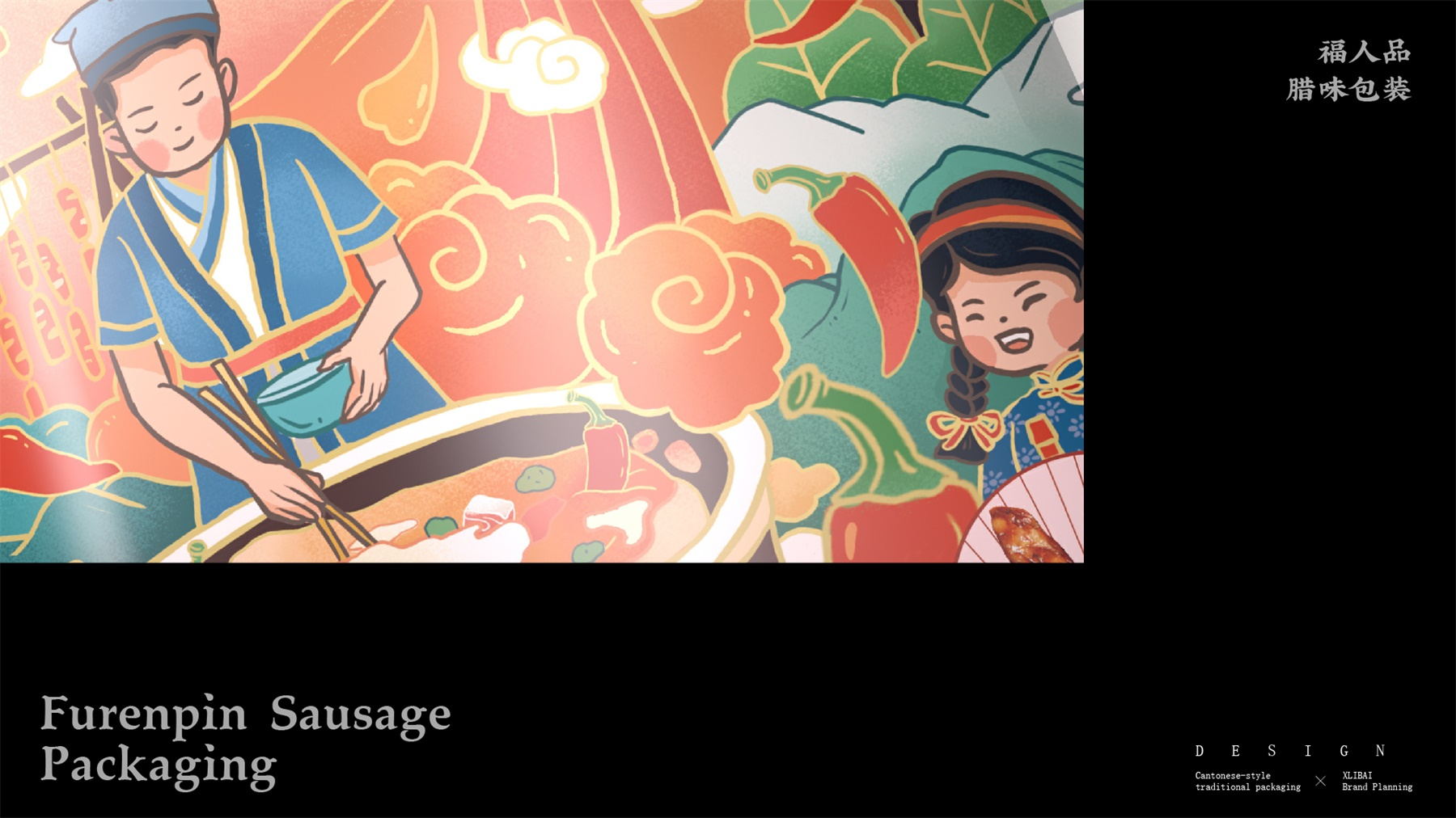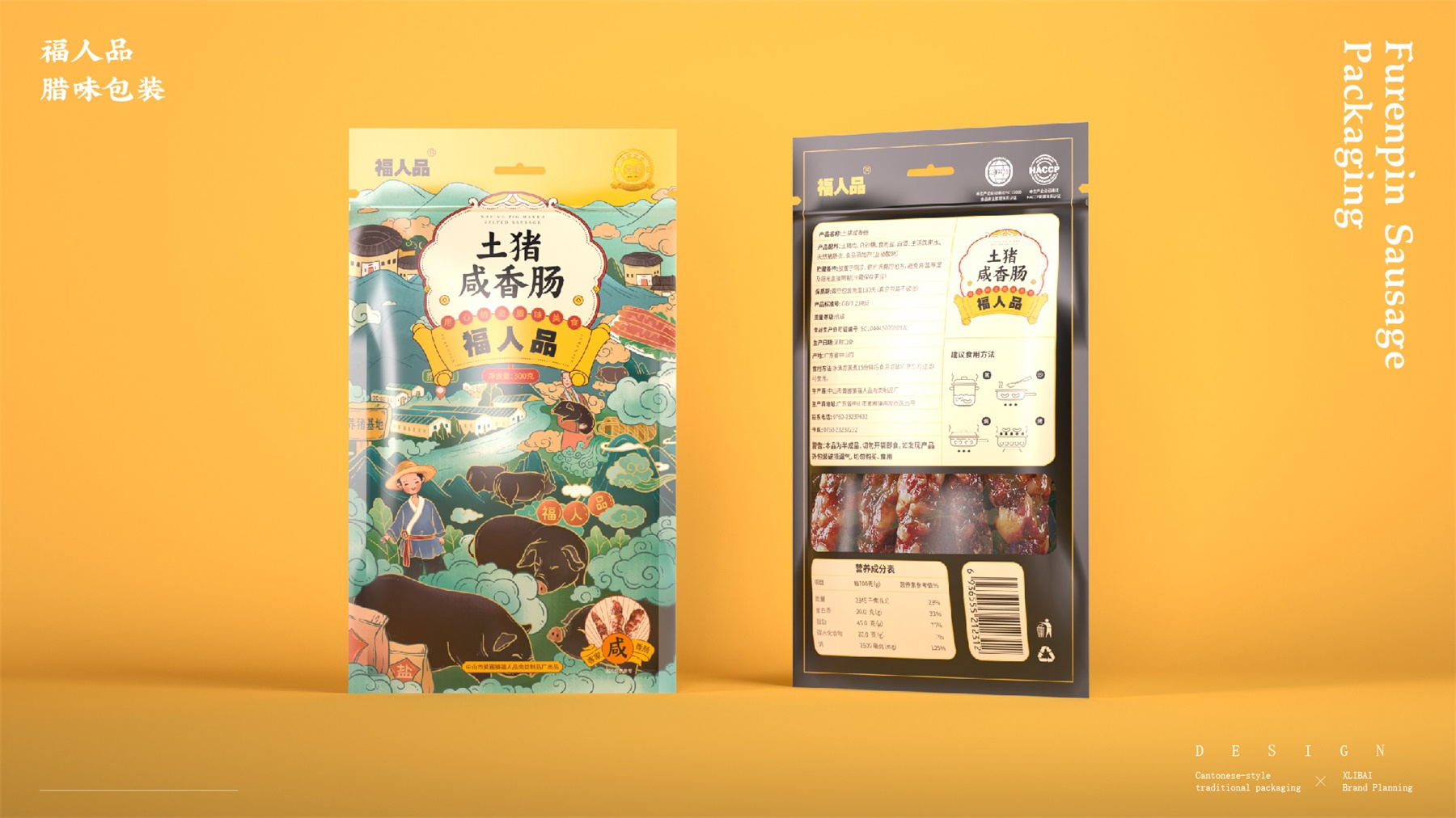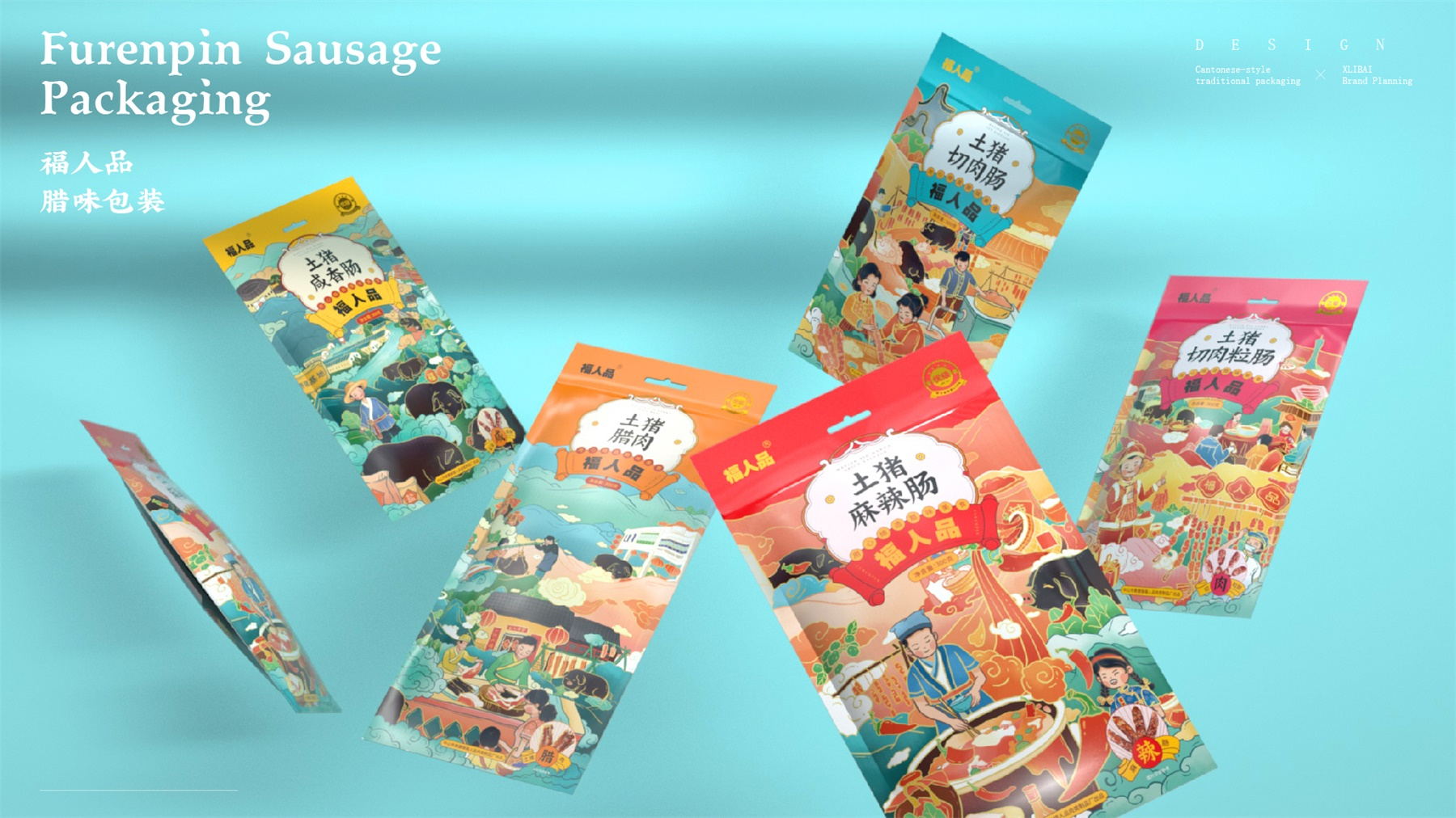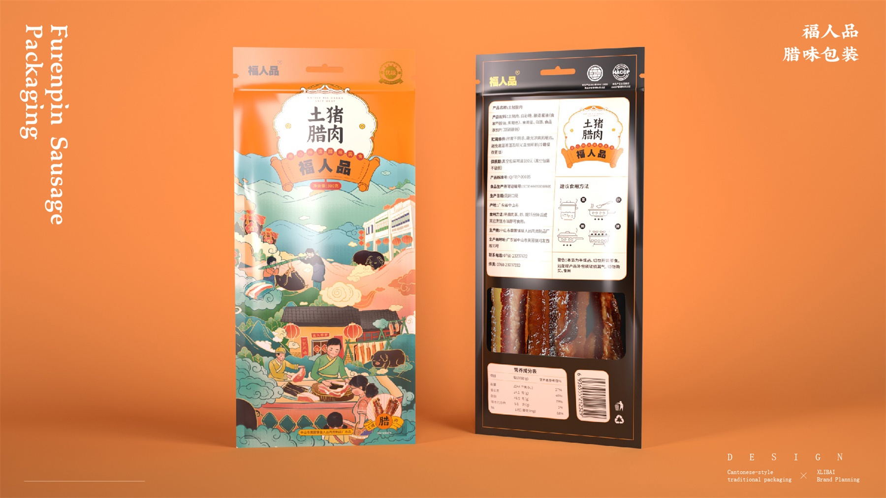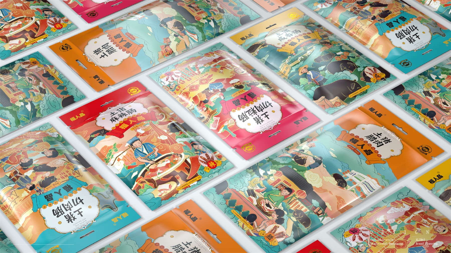 中山市黄圃镇福人品肉类制品厂来自中国食品工业示范基地中国腊味名镇——中山黄圃。主要生产腊味制品,制作工艺传承三代。目前市面上同类型的线下渠道腊味包装,多保持了传统的韵味,福人品的产品如想脱颖而出,就要在产品包装上进行升级。产品包装需要符合消费者对经典产品的印象,又要满足审美升级的需求。小李白设计师对于福人品的产品包装设计,是在传统韵味上采取更年轻的配色寻求差异化。将福人品古法手工的文化基因与消费者对腊味的美好寄托利用插画的形式铺开,徐徐道来。利用蒙太奇的手法穿插腊肠制作工艺、家庭食用场景及时间排序的广式建筑,打造一个热烈温馨的氛围。