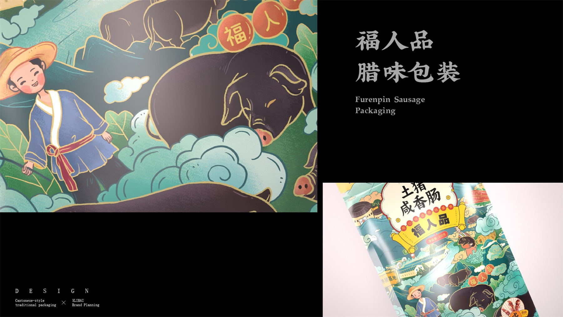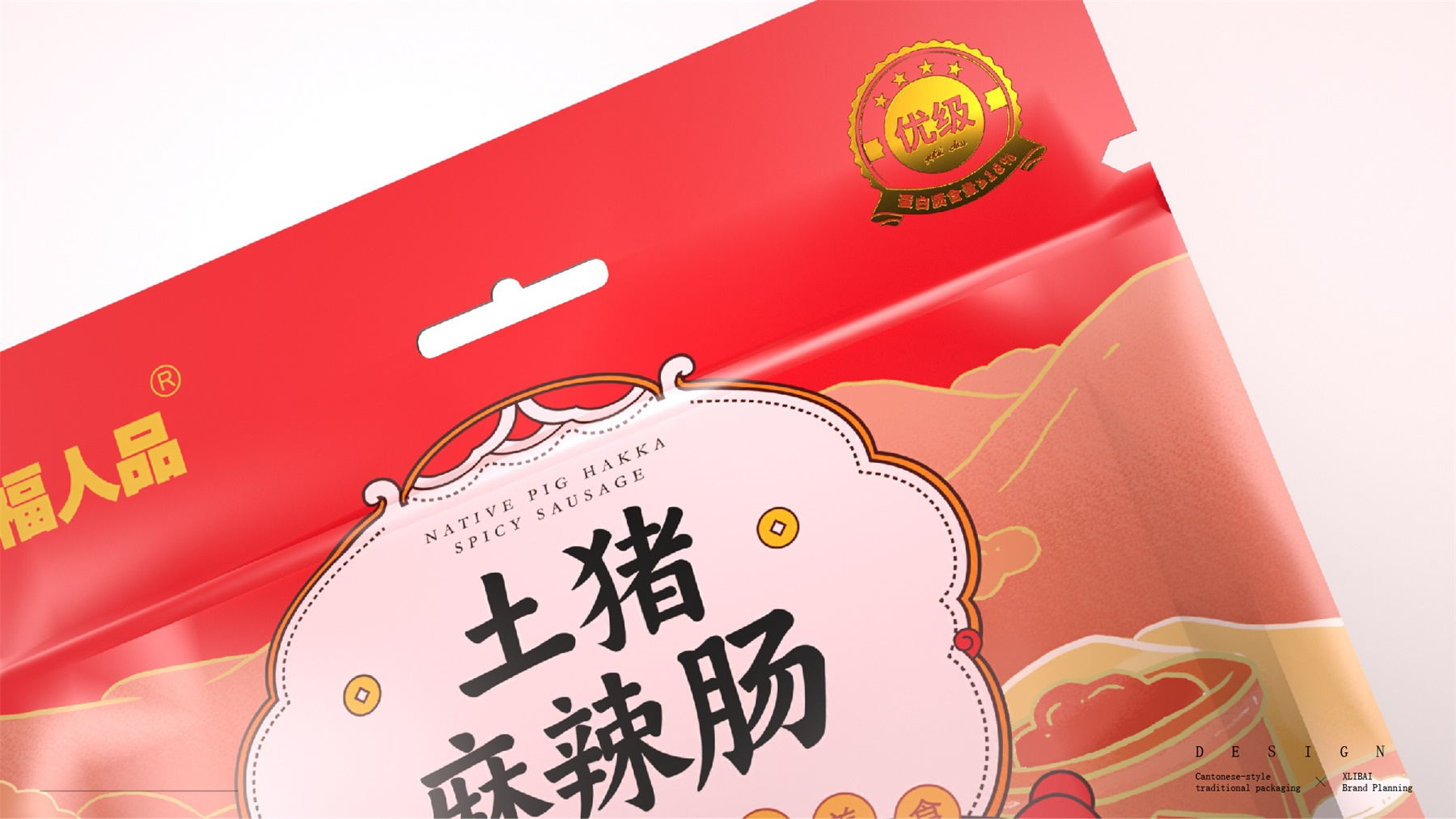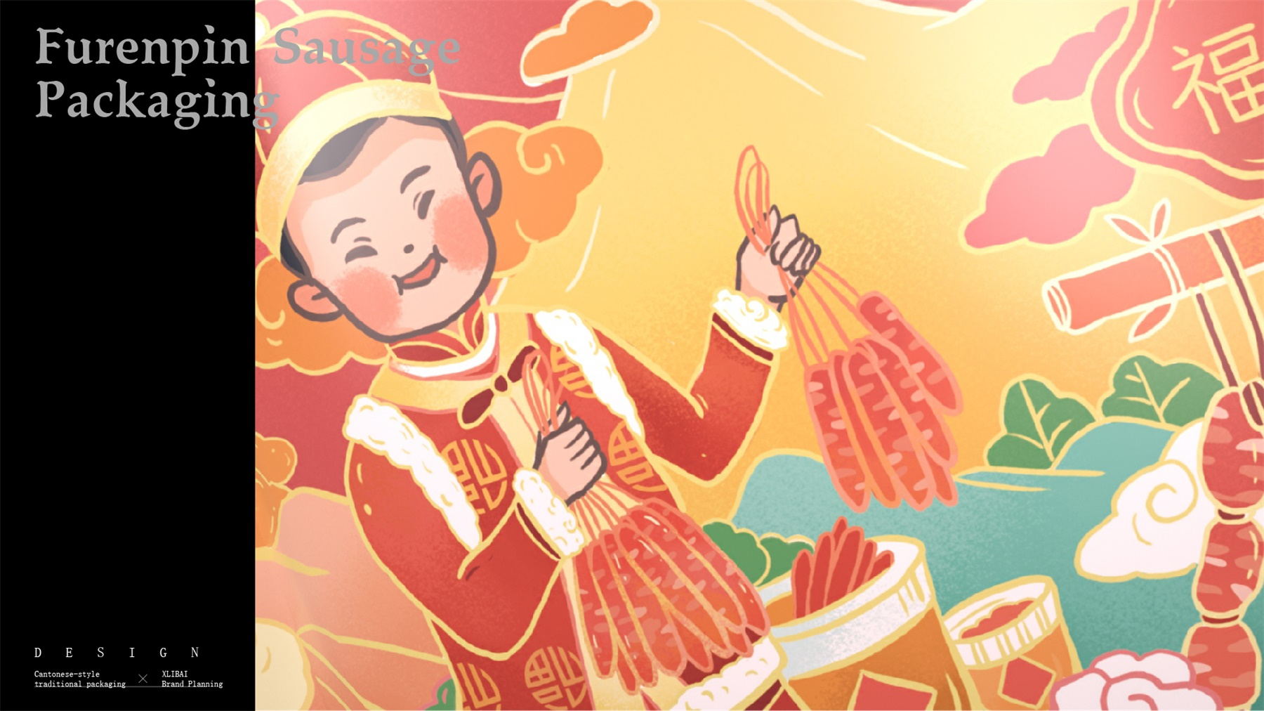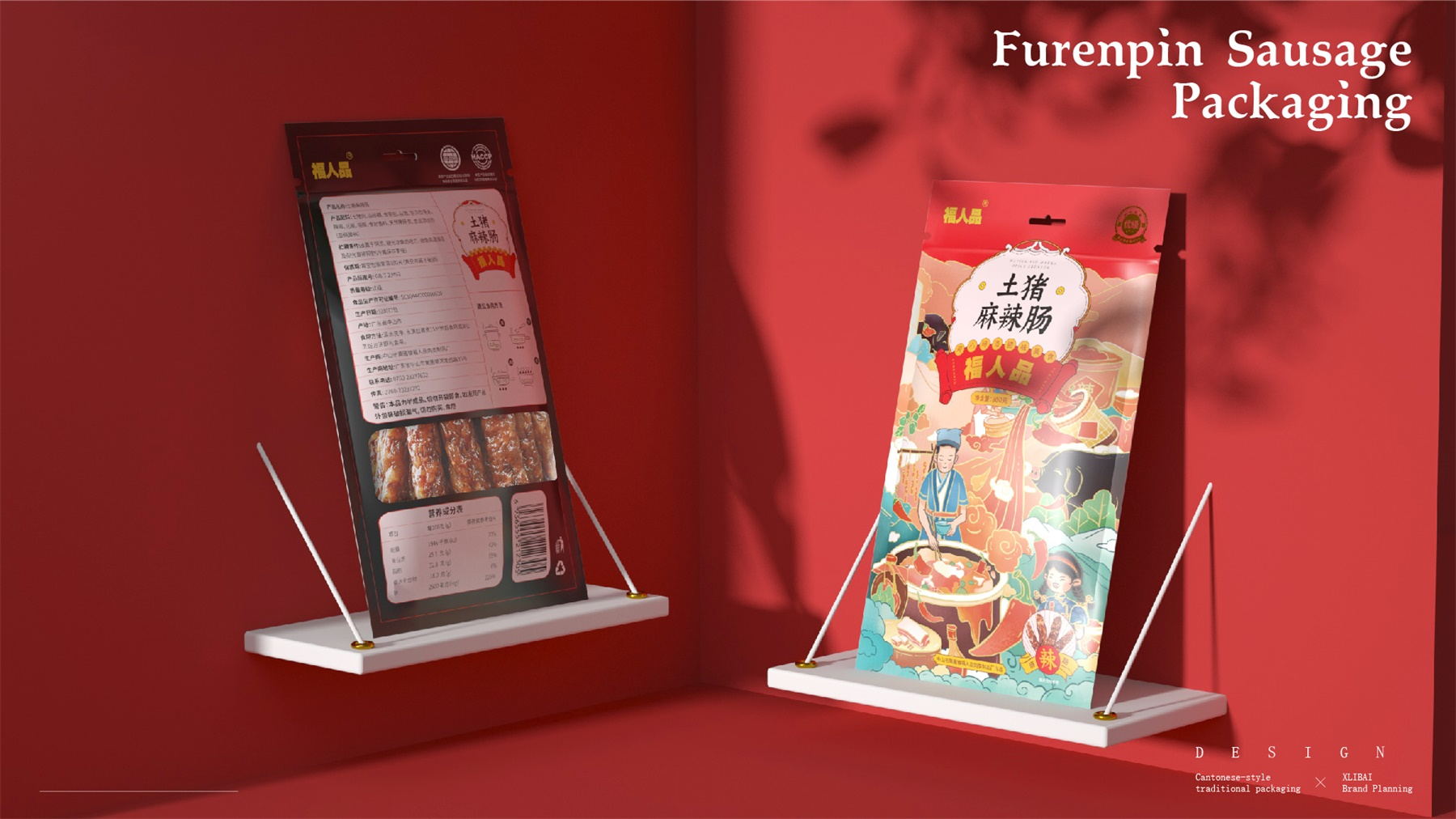 中山市黄圃镇福人品肉类制品厂来自中国食品工业示范基地中国腊味名镇——中山黄圃。主要生产腊味制品,制作工艺传承三代。目前市面上同类型的线下渠道腊味包装,多保持了传统的韵味,福人品的产品如想脱颖而出,就要在产品包装上进行升级。产品包装需要符合消费者对经典产品的印象,又要满足审美升级的需求。小李白设计师对于福人品的产品包装设计,是在传统韵味上采取更年轻的配色寻求差异化。将福人品古法手工的文化基因与消费者对腊味的美好寄托利用插画的形式铺开,徐徐道来。利用蒙太奇的手法穿插腊肠制作工艺、家庭食用场景及时间排序的广式建筑,打造一个热烈温馨的氛围。