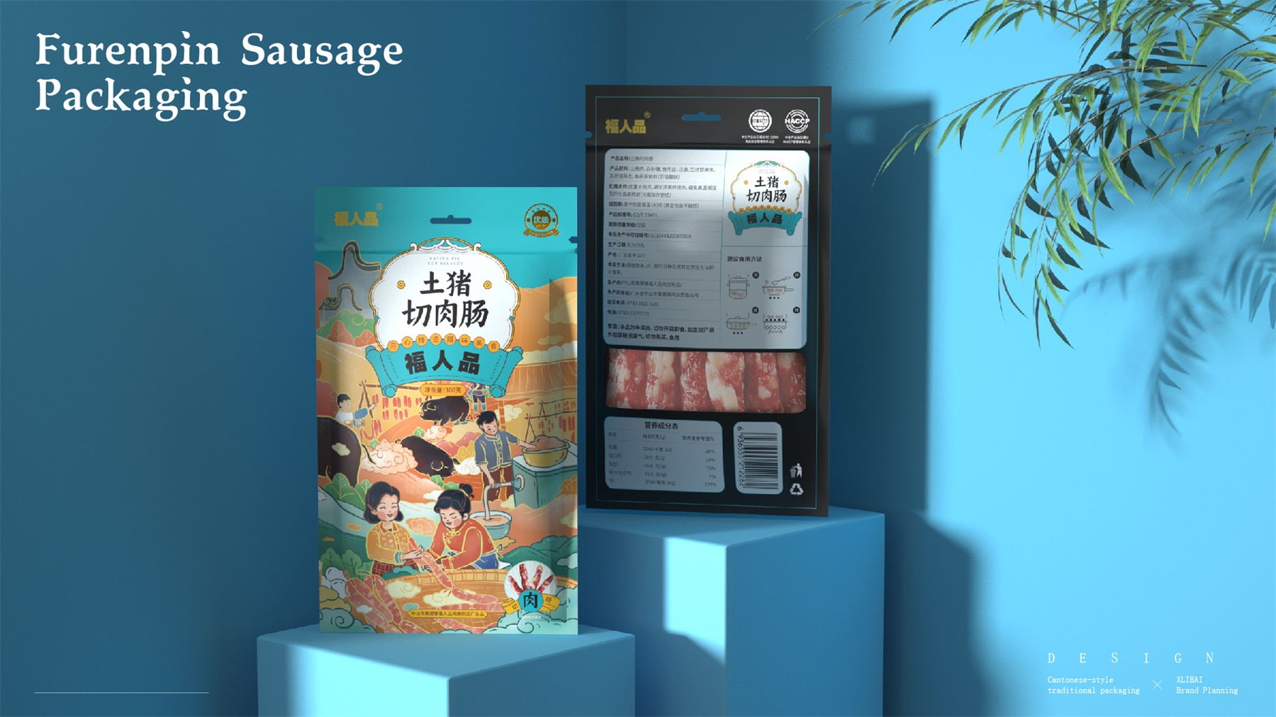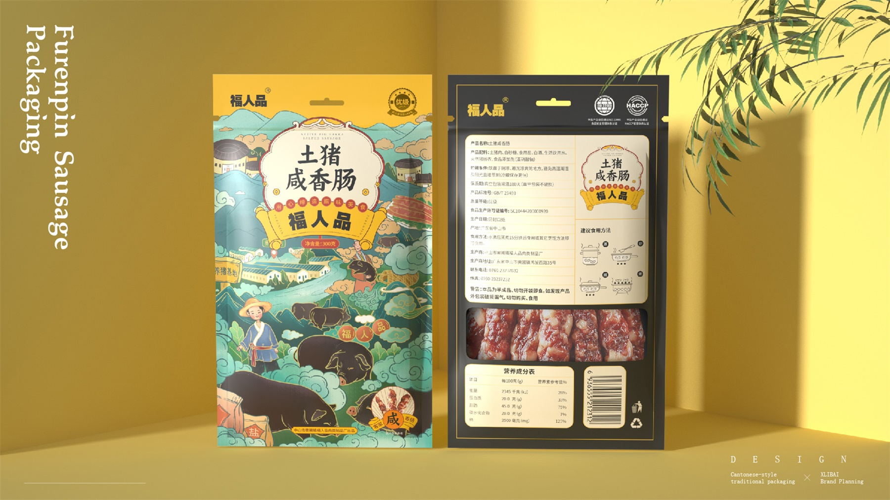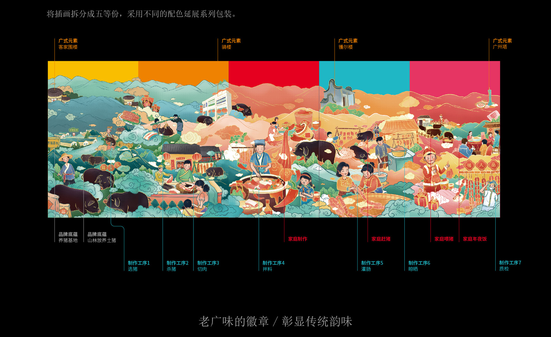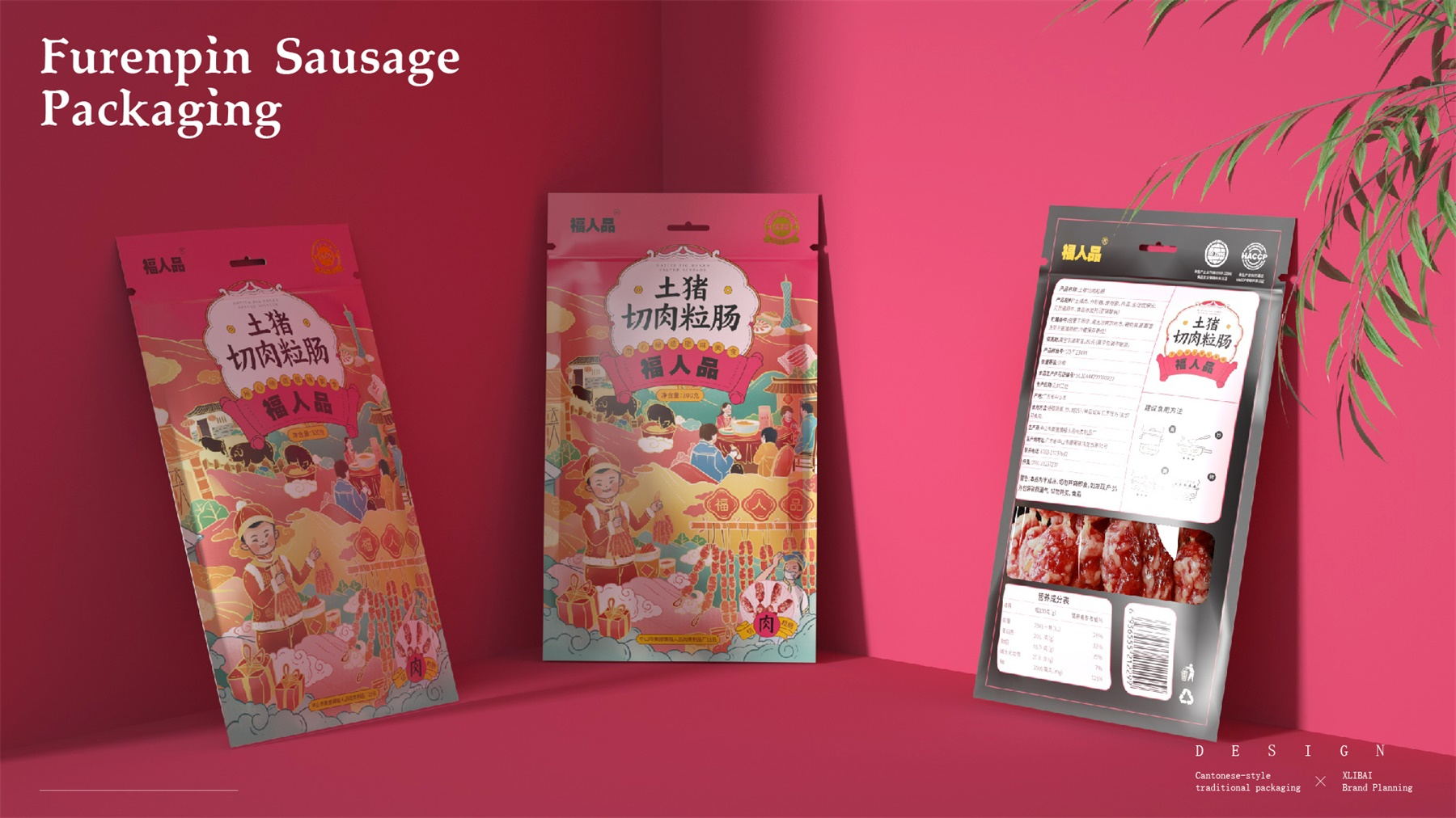 中山市黄圃镇福人品肉类制品厂来自中国食品工业示范基地中国腊味名镇——中山黄圃。主要生产腊味制品,制作工艺传承三代。目前市面上同类型的线下渠道腊味包装,多保持了传统的韵味,福人品的产品如想脱颖而出,就要在产品包装上进行升级。产品包装需要符合消费者对经典产品的印象,又要满足审美升级的需求。小李白设计师对于福人品的产品包装设计,是在传统韵味上采取更年轻的配色寻求差异化。将福人品古法手工的文化基因与消费者对腊味的美好寄托利用插画的形式铺开,徐徐道来。利用蒙太奇的手法穿插腊肠制作工艺、家庭食用场景及时间排序的广式建筑,打造一个热烈温馨的氛围。