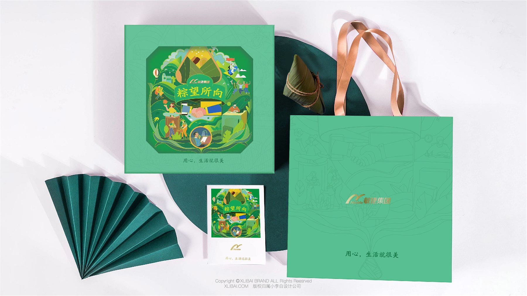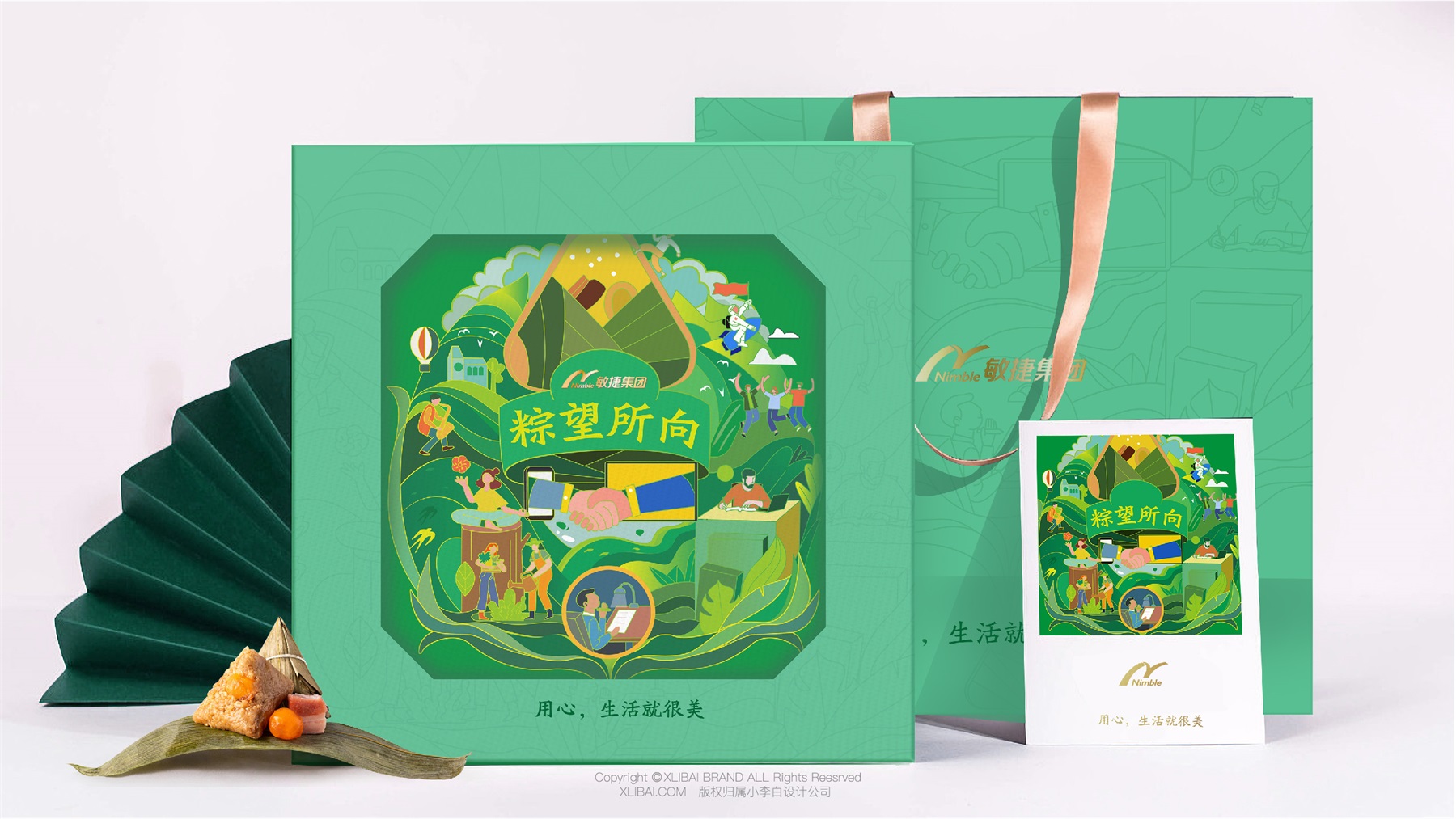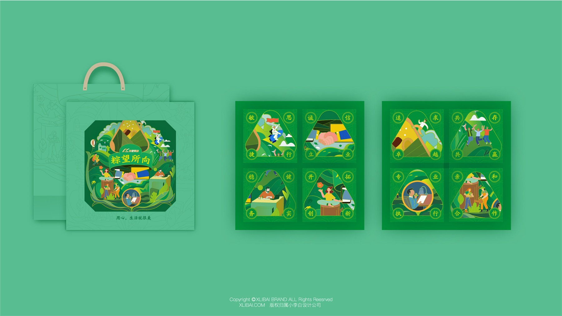 敏捷集团创立于1993年,1998年正式进入民生住宅开发领域,历经20余年的稳健发展,现已成为一家涵盖民生地产、建筑工程、生活服务、城市更新、酒店及商业运营、文旅开发、教育等多元化业务的全国知名综合性企业集团。这次合作的粽子礼盒,是敏捷集团为员工定制的端午节礼盒。我们在设计上,采用手绘图案的设计,丰富视觉语言,使视觉更具吸引力。用传统的“粽叶绿”表达粽子的传统美味,也凸显了天然的味道又绿色环保。此款粽子礼盒包装设计,使美味变得温暖而深刻。