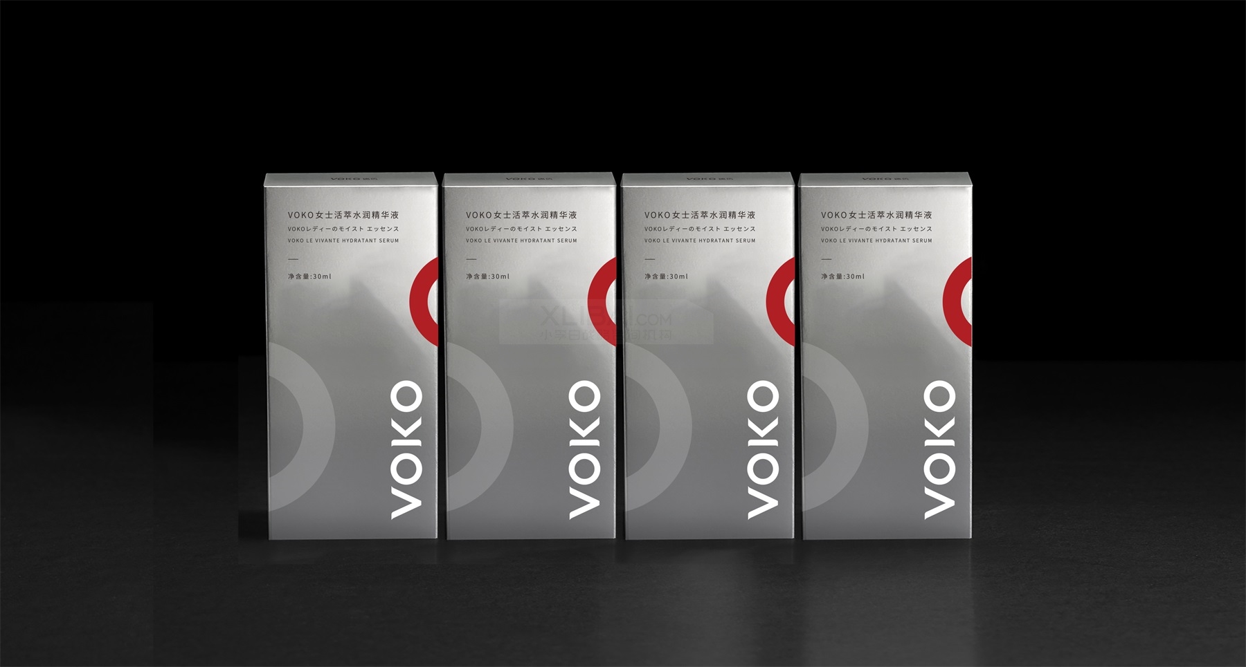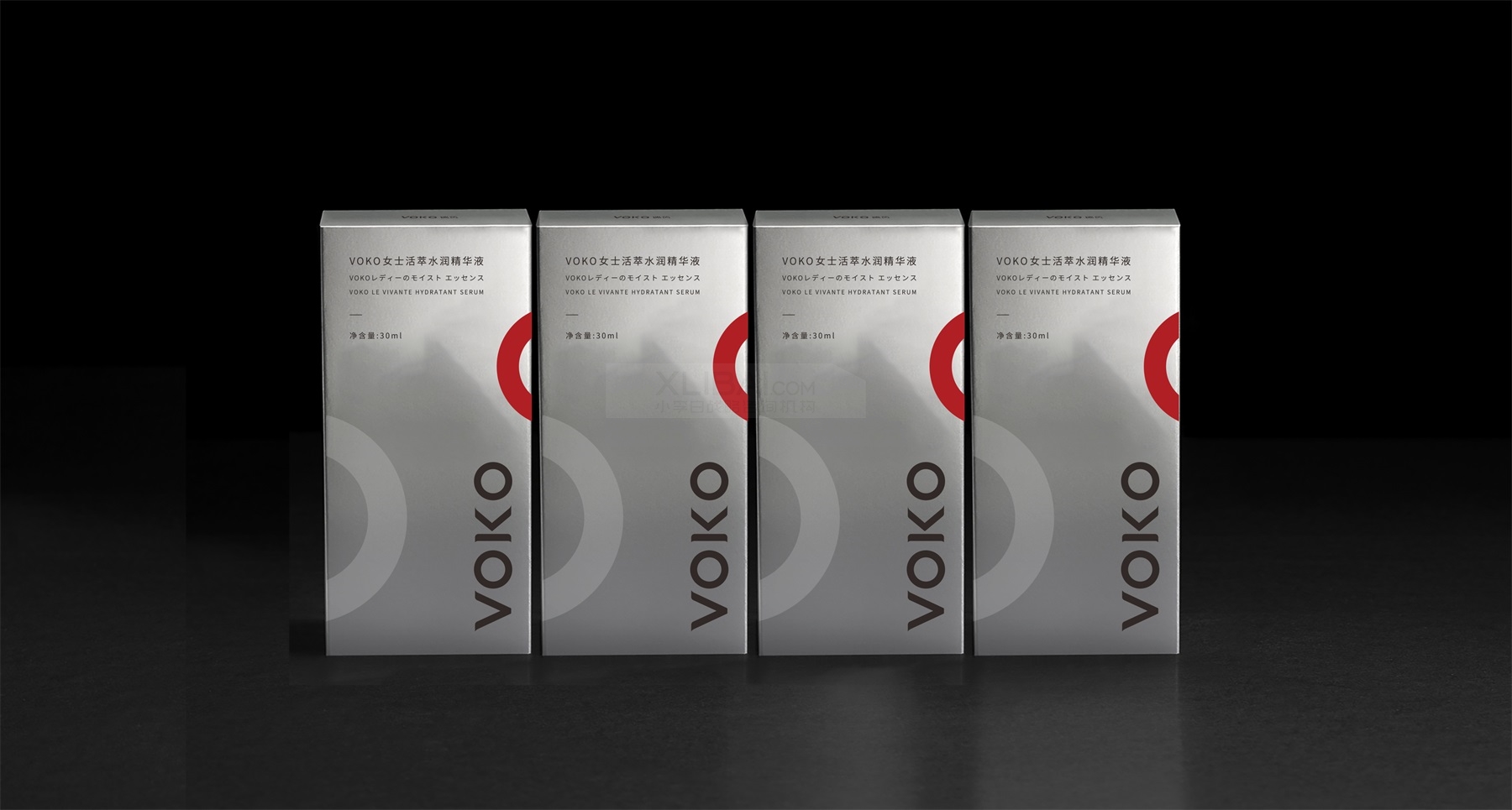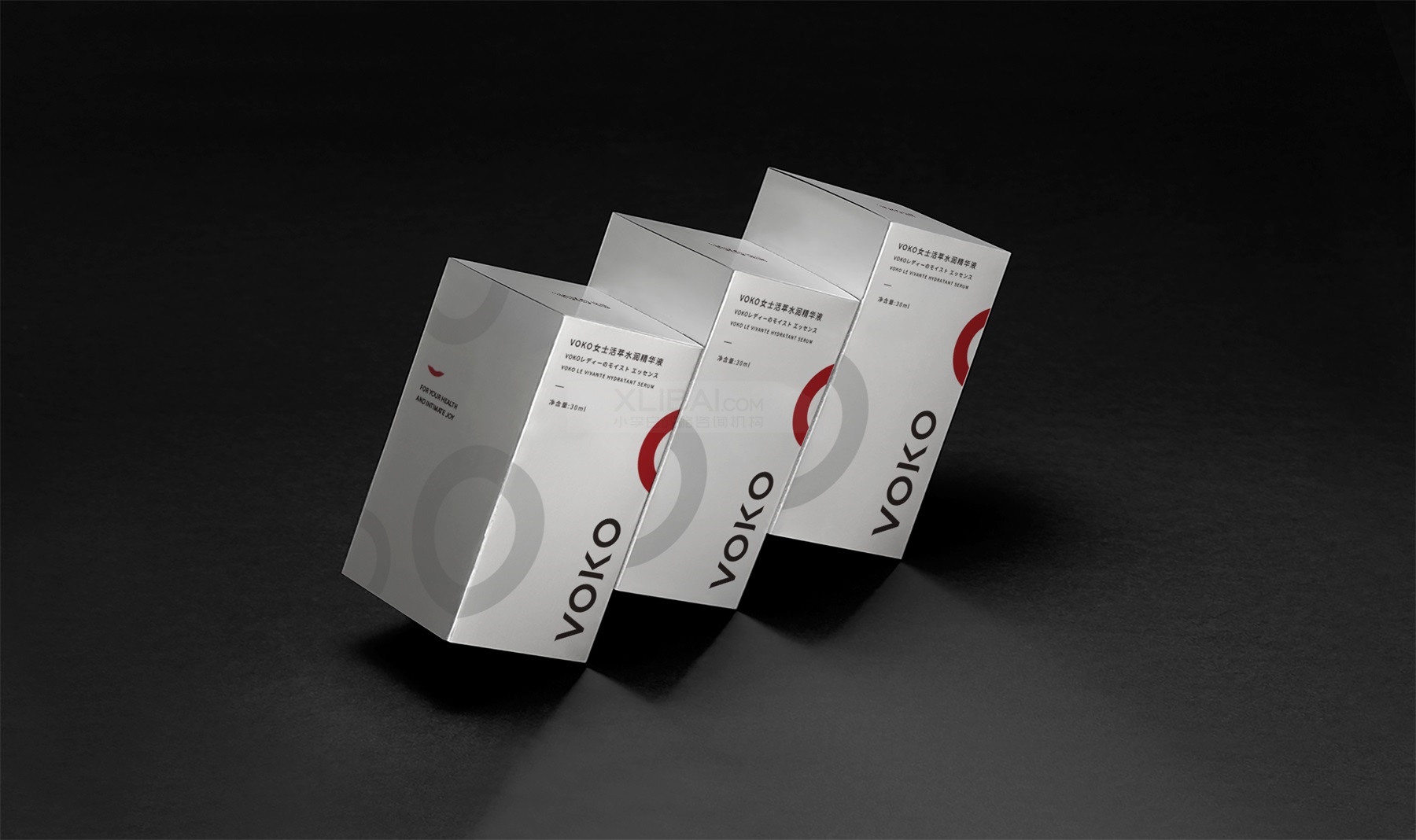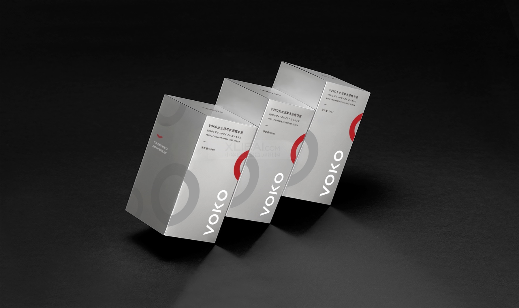 在为瑞茵VOKO这款女士精华液的产品包装设计上,小李白为外包装盒选定了亮银卡材质,正面由内容结合辅助图形组合而成,放大的LOGO使其在小包装上依然有很好的品牌印象与品牌自信感,红色的微笑符号强化品牌记忆点,分子圆直观表明产品功能。
