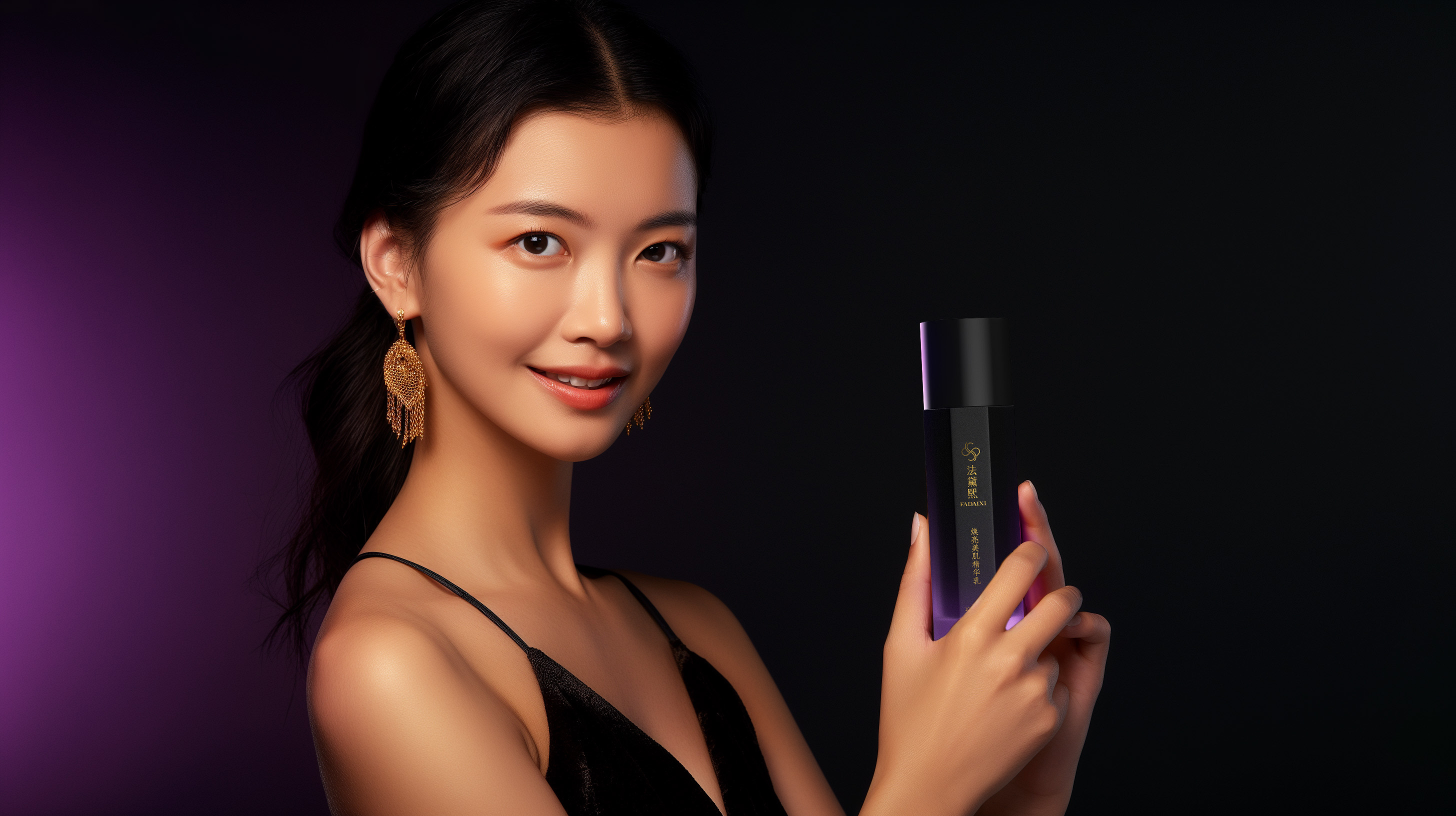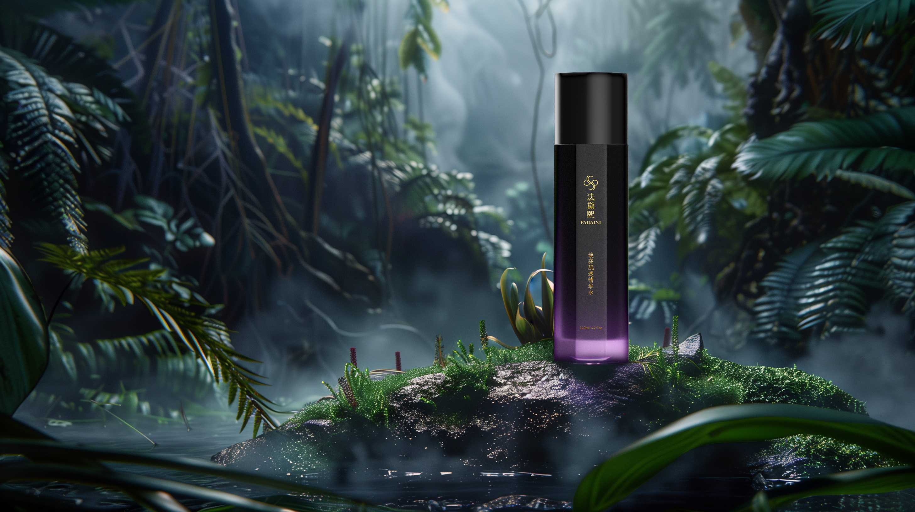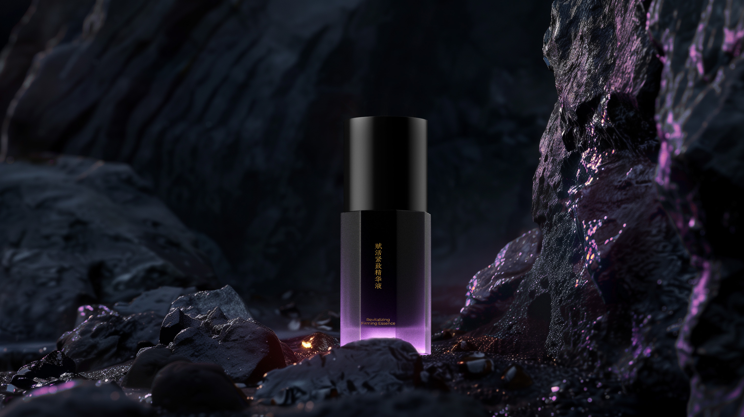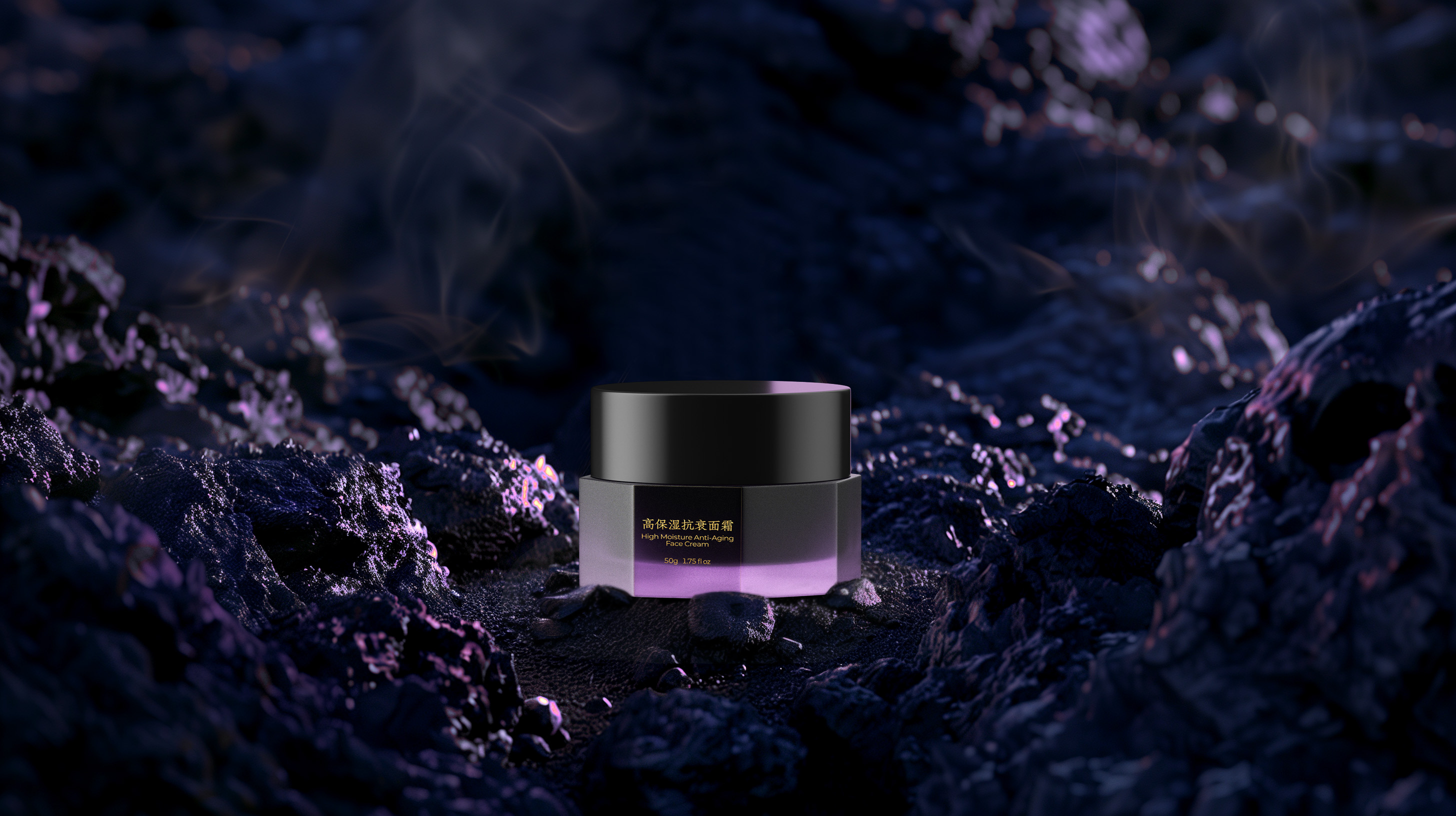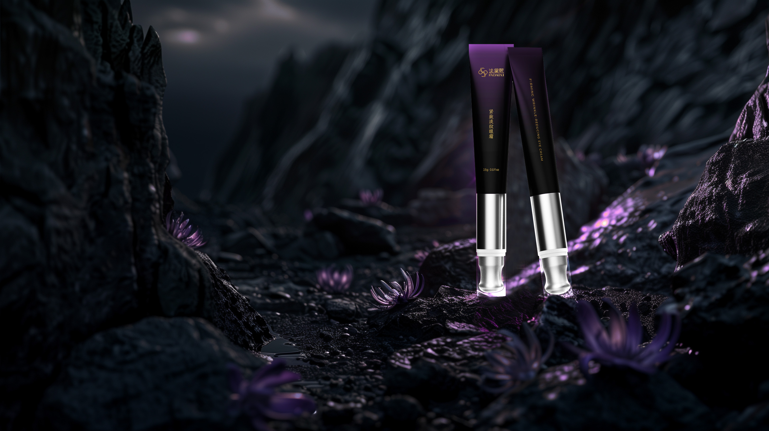 紫黑夜幕:如高保湿面霜、紧致眼霜,结合深邃背景传达修护、抗老、夜间使用的功能场景。