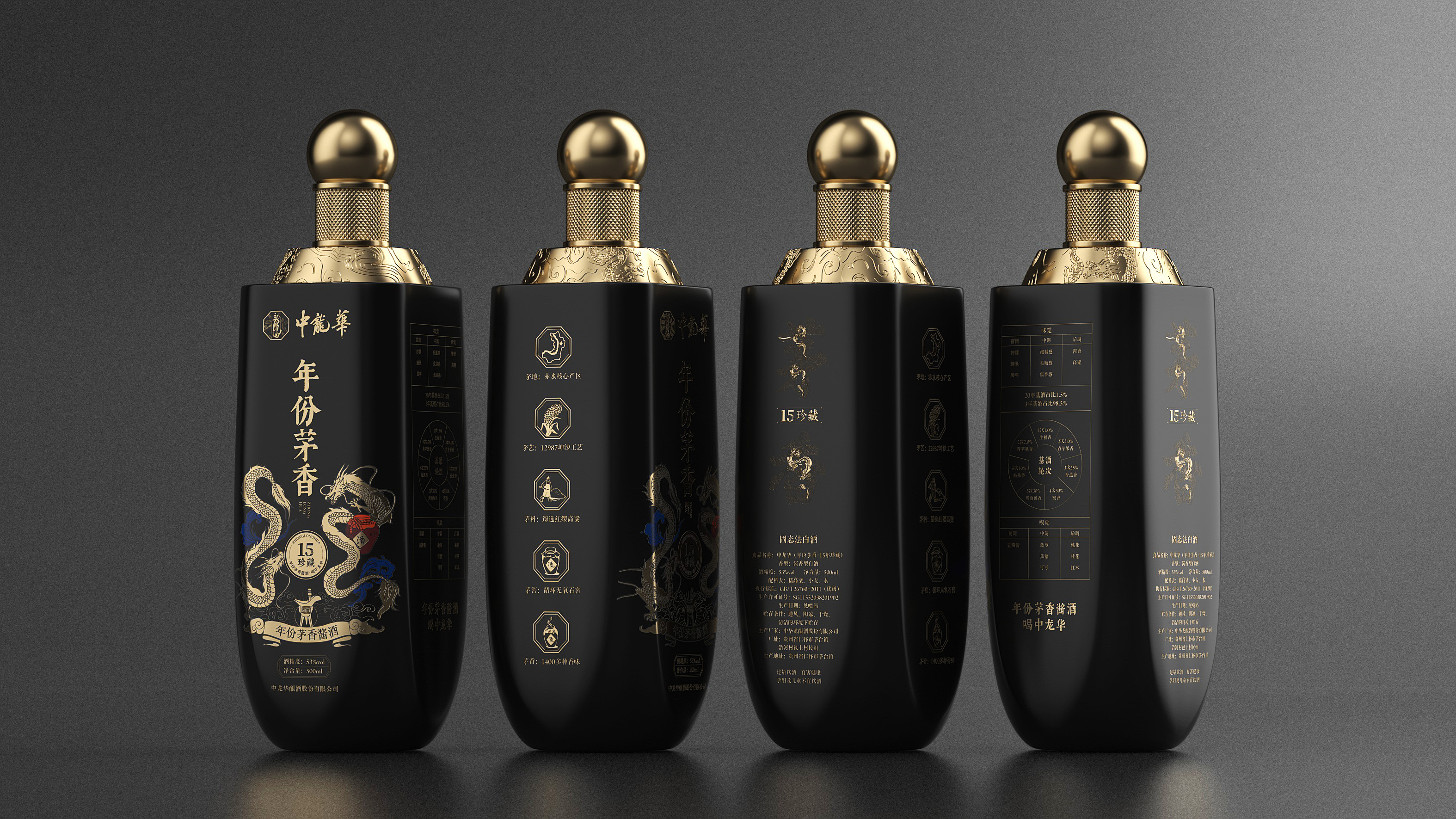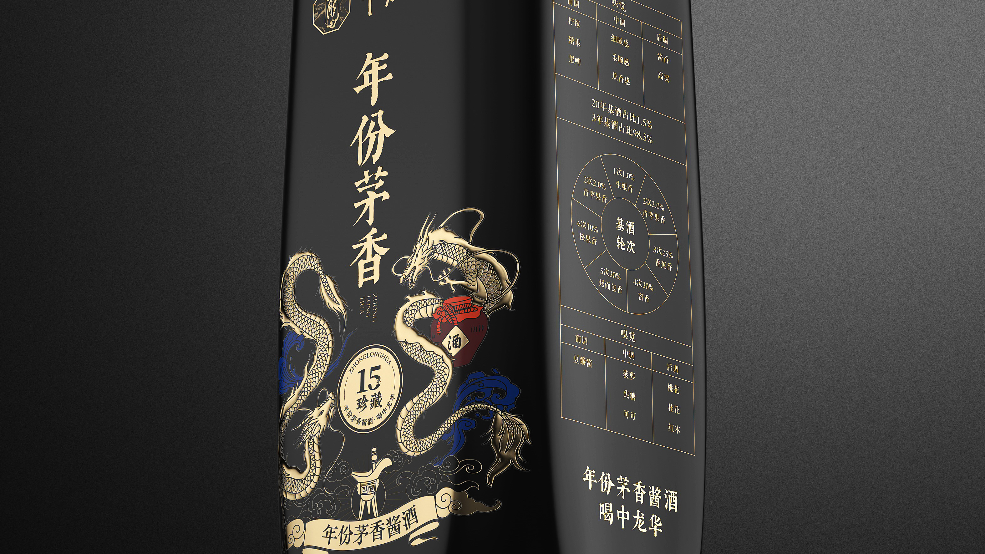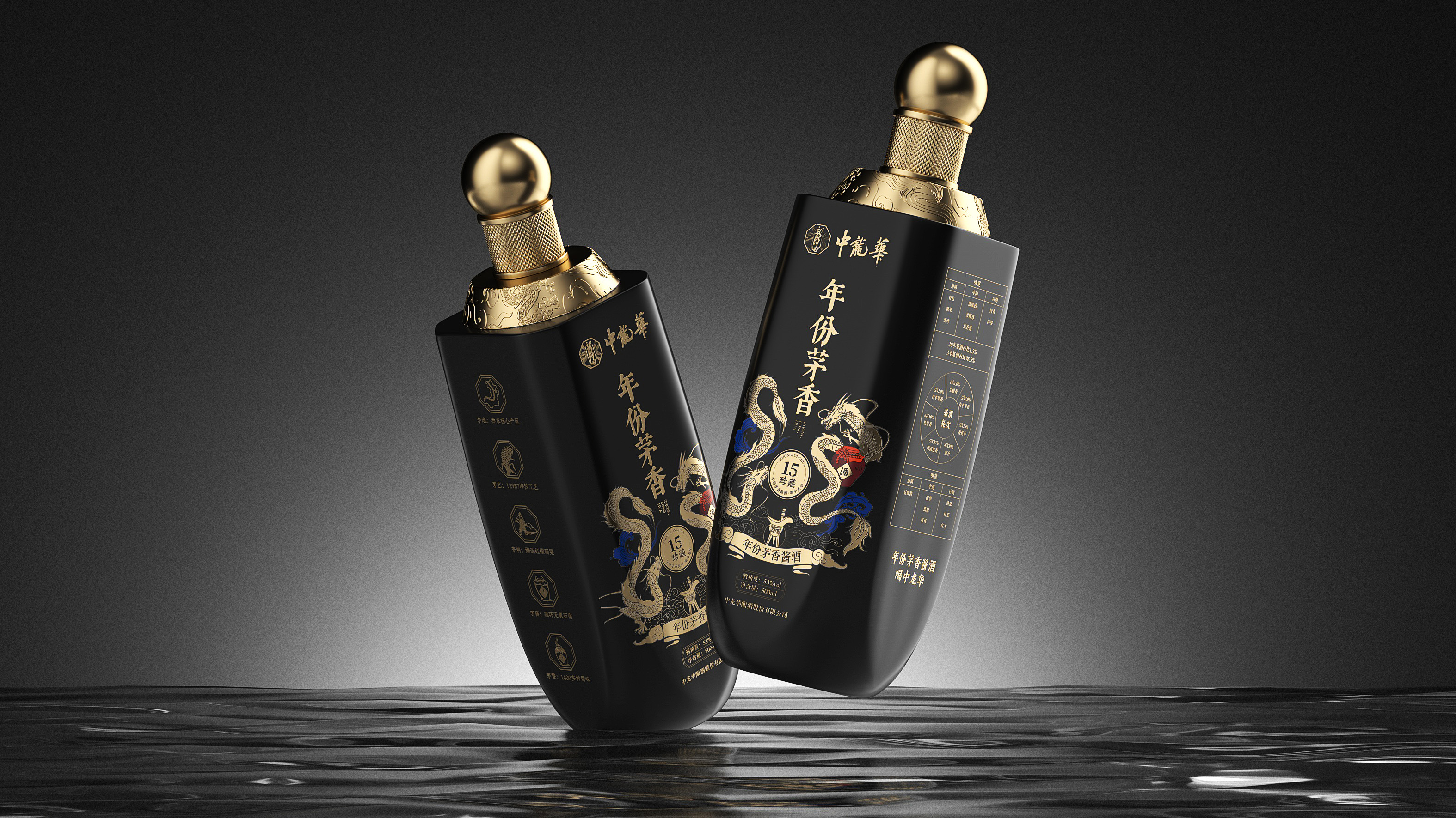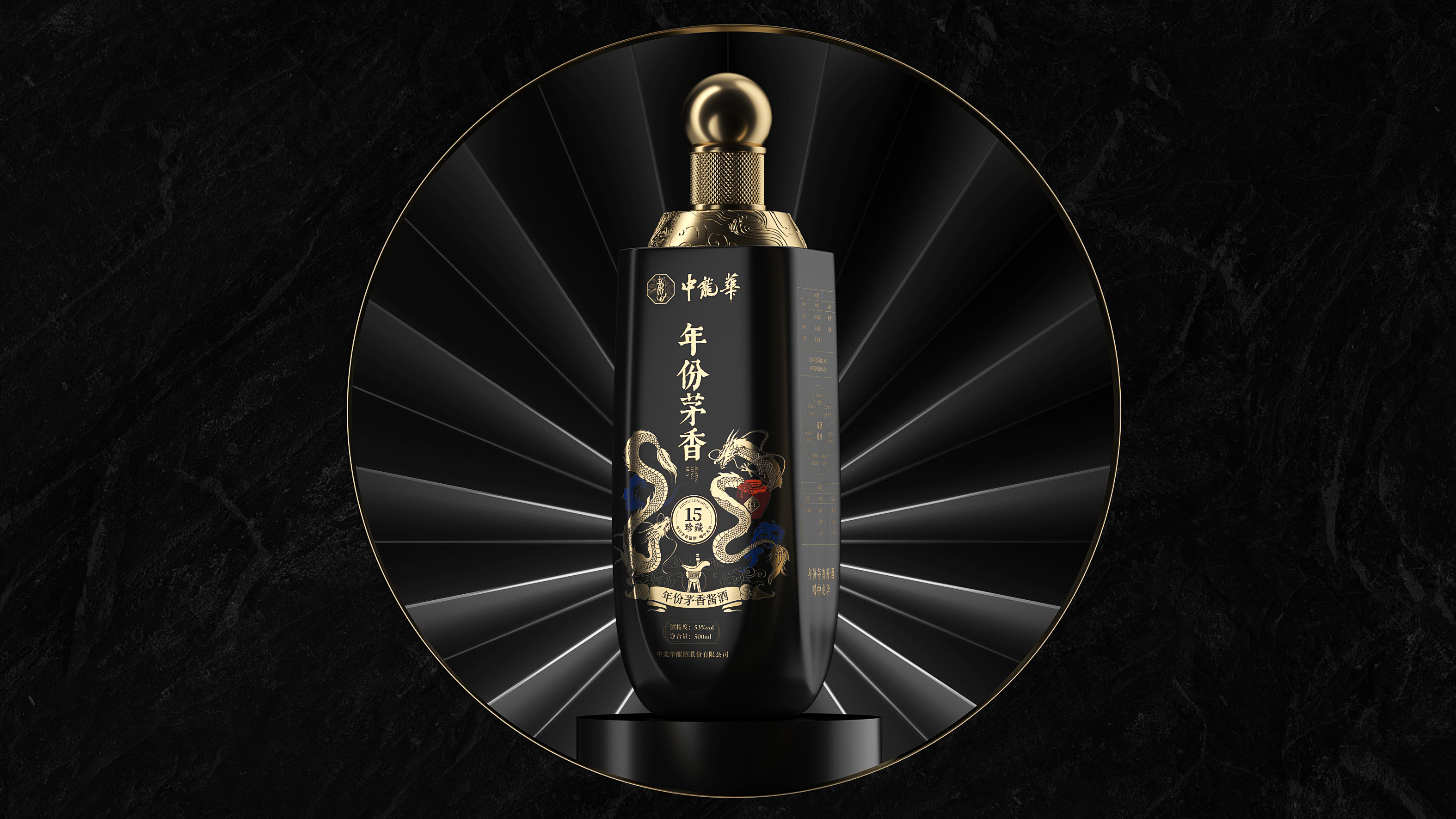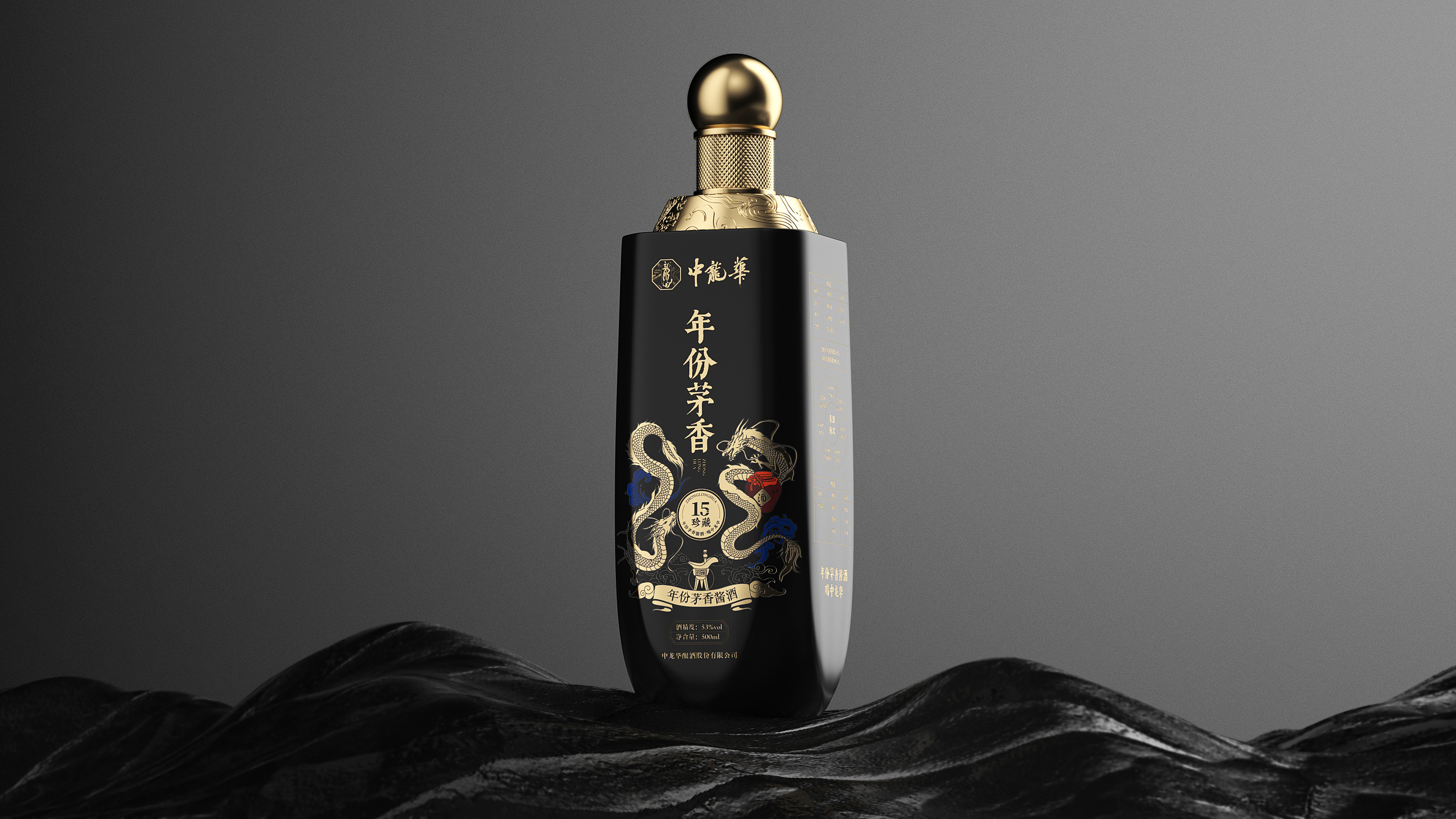 瓶体采用黑金配色,象征尊贵与沉稳,彰显十五年陈酿的醇厚底蕴。瓶身两侧金色双龙腾跃盘绕,寓意祥瑞与权威,亦呼应“龙”之品牌精神。瓶盖选用球形金属结构,搭配底座精雕祥云与龙纹,营造皇家印象,细节之处尽显匠心。