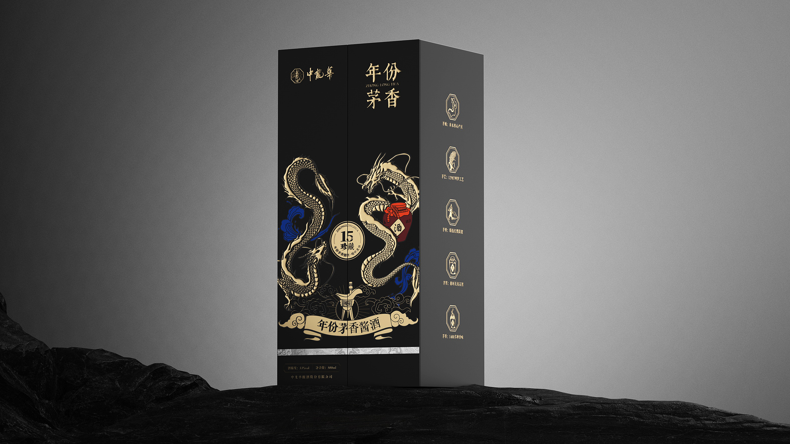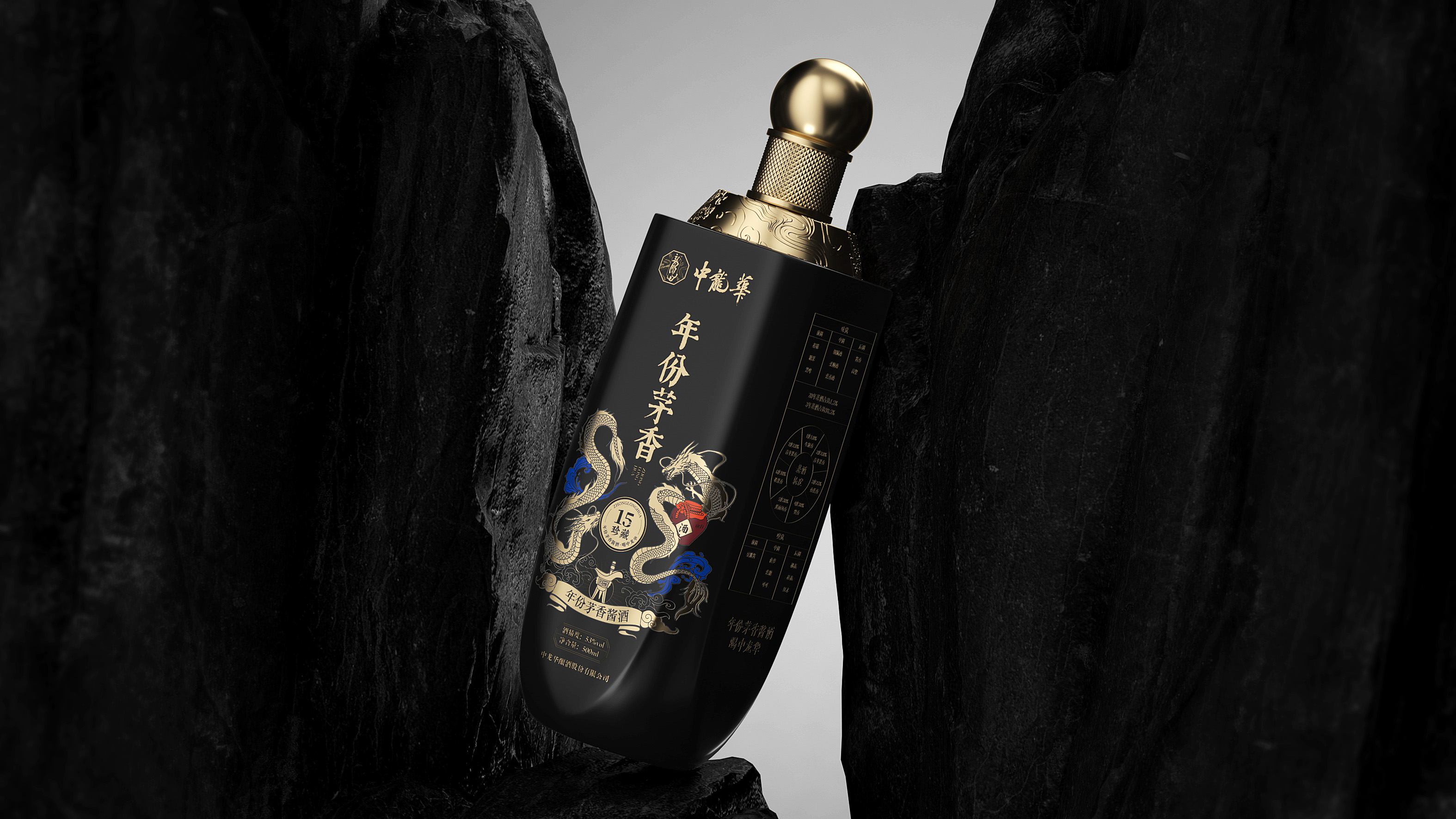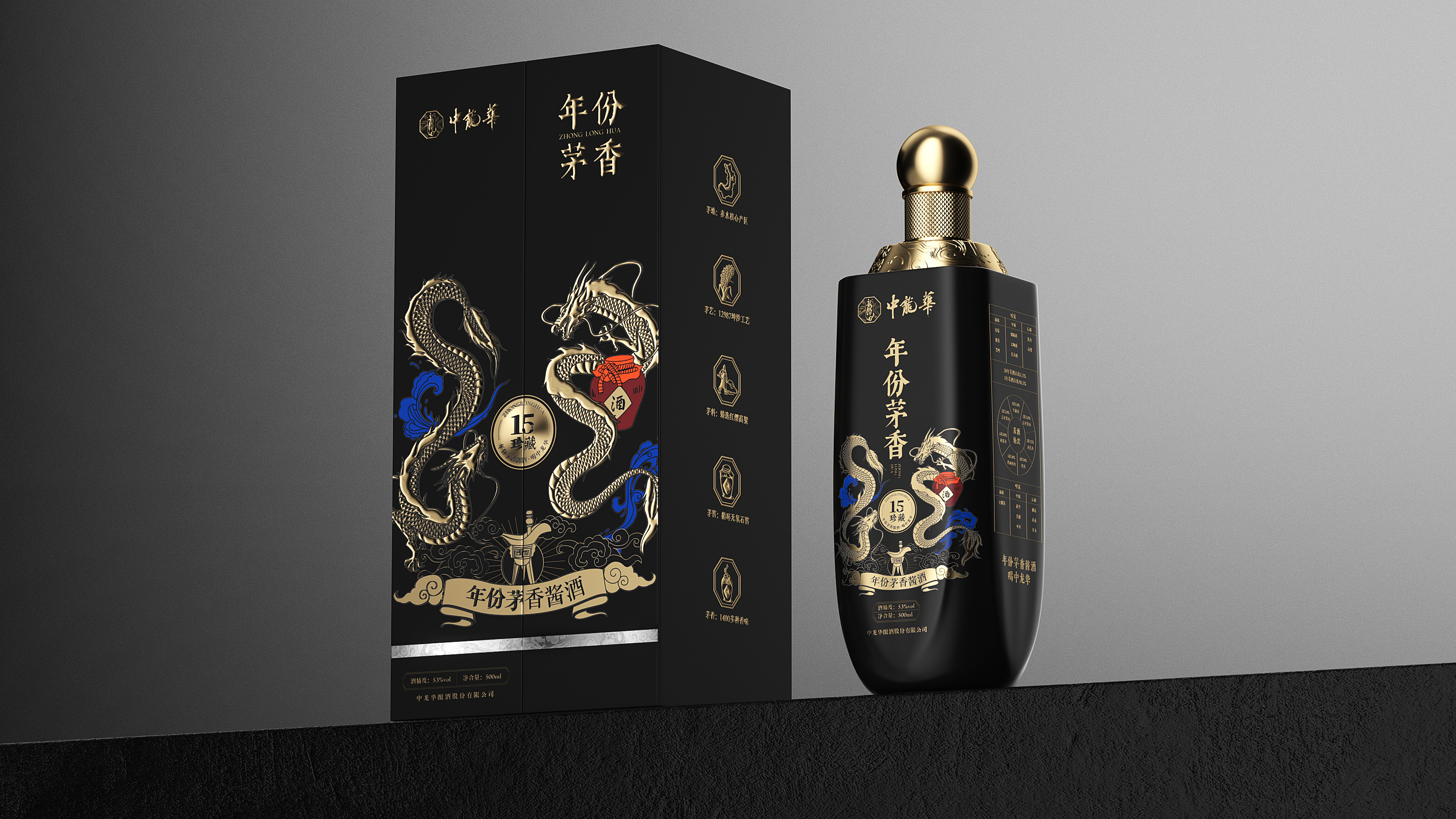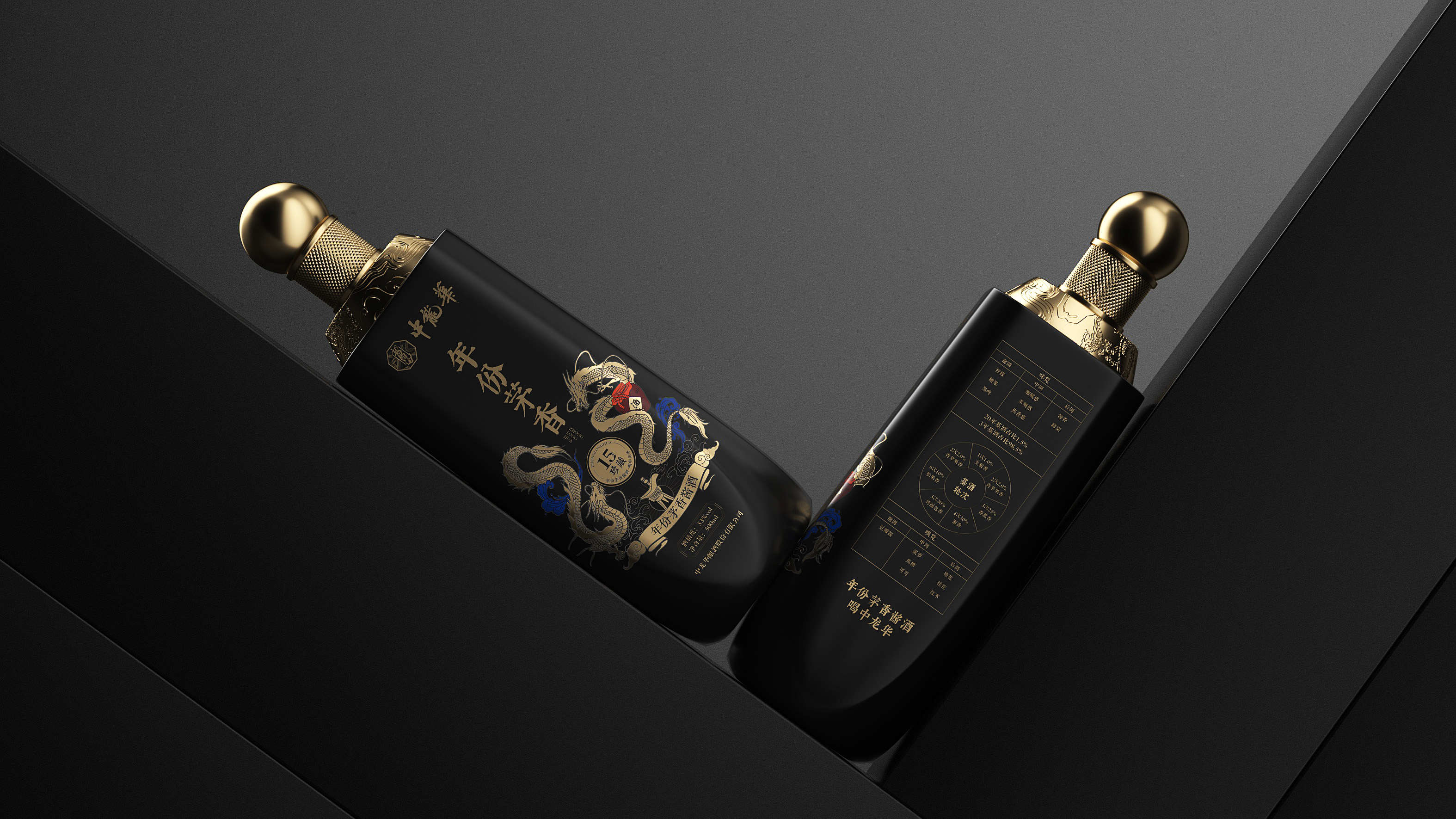 瓶体采用黑金配色,象征尊贵与沉稳,彰显十五年陈酿的醇厚底蕴。瓶身两侧金色双龙腾跃盘绕,寓意祥瑞与权威,亦呼应“龙”之品牌精神。瓶盖选用球形金属结构,搭配底座精雕祥云与龙纹,营造皇家印象,细节之处尽显匠心。