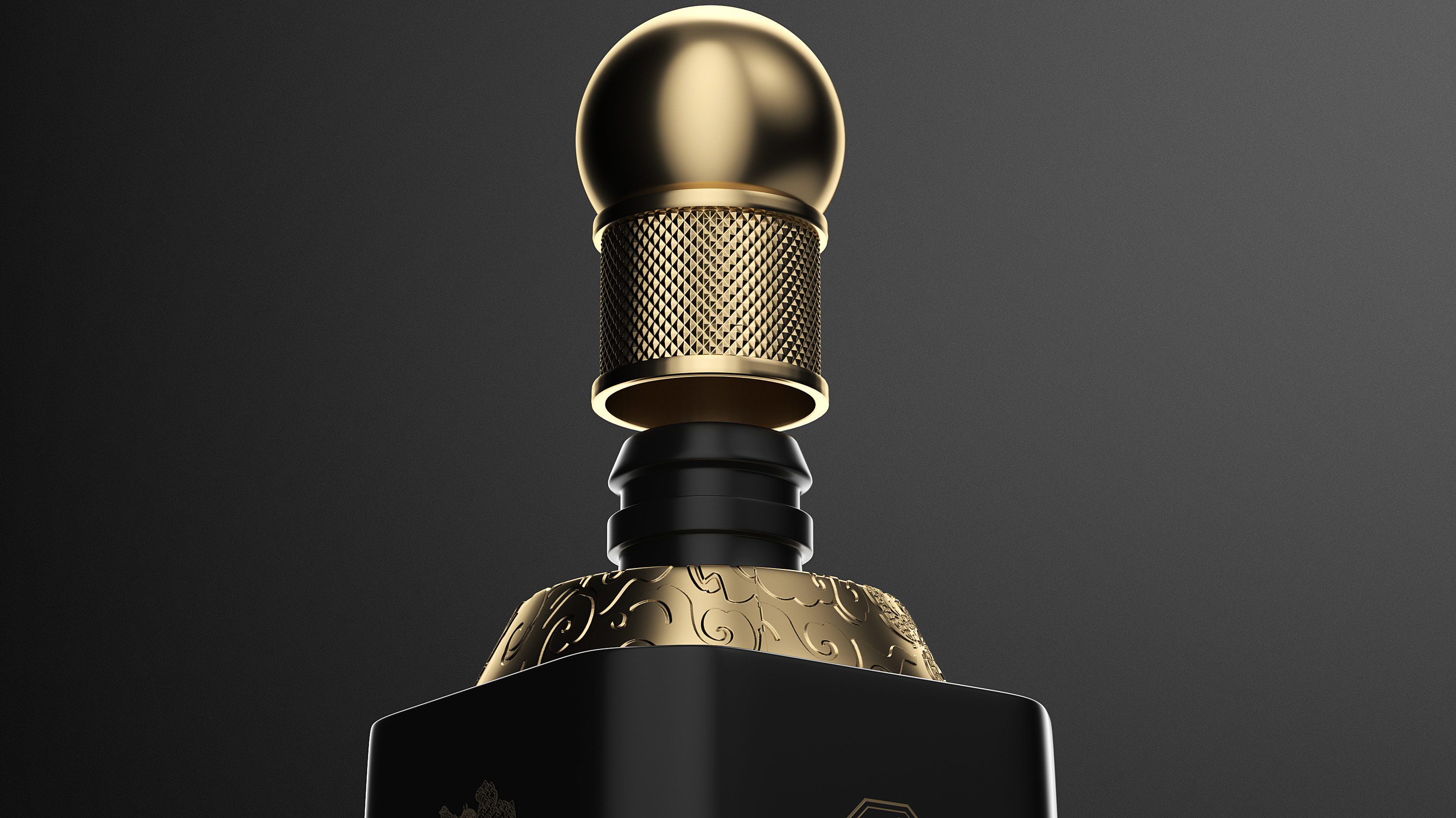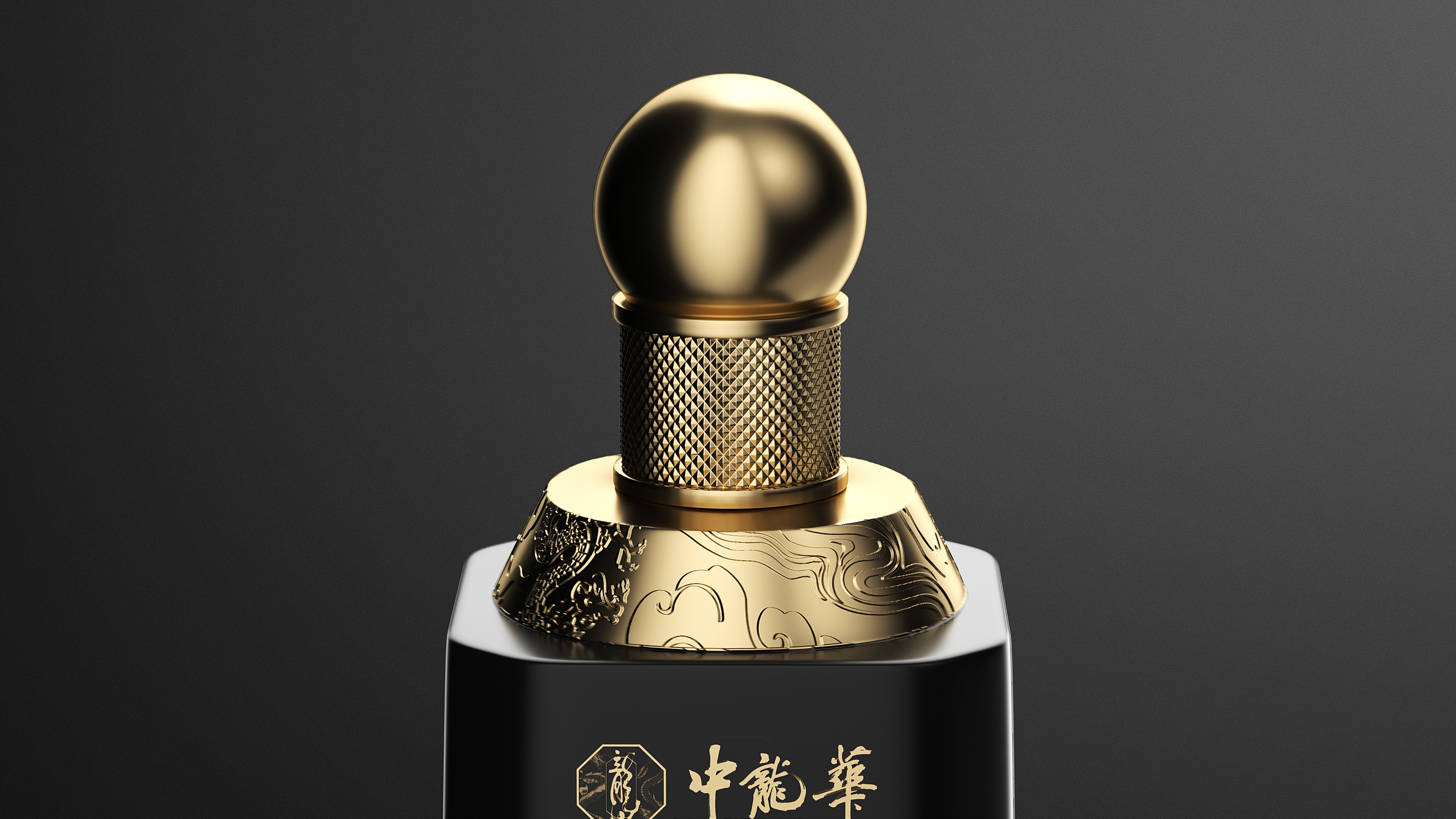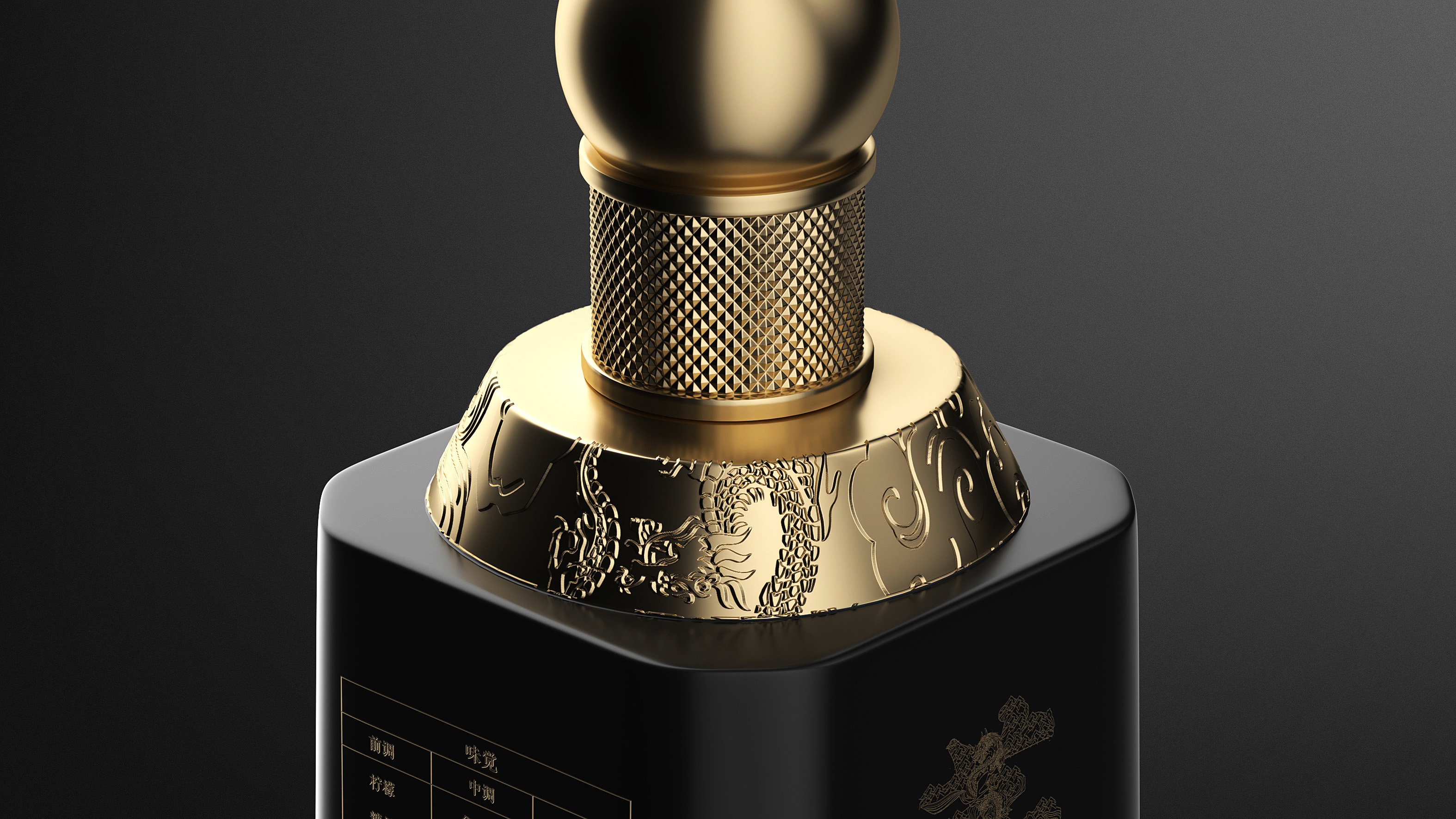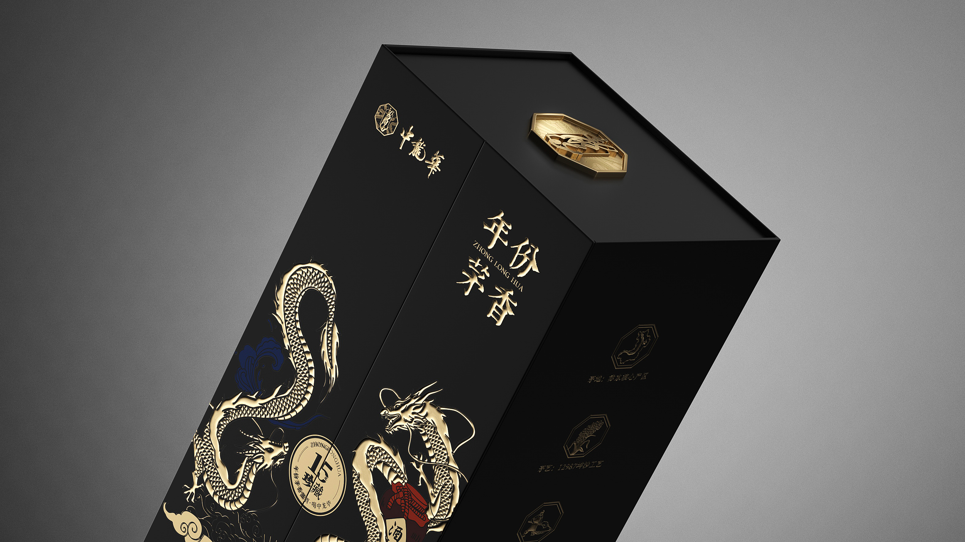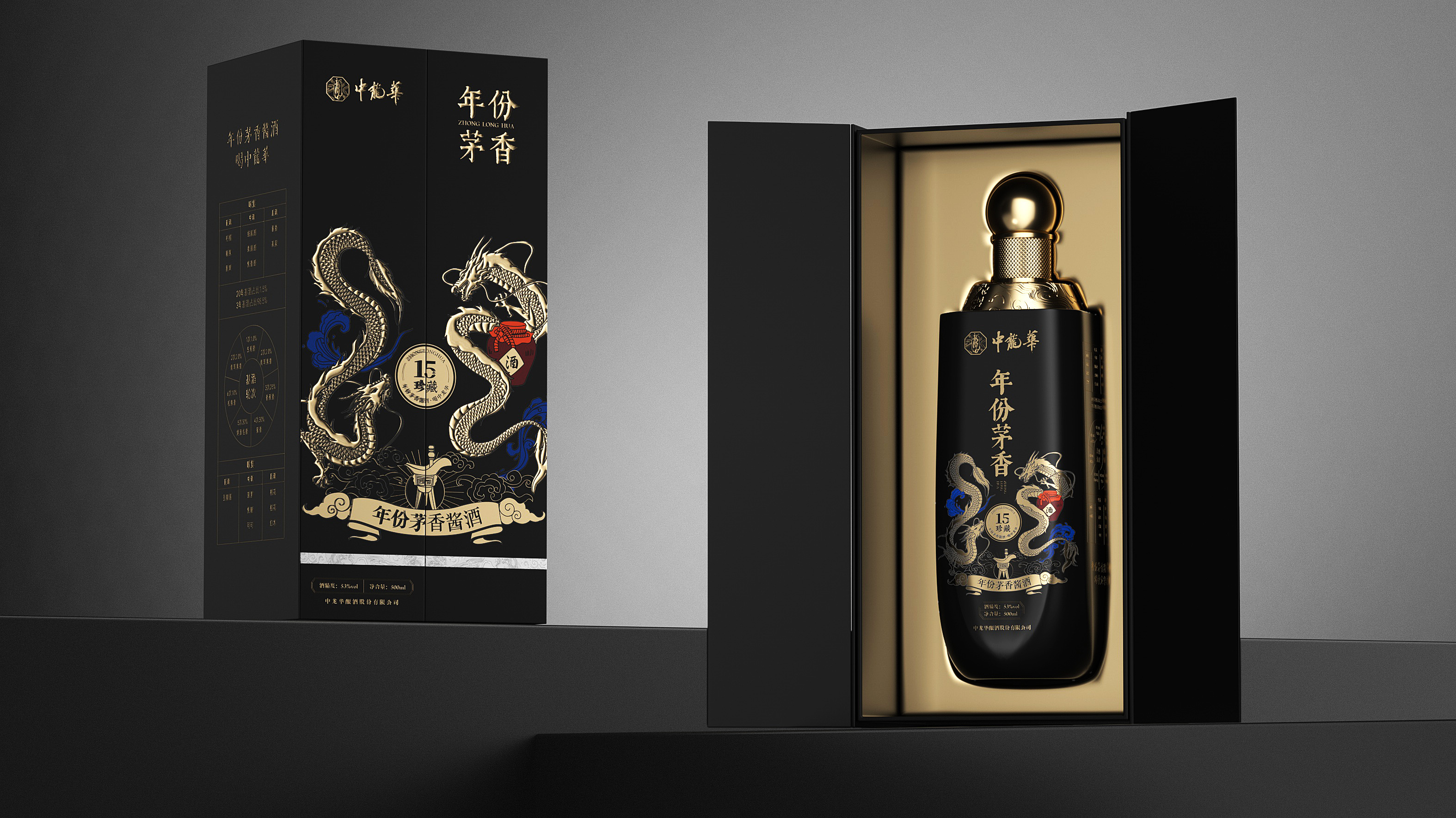 瓶体采用黑金配色,象征尊贵与沉稳,彰显十五年陈酿的醇厚底蕴。瓶身两侧金色双龙腾跃盘绕,寓意祥瑞与权威,亦呼应“龙”之品牌精神。瓶盖选用球形金属结构,搭配底座精雕祥云与龙纹,营造皇家印象,细节之处尽显匠心。