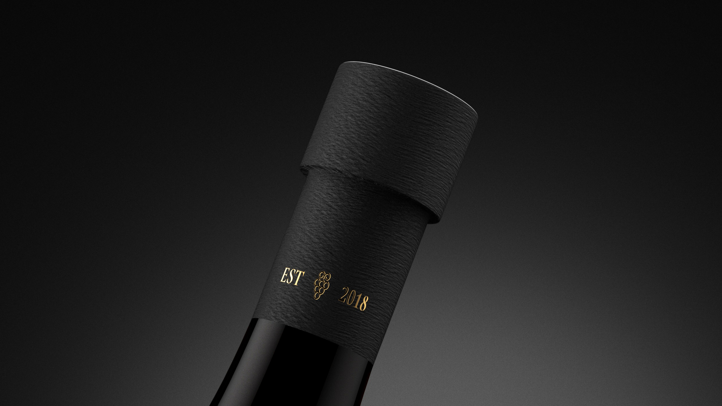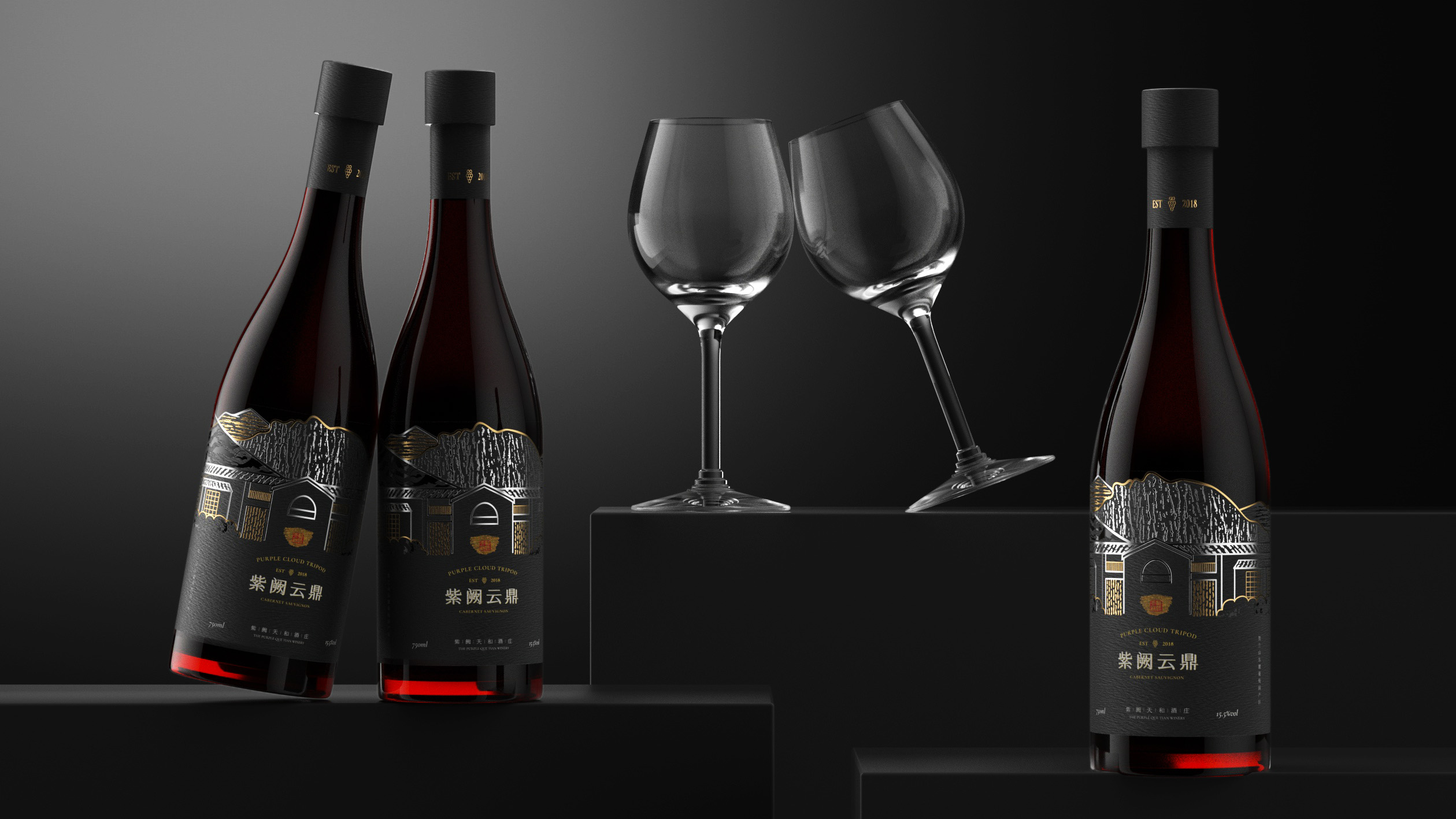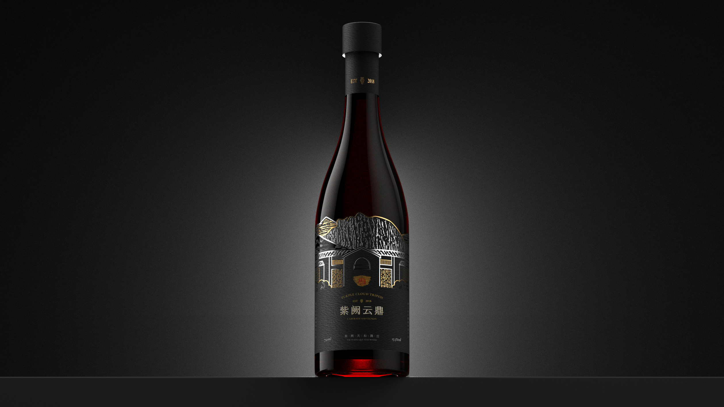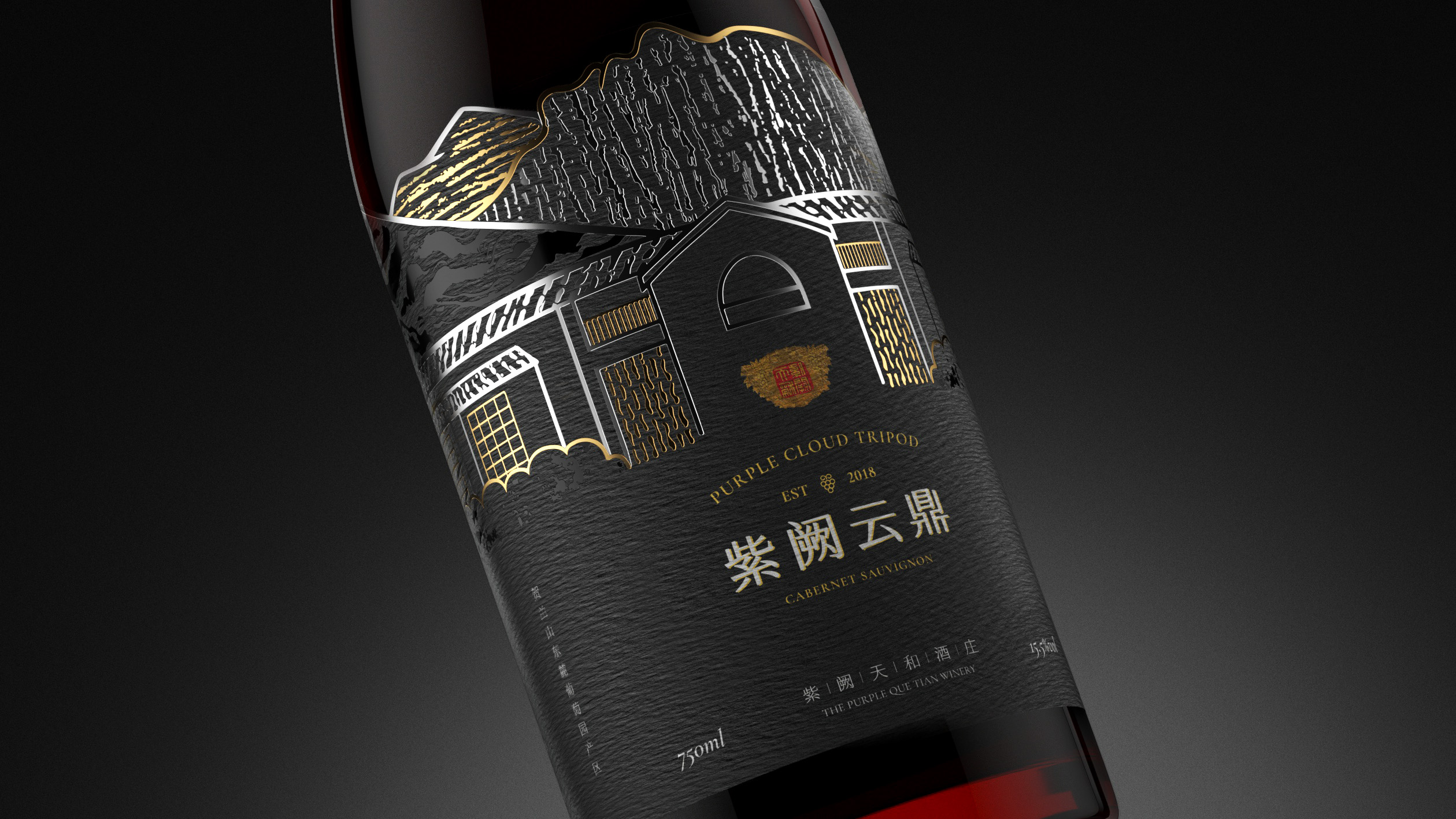 瓶颈处简约镌刻“EST. 2018”与葡萄图标,突出品牌历史与专业性。标签以烫金压纹工艺呈现,层次丰富,触感细腻,提升整体高级感与礼赠价值。正中“紫阙云鼎”字体采用篆意书风,与英文名称“PURPLE CLOUD TRIPOD”形成中西融合的视觉结构。