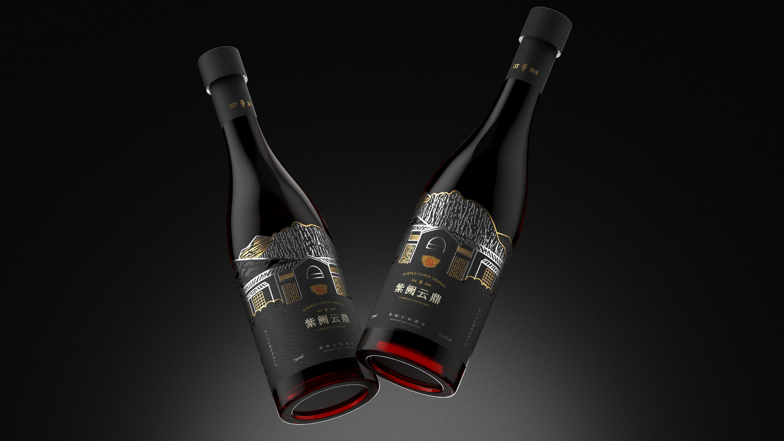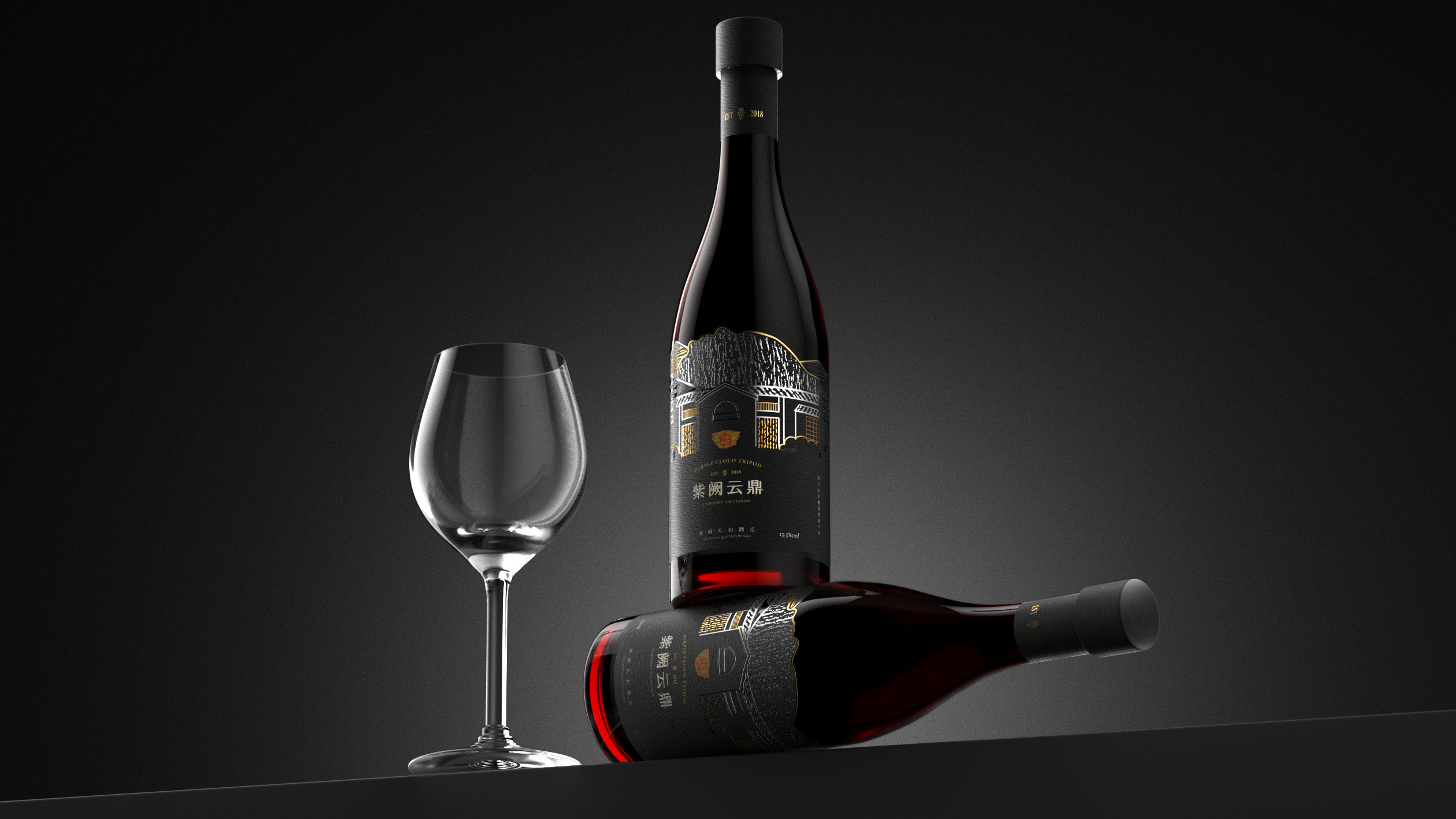 紫阙天和酒庄红酒包装以“紫阙云鼎”为名,整体设计融合东方神韵与现代美学,彰显品牌文化底蕴与高端格调。瓶身主色调为深邃黑金,传达出沉稳、尊贵的品质感,同时以烫金线条勾勒出典雅门阙与山峦叠影,象征酒庄背靠名山、门第不凡,亦寓意“天人共酿,尊藏于鼎”的文化意象。