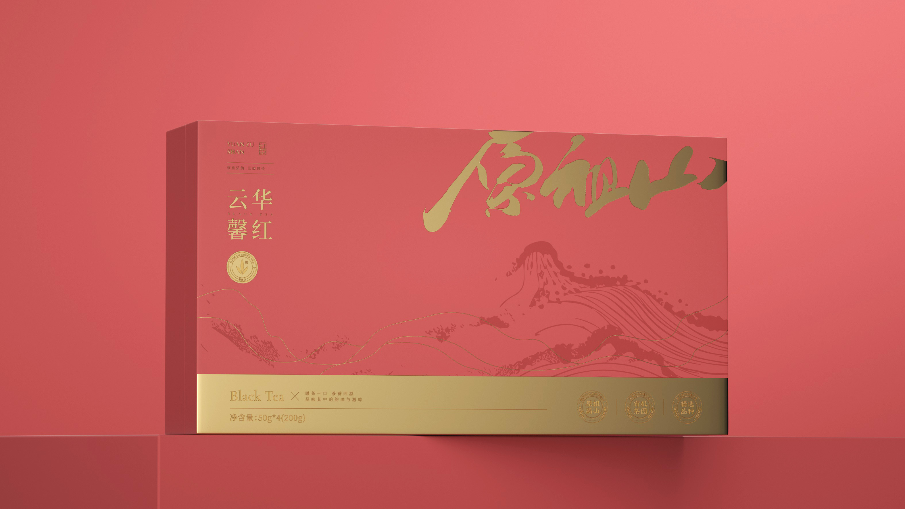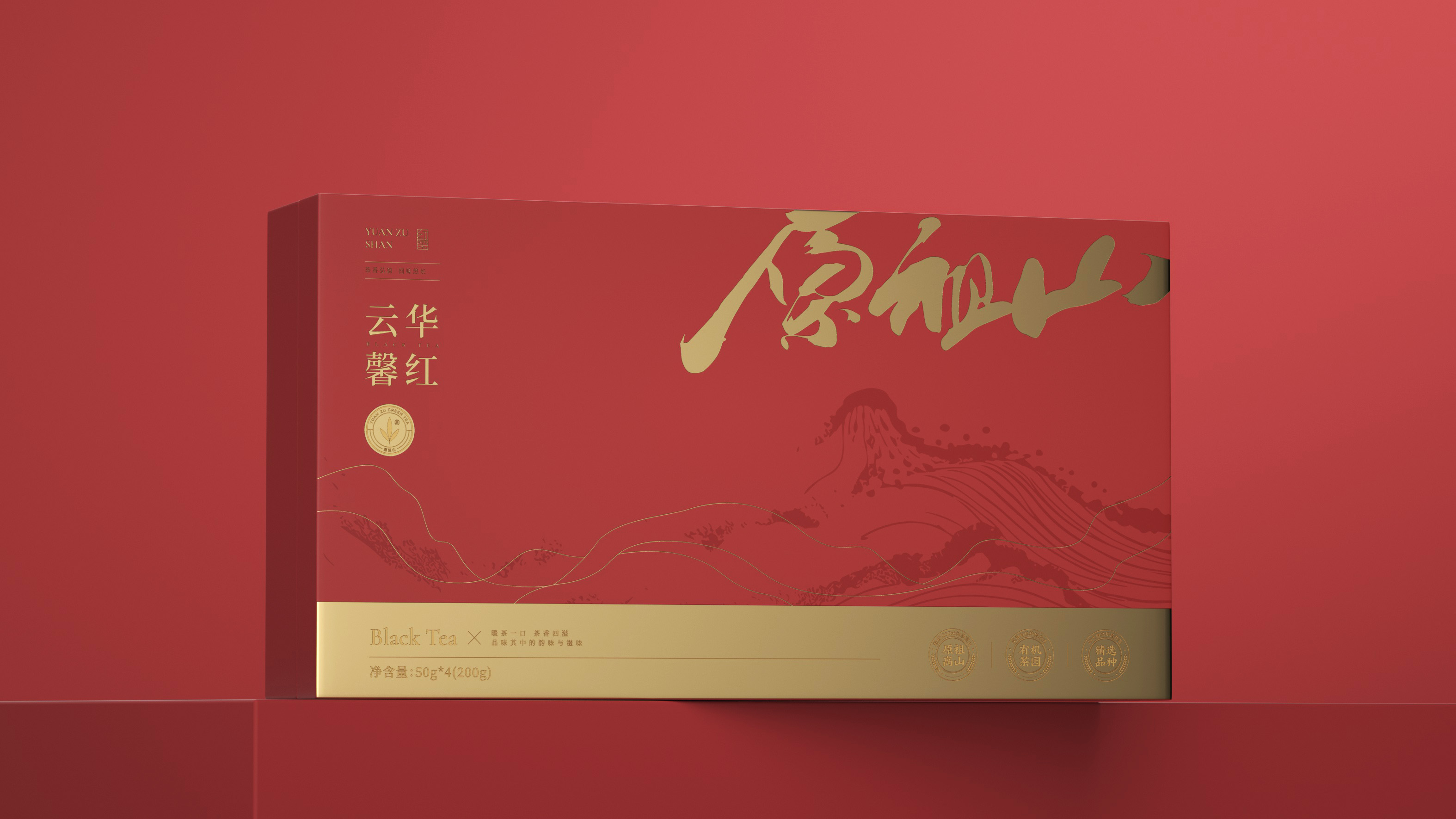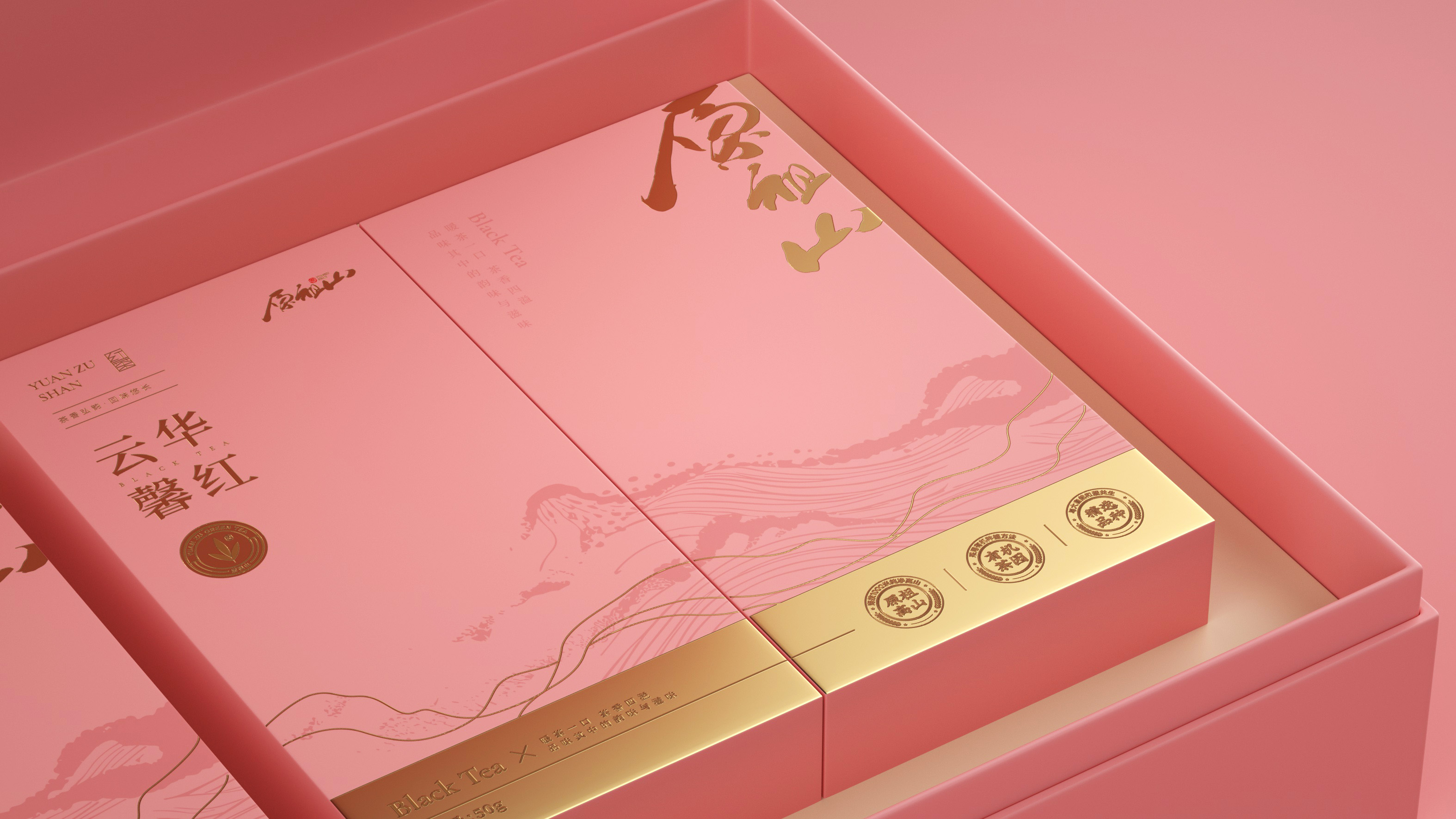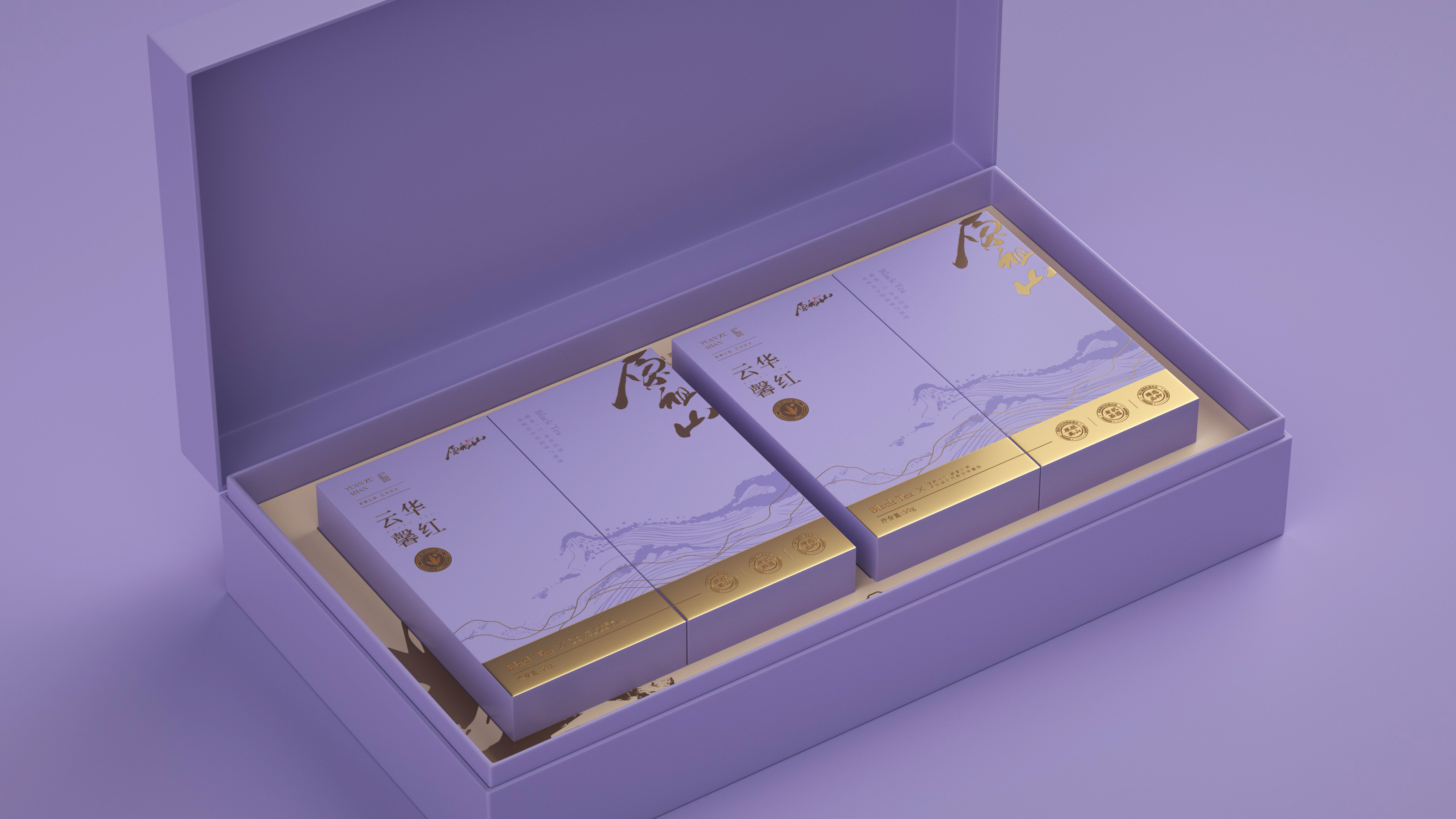 原祖山系列茶叶包装以“源于山,自有道”为核心理念,整体视觉设计融合现代美学与东方意境,诠释品牌的自然纯粹与文化底蕴。各系列产品通过色彩区分茶类属性——黑金系体现白茶的雅贵,紫金系彰显红茶的高贵典雅,墨红与翠绿分别赋予红茶与绿茶更鲜明的品类记忆。