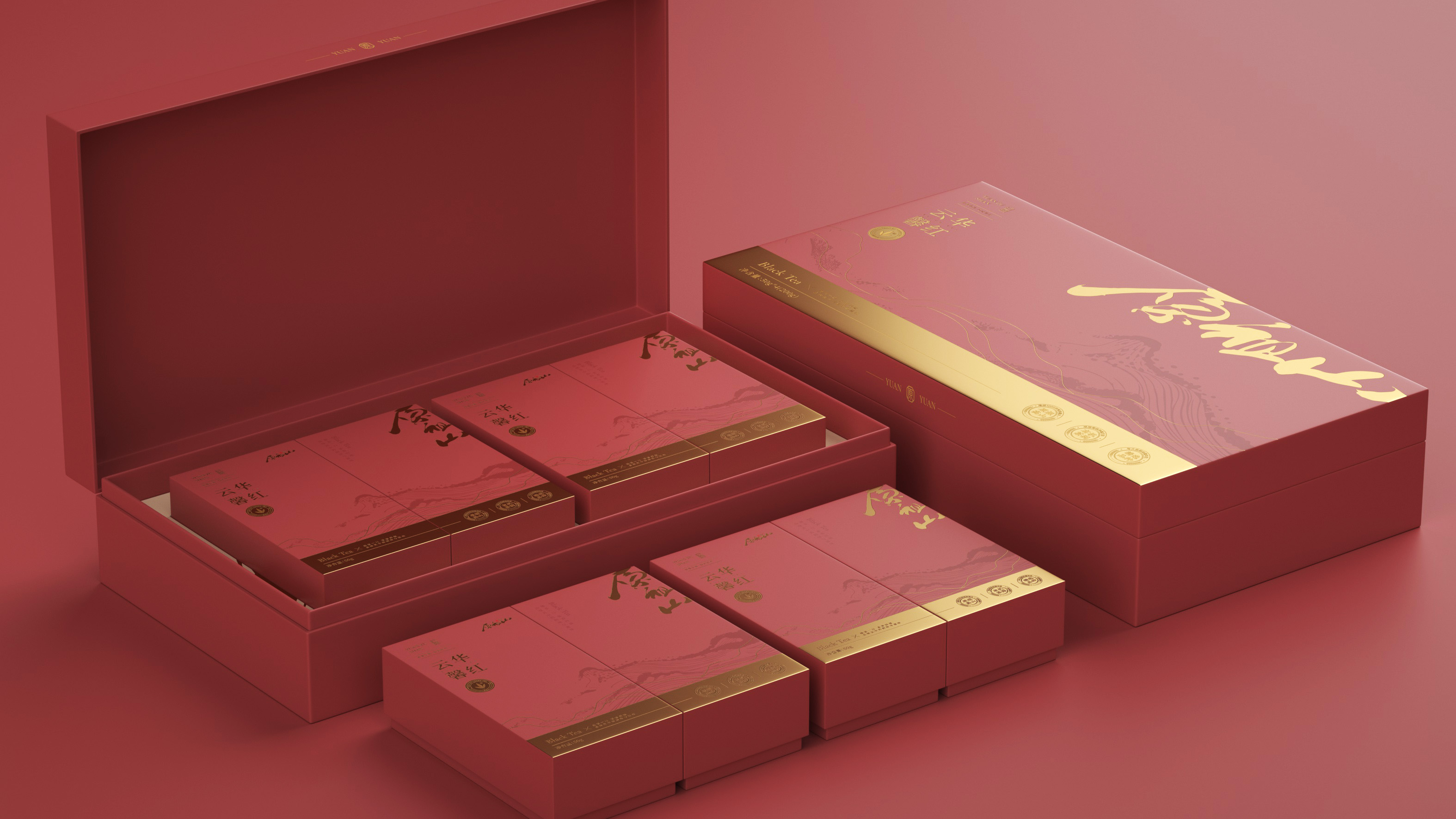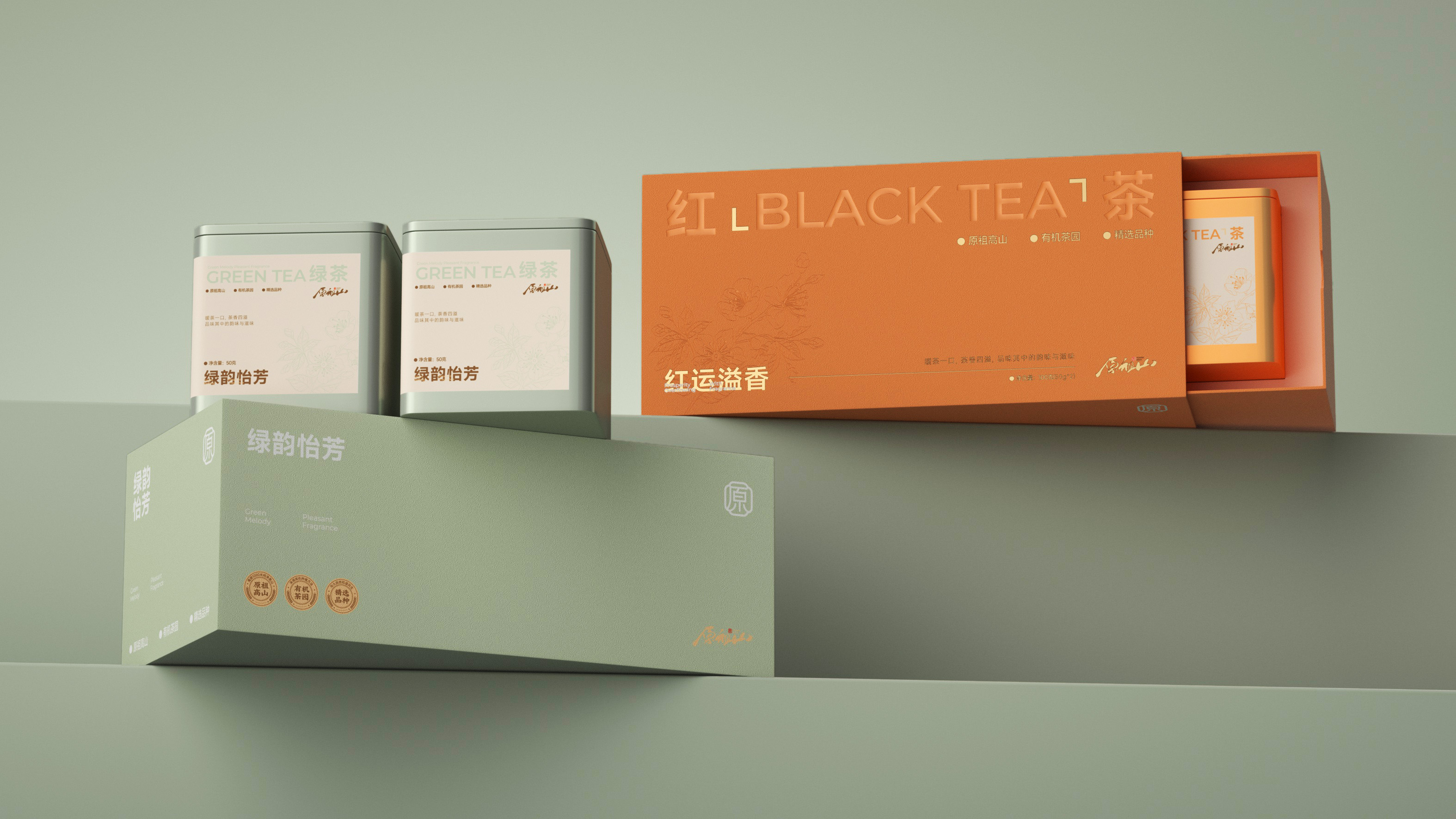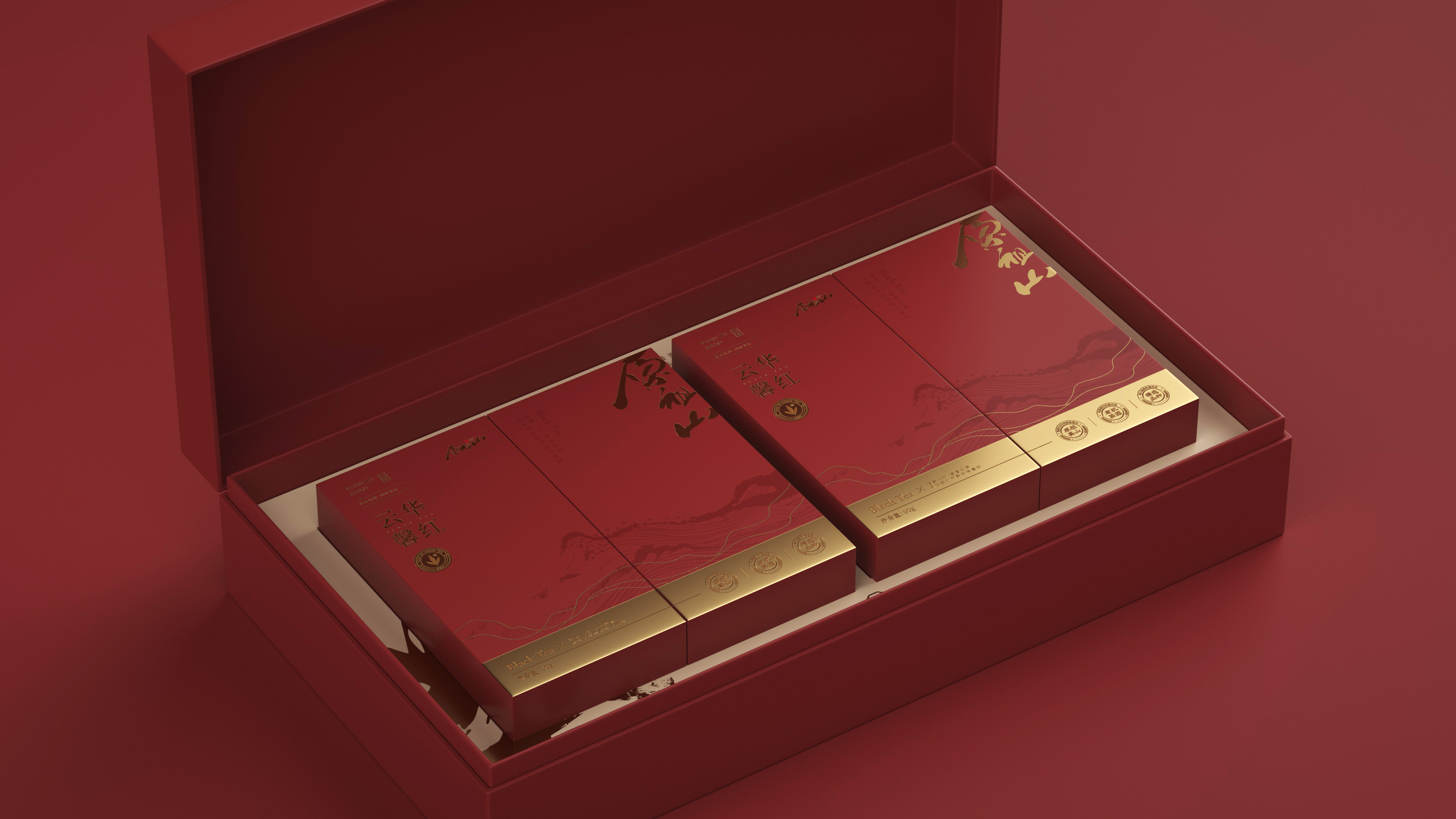 原祖山系列茶叶包装以“源于山,自有道”为核心理念,整体视觉设计融合现代美学与东方意境,诠释品牌的自然纯粹与文化底蕴。各系列产品通过色彩区分茶类属性——黑金系体现白茶的雅贵,紫金系彰显红茶的高贵典雅,墨红与翠绿分别赋予红茶与绿茶更鲜明的品类记忆。
