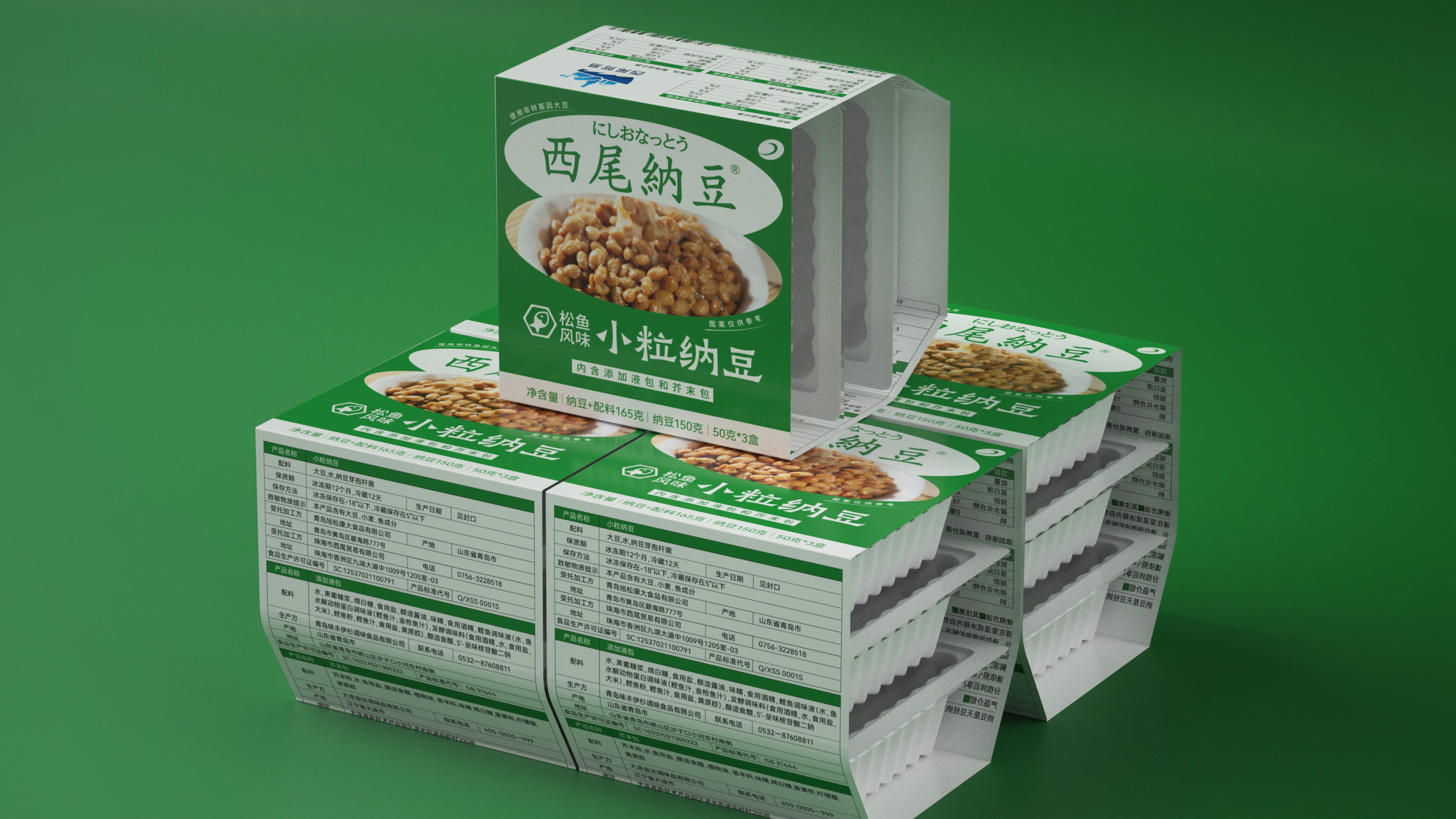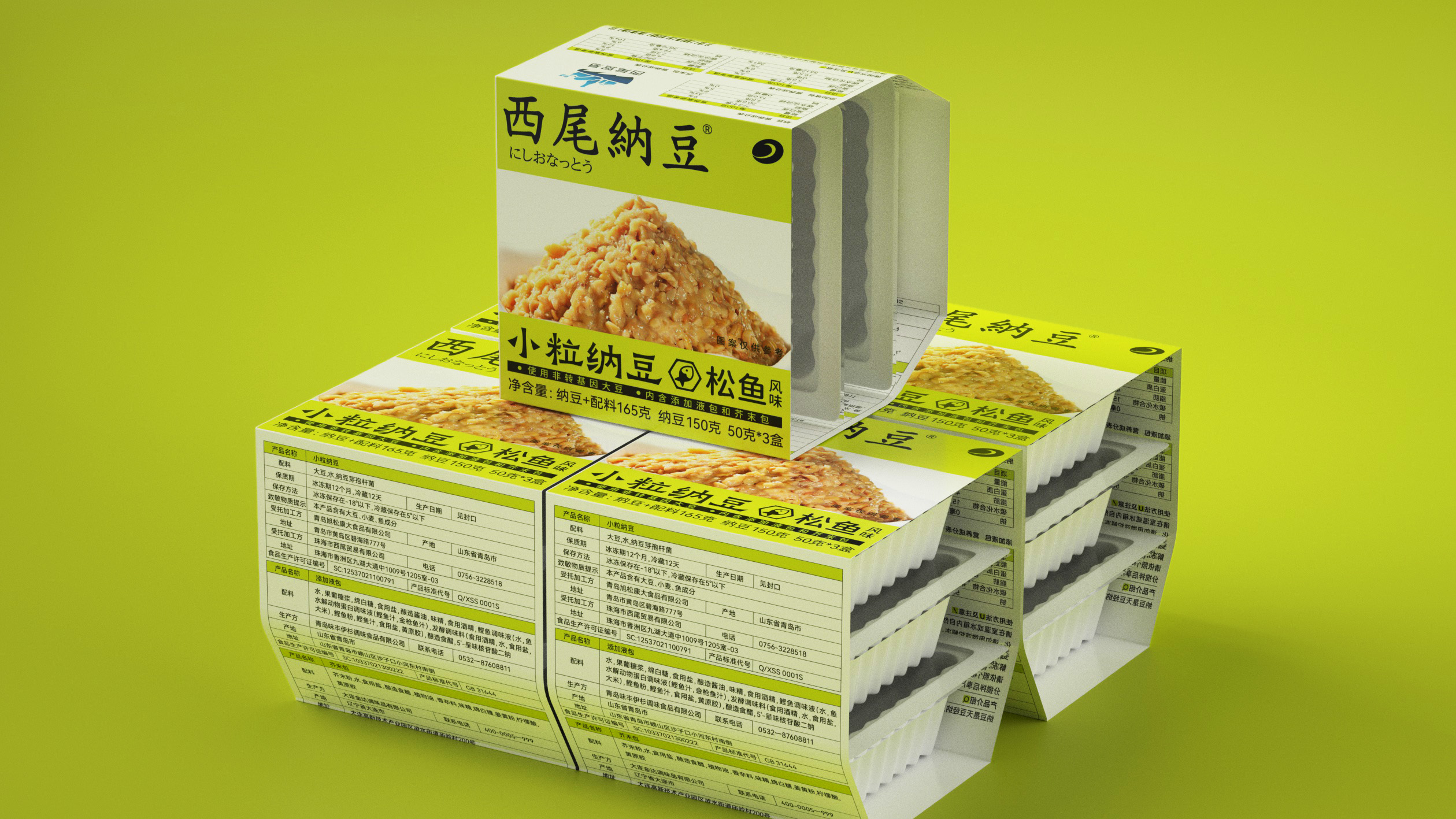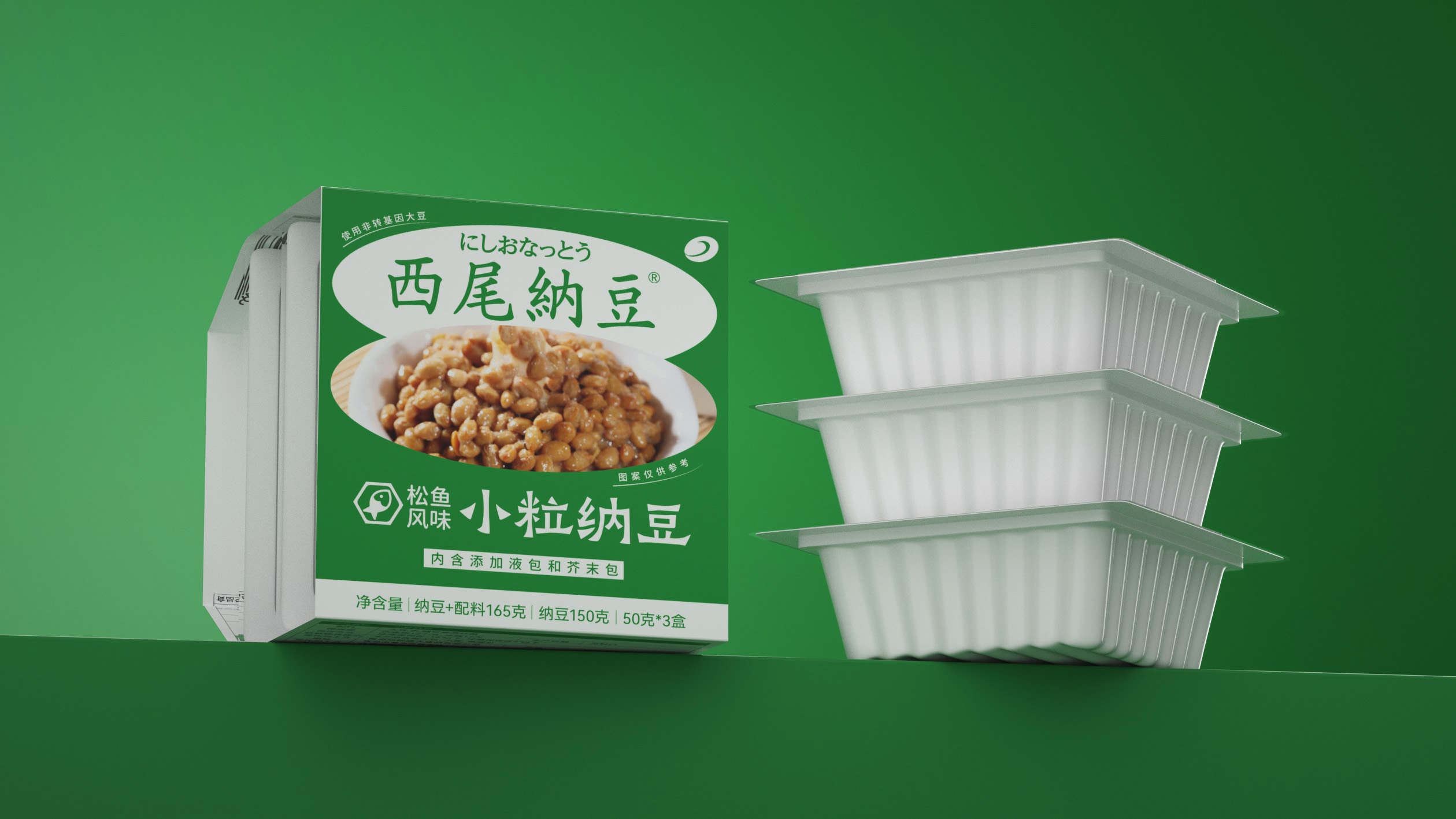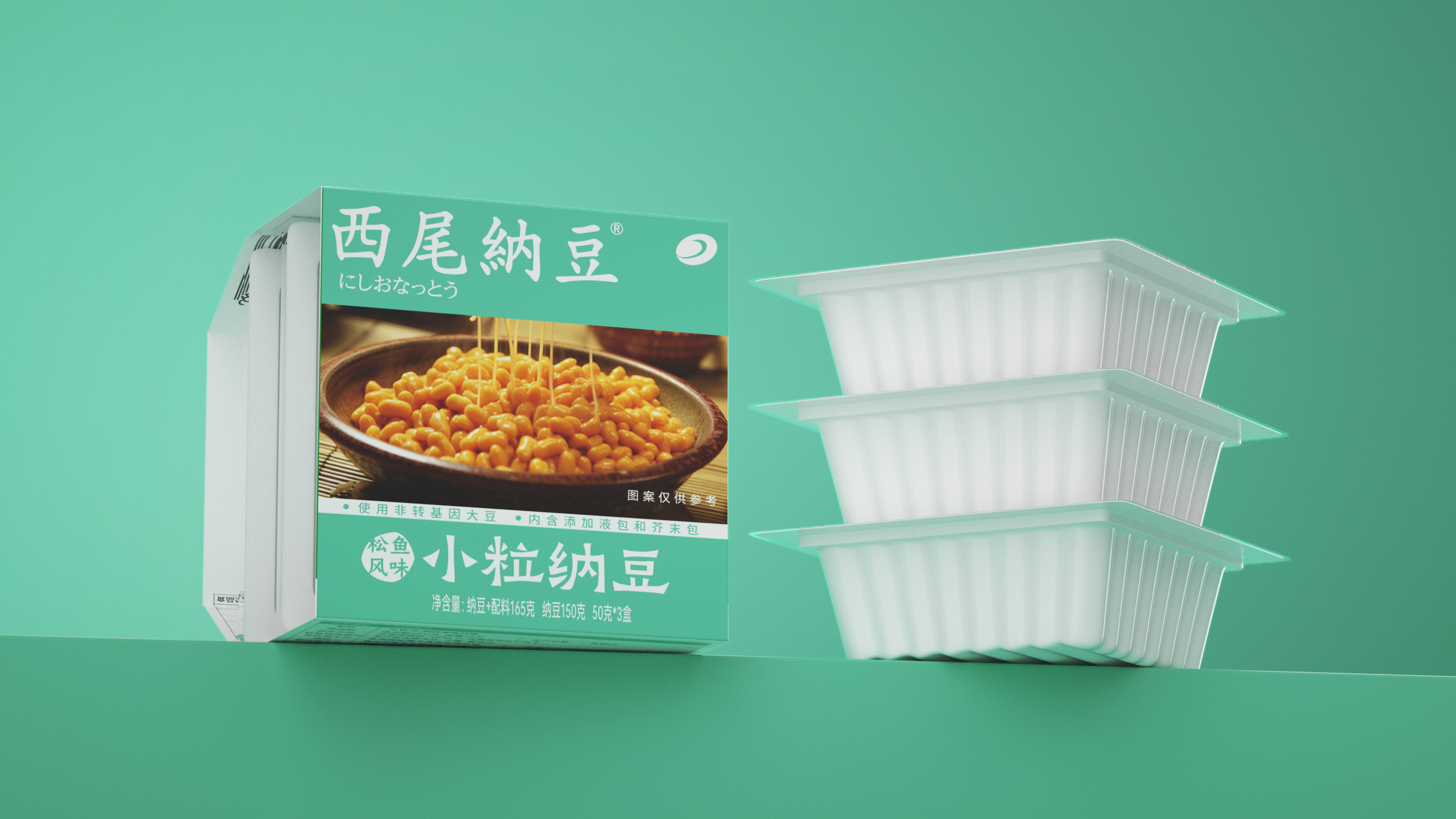 包装正面以“西尾纳豆”品牌名称为主视觉,搭配真实食物图片直观展示产品状态,加强消费者的食欲感知与信任感。搭配清晰的配料、食用方法及营养信息区域,突出理性消费逻辑。同时,标识“松鱼风味”“非转基因”“添加调料包与芥末包”等关键信息,以高识别度的图标形式增强信息传达效率。侧面三连杯结构既符合市场常见包装习惯,也方便冷藏储存与一次性消费。整体设计兼顾实用性、识别度与地域特色,体现西尾纳豆对品质与健康生活方式的坚持。