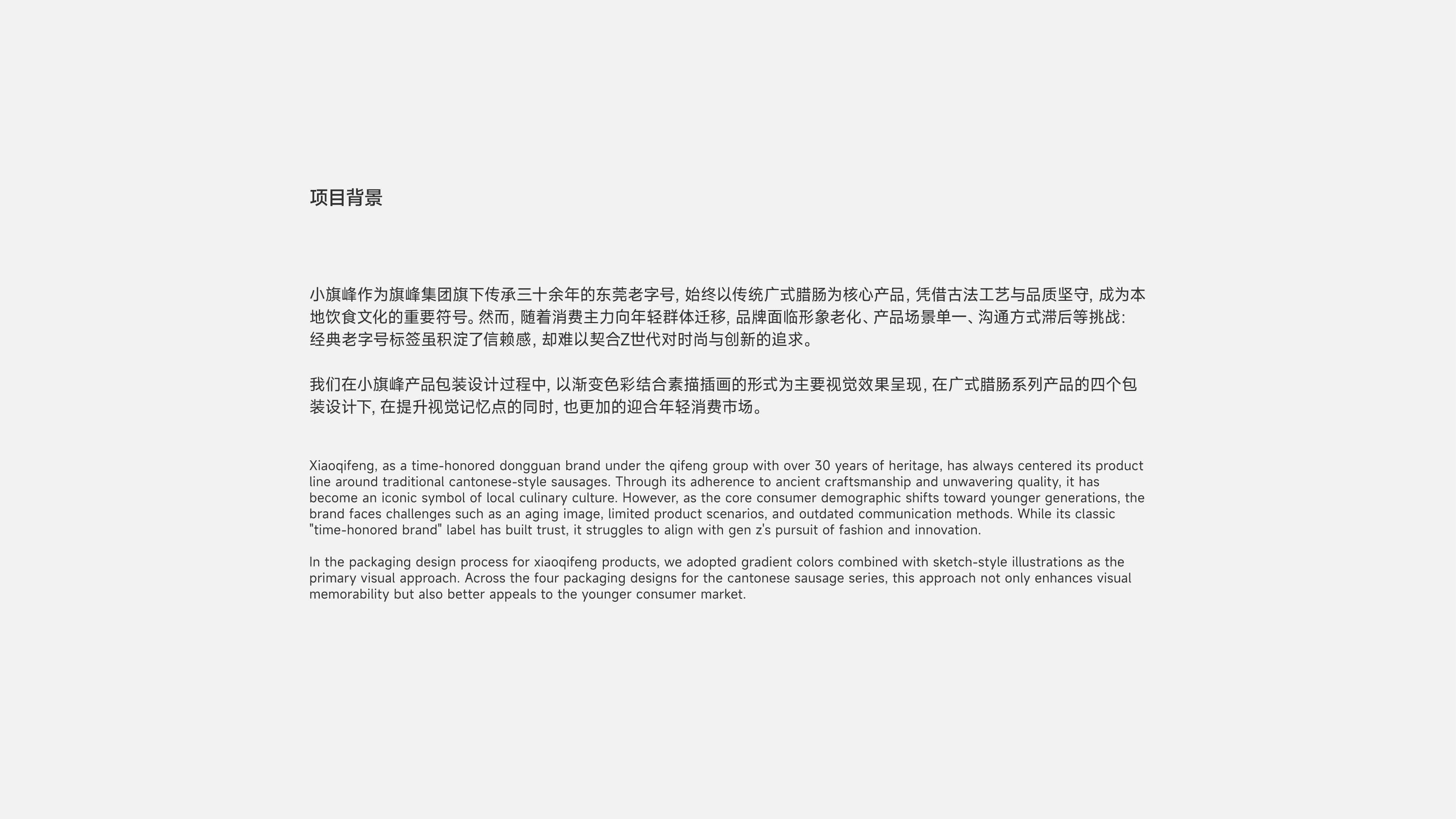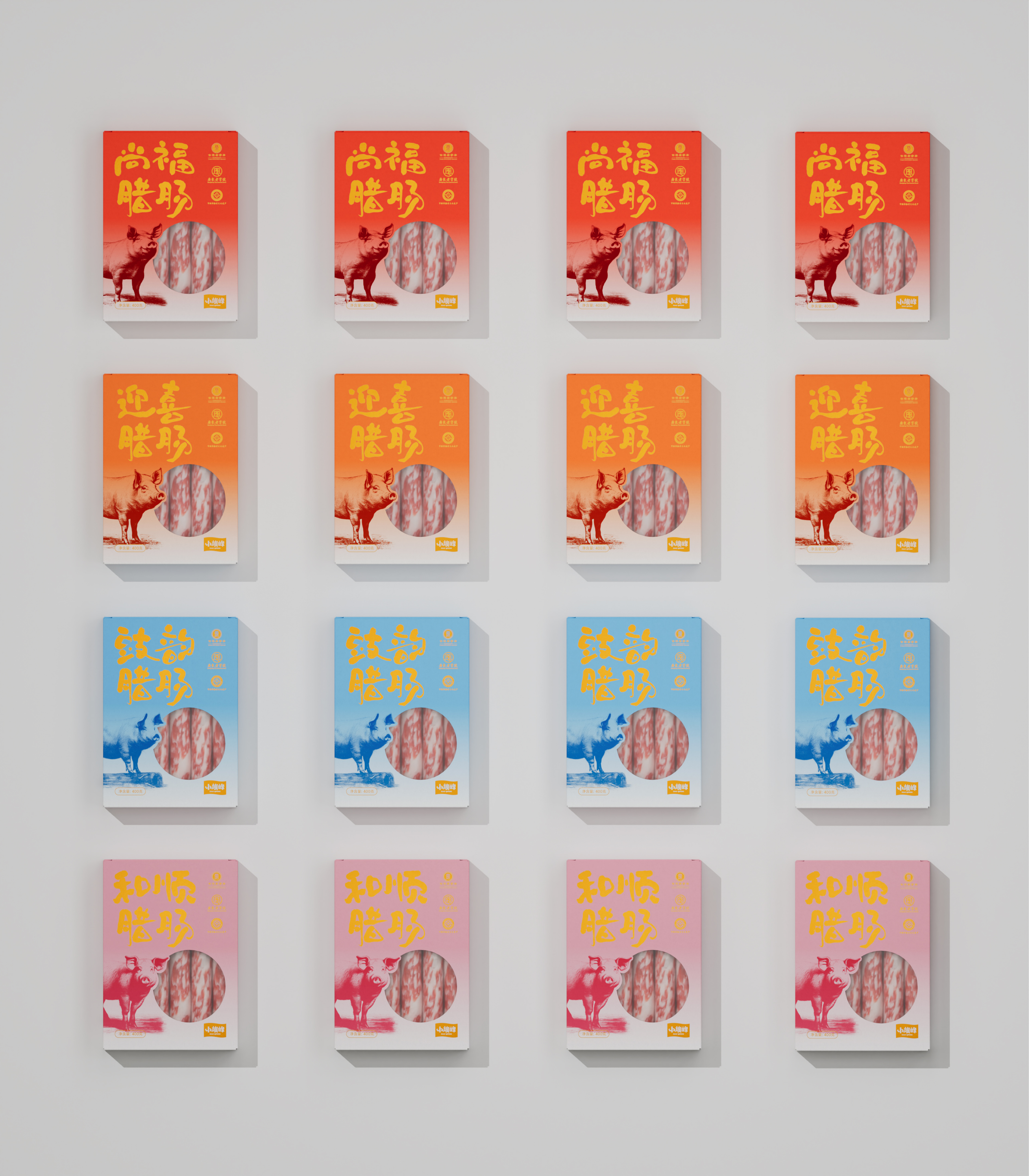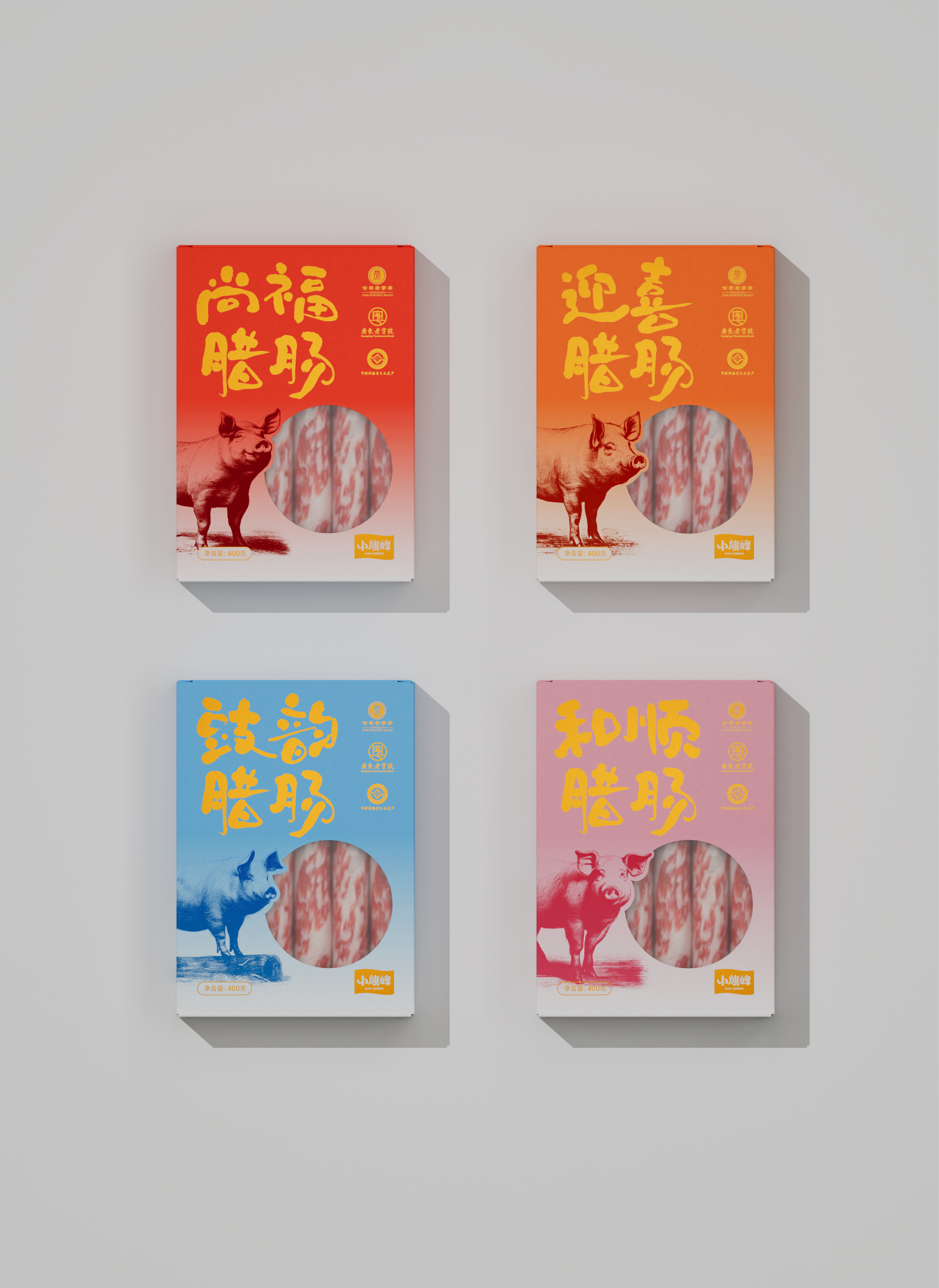 我们在小旗峰产品包装设计过程中,以渐变色彩结合素描插画的形式为主要视觉效果呈现,在广式腊肠系列产品的四个包装设计下,在提升视觉记忆点的同时,也更加的迎合年轻消费市场。