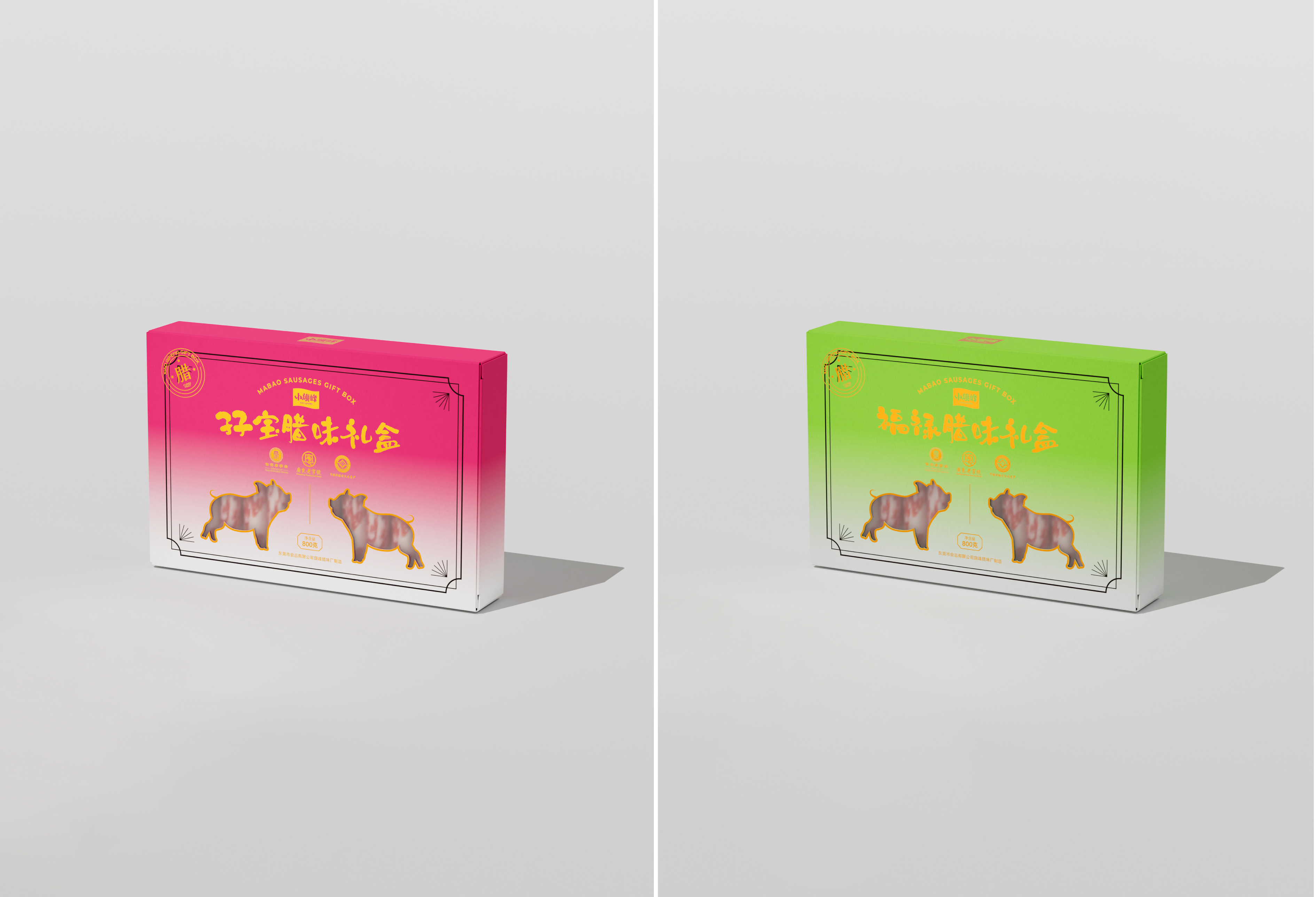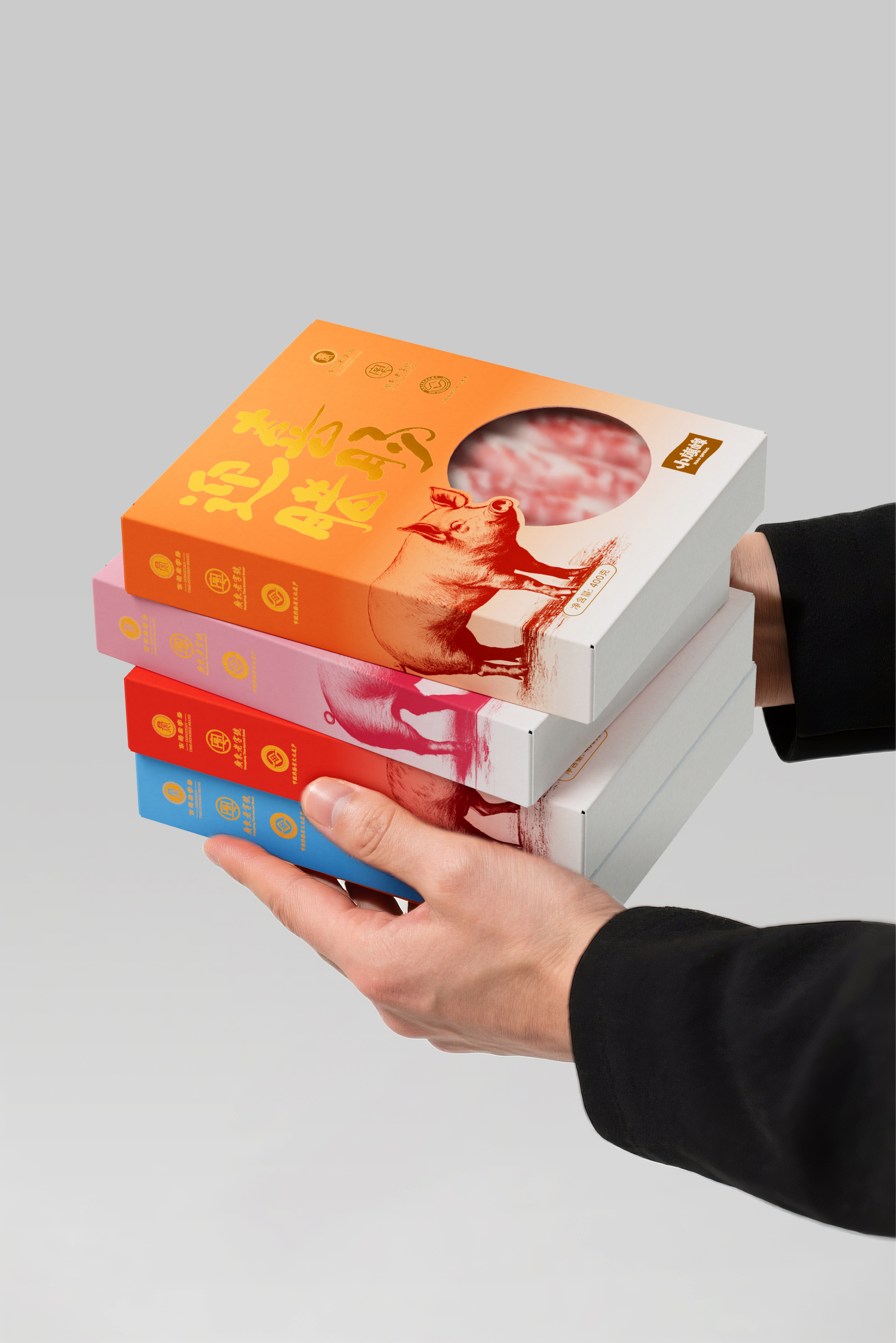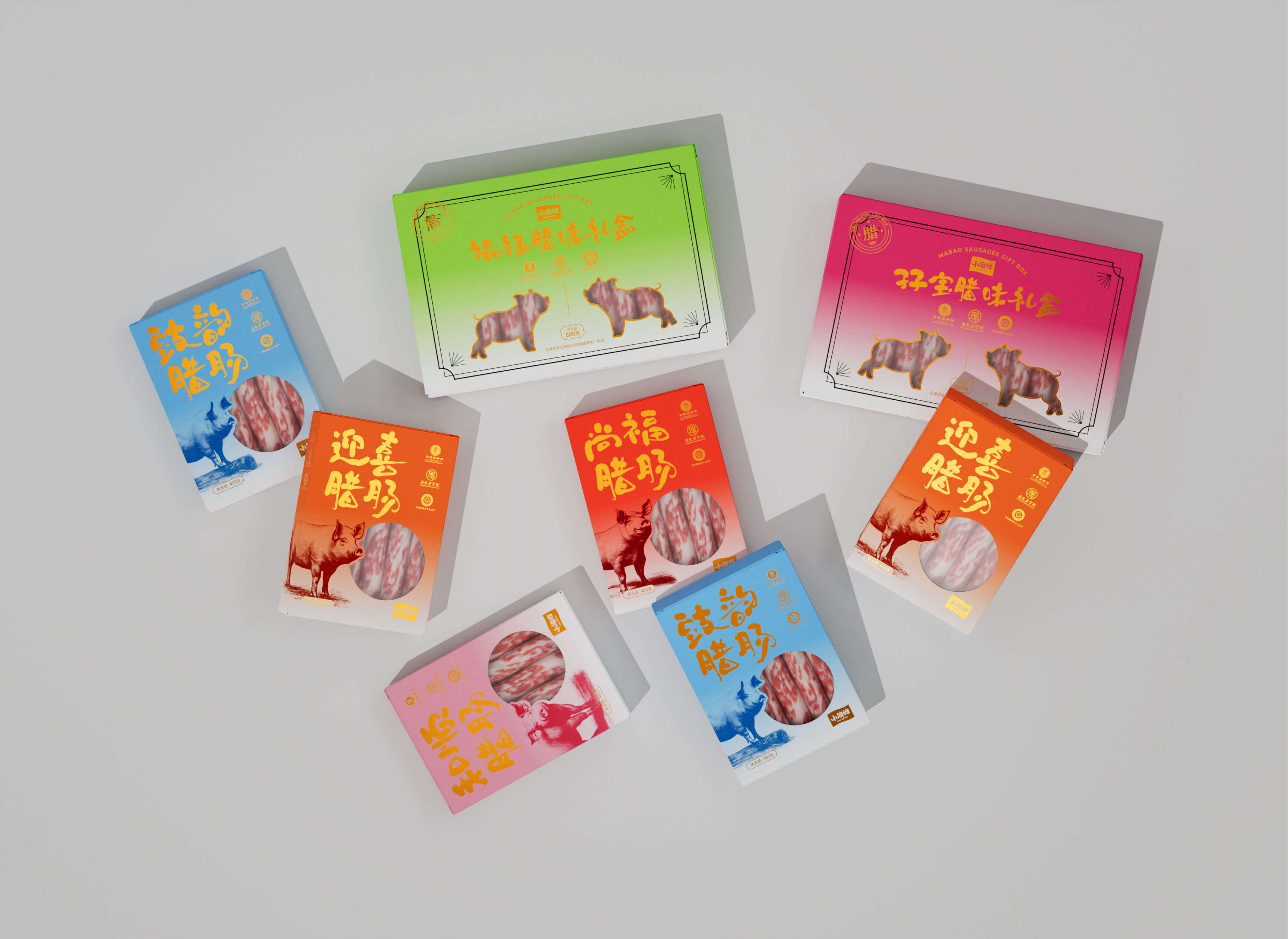 我们在小旗峰产品包装设计过程中,以渐变色彩结合素描插画的形式为主要视觉效果呈现,在广式腊肠系列产品的四个包装设计下,在提升视觉记忆点的同时,也更加的迎合年轻消费市场。
