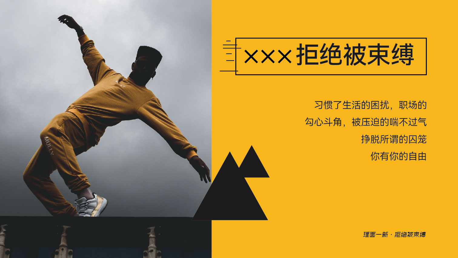 习惯了生活的困扰,职场的勾心斗角,被压迫的喘不过气,挣脱所谓的囚笼,你有你的自由,理面一新,拒绝被束缚。
