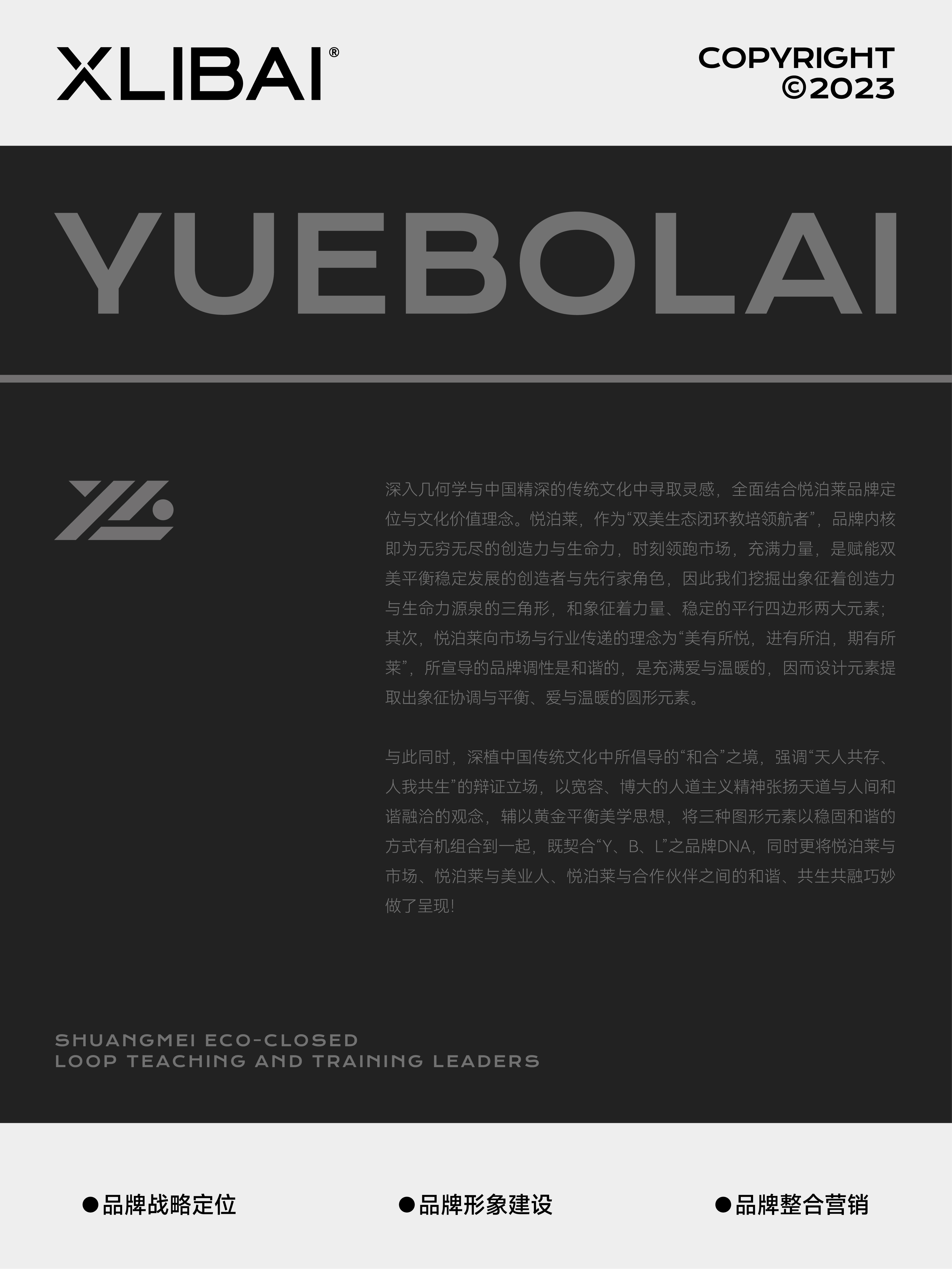 悦泊莱,从属于悦莱美集团旗下,是一个以双美教培为主导,且辐射医疗美容产品及设备的研发/生产/销售、医美/生美品项塑造、生美门店孵化等领域的实力品牌。战略布局之初,悦泊莱寻定小李白团队,团队在深入内访外调的过程之中深入洞悉悦泊莱的品牌基因、核心优势与战略走向,最终助力品牌打造出了集生美/医美“品、项、械、术、人”五维一体的全链路生态闭环系统,助力悦泊莱真正树立起“美业人的成长陪跑者”之专业权威形象,并以此为发散,为品牌量身而定了一套完善的品牌视觉识别系统、品牌招商系统、品牌文化价值体系,真正助力悦泊莱在双美教培领域狂飙腾飞!