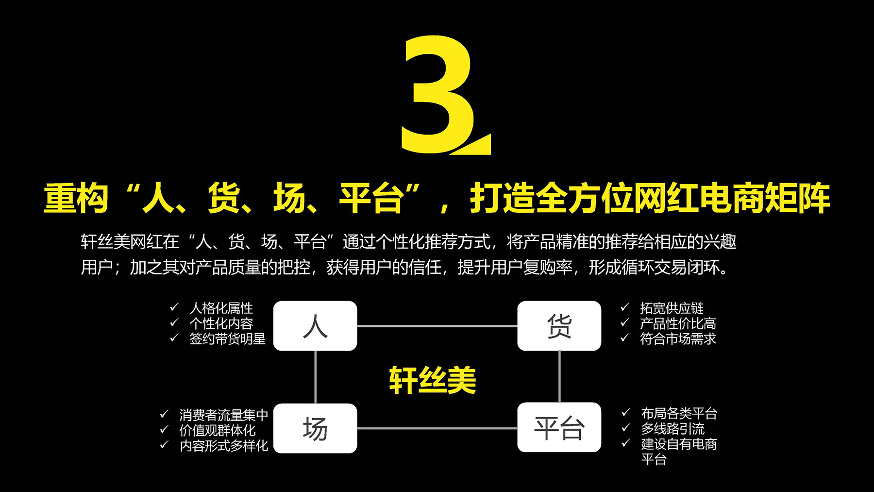 轩丝美找到小李白,就是希望利用这个资本风口和自身项目优势,加速扩张招商,壮大自己的项目。小李白从资本市场、行业巨头、国家政策、行业趋势、消费群体等方向挖掘出,围绕电商红人定向培训的机构应声站上资本风口!深层挖掘轩丝美的商业模式,针对“引流-培训-毕业孵化”覆盖网红电商全产业链的特性,为轩丝美轩丝美网红孵化基地量身定制了招商运作方案,将品牌运作带上了高速轨道。