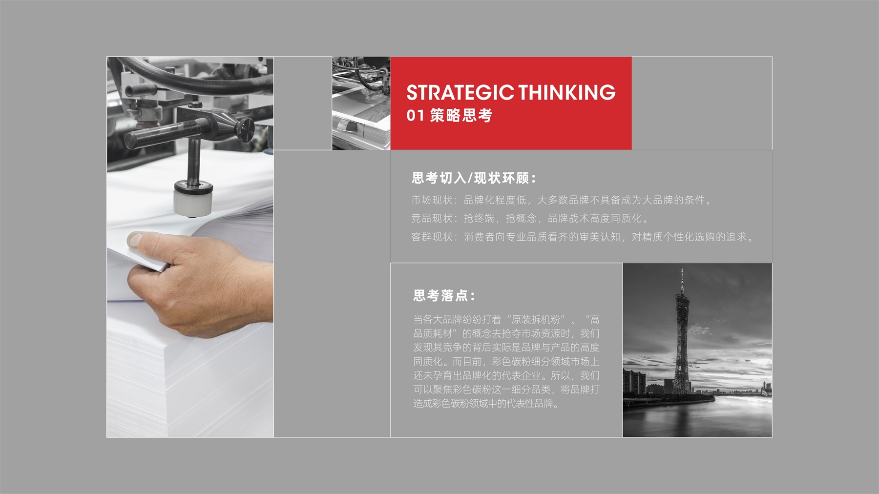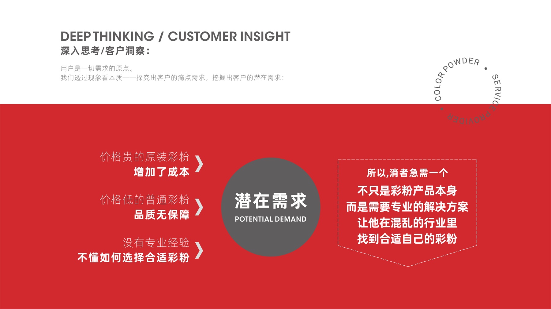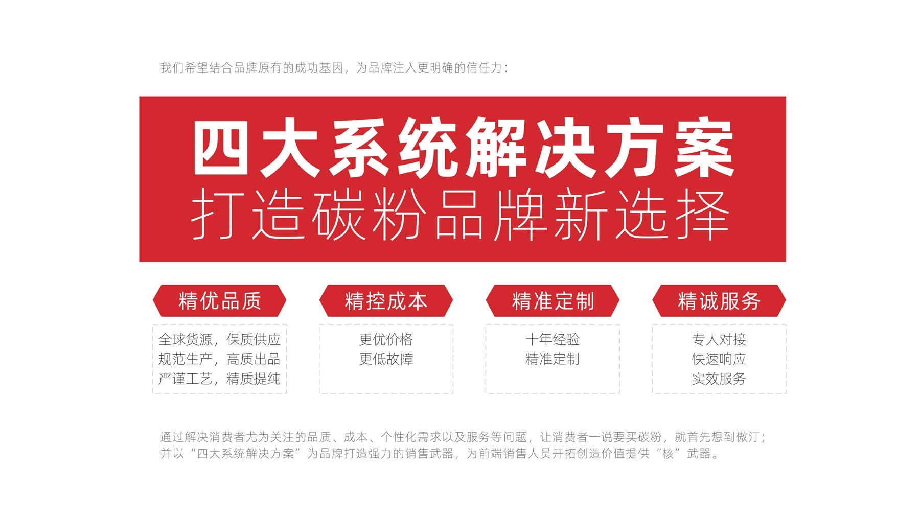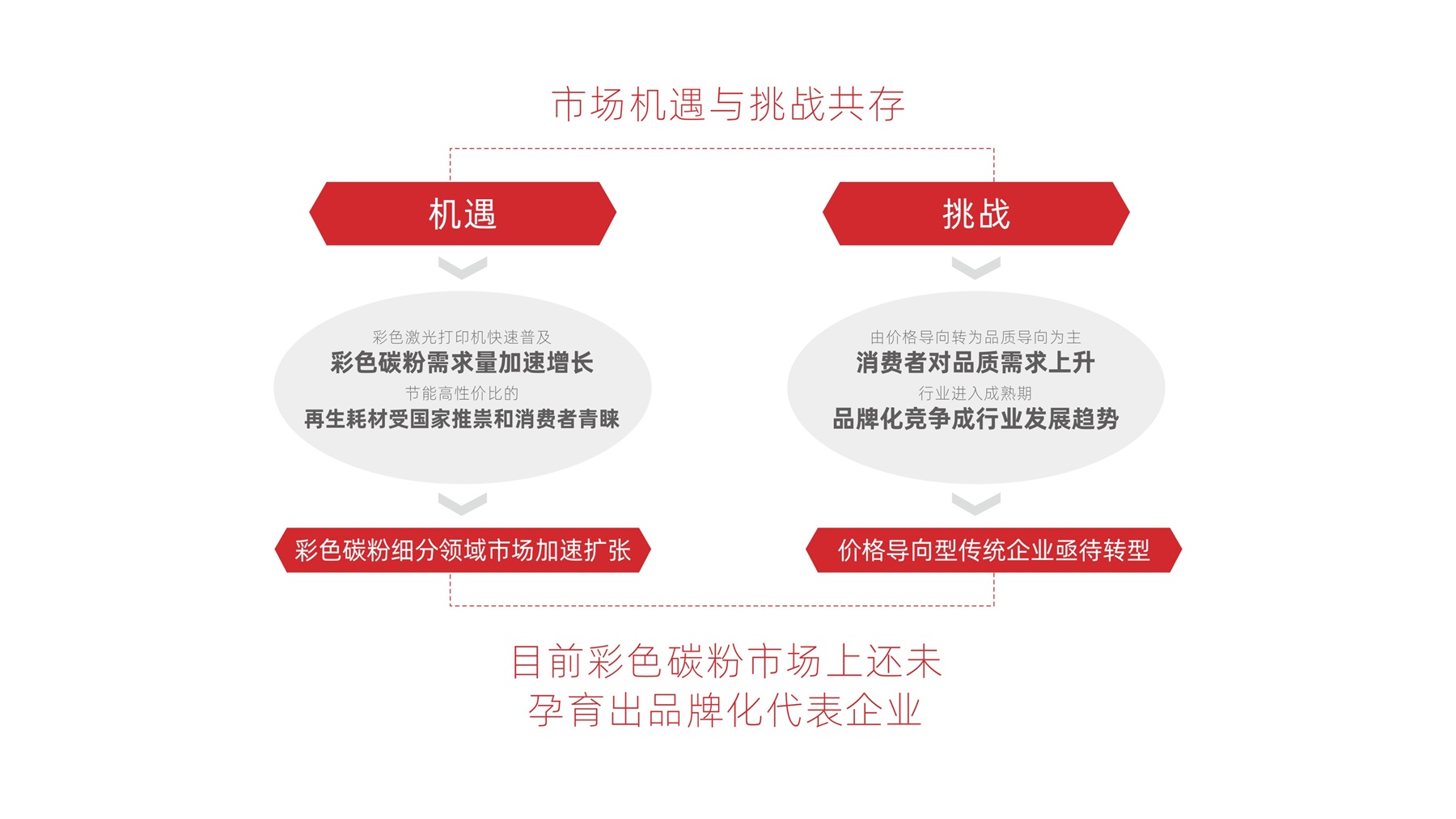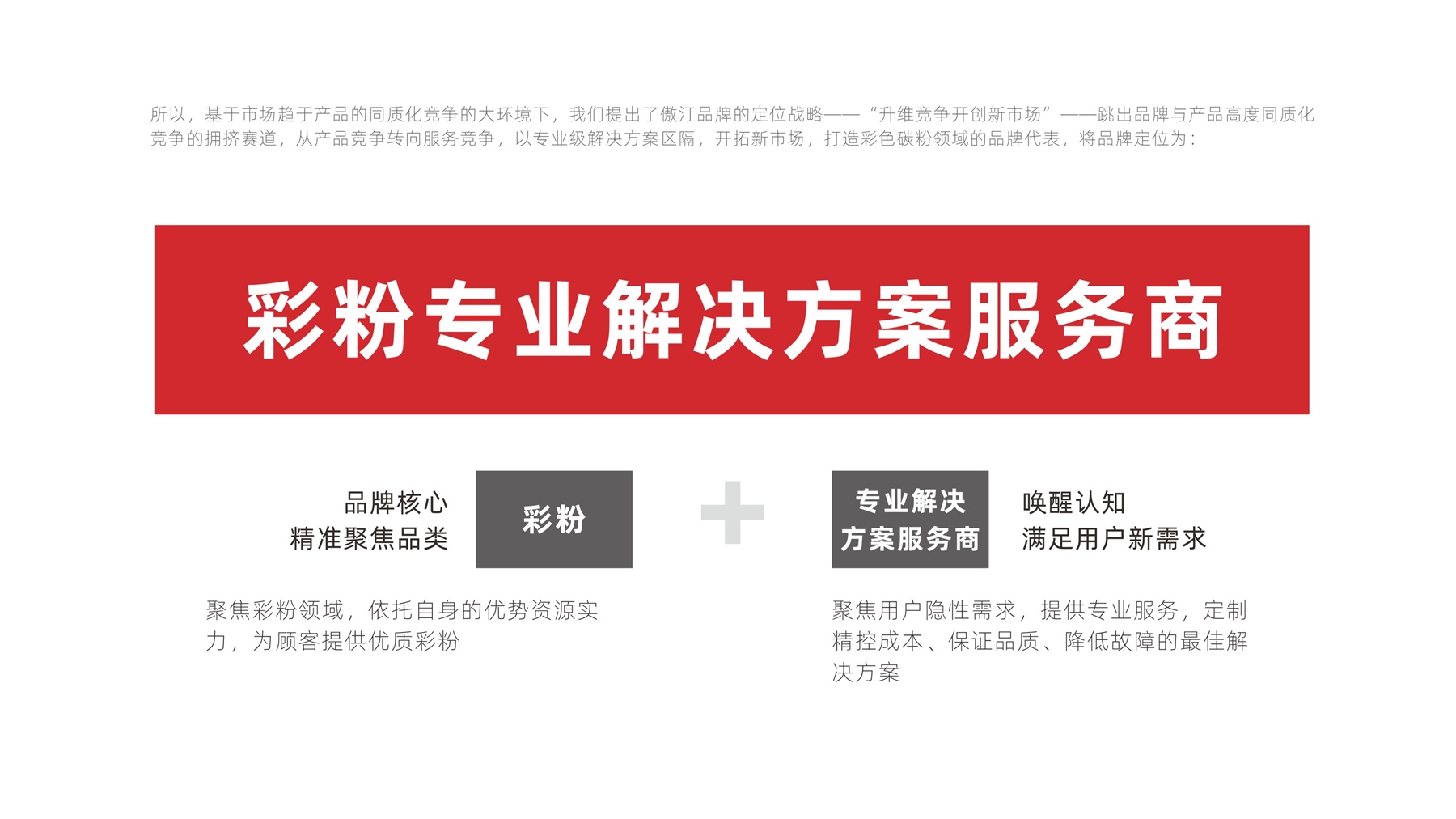 当各大品牌纷纷打着“原装拆机粉”、“高品质耗材”的概念去抢夺市场资源时,我们发现其竞争的背后实际是品牌与产品的高度同质化。而目前,彩色碳粉细分领域市场上还未孕育出品牌化的代表企业。所以,我们可以聚焦彩色碳粉这一细分品类,将品牌打造成彩色碳粉领域中的代表性品牌。