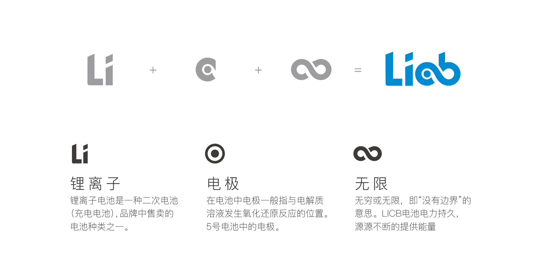 通过前期对LICB电池品牌的分析,小李白发现LICB电池的续航持久力是品牌和核心优势和卖点,因此在品牌设计上我们以“持久续航”为出发点,进行了创意延展。经过五轮的头脑风暴,我们在众多的关键词中凝练了“能量、∞”,结合电池元素“电极”作为结合,完成了LICB电池的品牌视觉创意,并深入延展到品牌的VI体系。