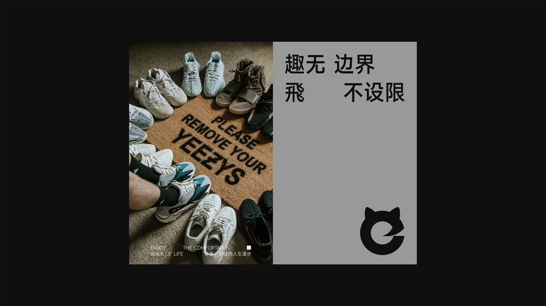 飛,以鞋为始,宣扬“趣无边界,飛不设限”的精神内核,敢于挑战同质化,以“无边界设计”为概念,深入新世代的多元需求,不断探索潮流时尚与科技性能的创新融合,创造出不拘于性别、年龄、风格和场景限制,适合于任何人的舒适鞋履,更力求舒适健康与设计美学的充分联结,以此打造成为一个良心品质的潮鞋代表品牌!