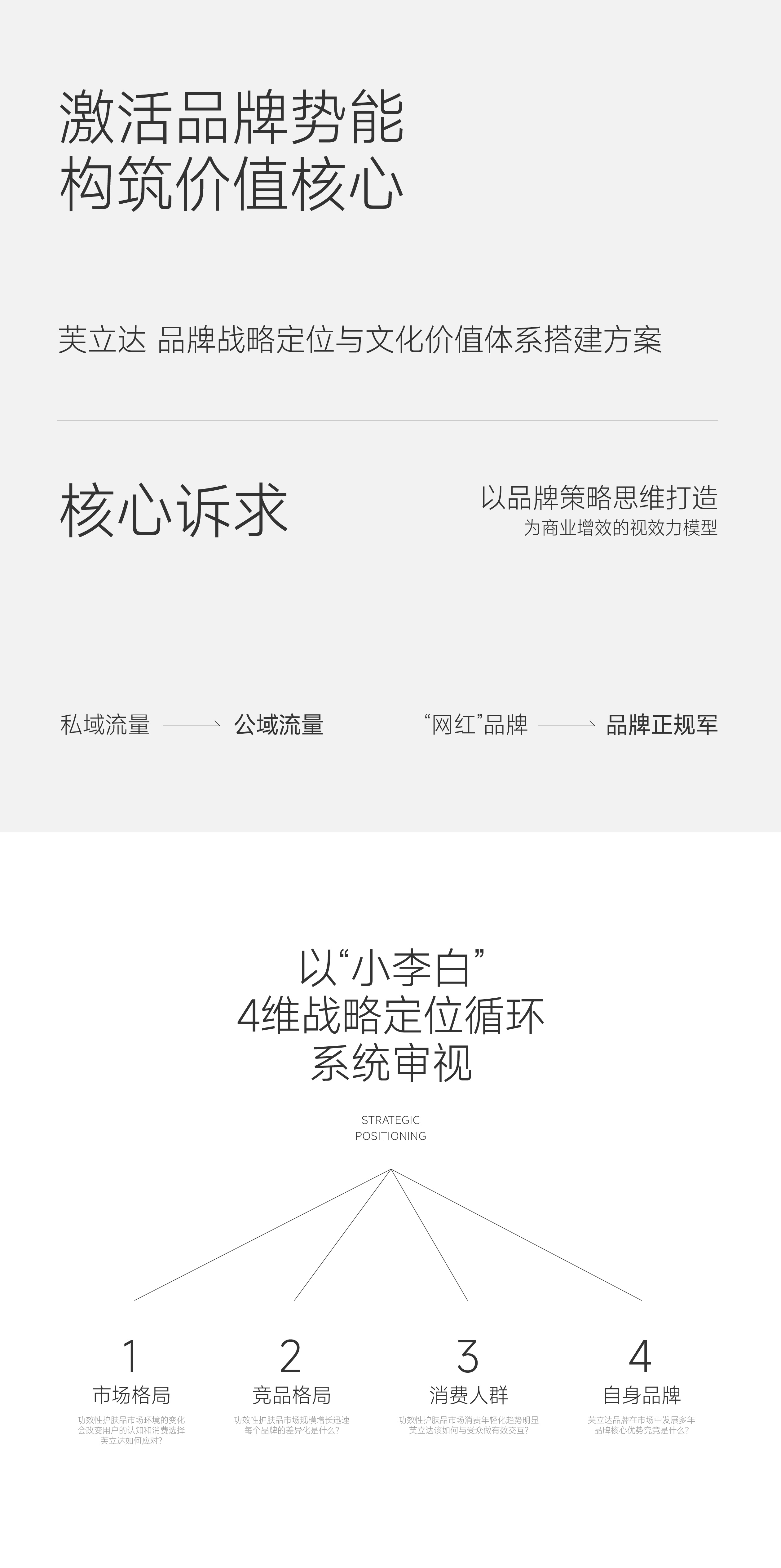 芙立达,作为我们2022年中合作的高端护肤品牌,以其专业的科技和前沿的护肤理念赢得了市场的关注和认可。作为合作伙伴,我们深入研究市场需求和用户洞察,结合芙立达的品牌定位和文化价值,通过精细的战略规划和VI视觉系统打造,实现了品牌的完美落地。在这个过程中,孙总团队的用心配合和对小李白的信任,让我们感到无比荣幸和感恩。