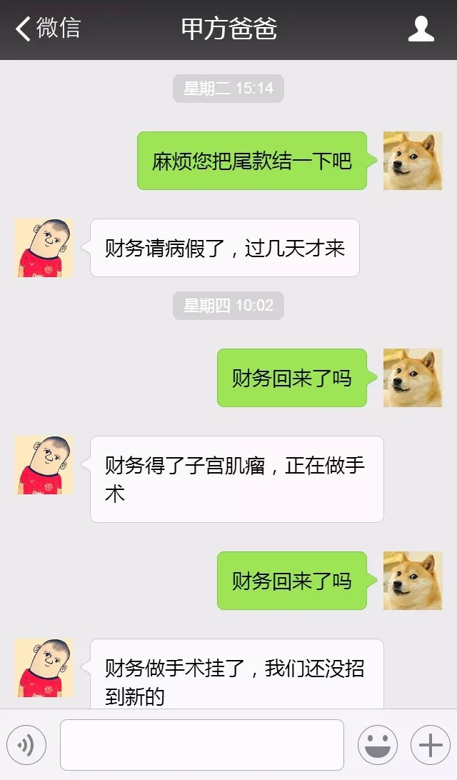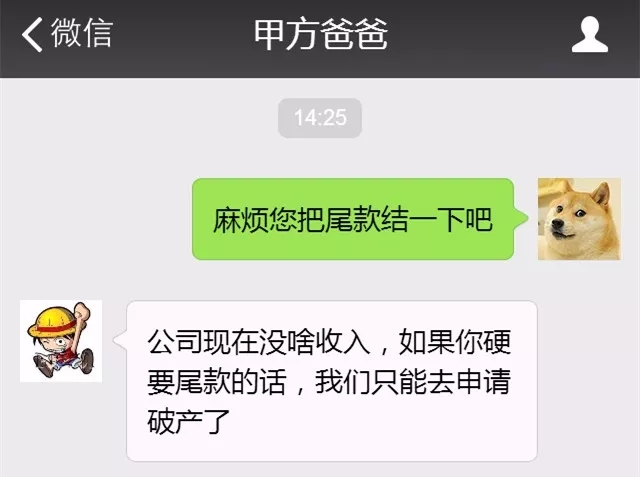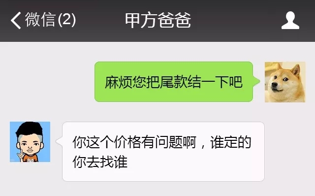 也有一些甲方,你连尾款都不好意思提,方案改了上百次,改得你只想把预付款都想还给他。当然,大多数时候,别说尾款,你连甲方都没有。当你说出报价的时候,他立马惊掉下巴“什么?这么贵?”,然后就没有然后了(突然心里感觉无比踏实,再也没有催尾款的烦恼了)。温馨提示:以上聊天内容纯属虚构,如有雷同,纯属扯蛋!因为咱公众号本来就叫“扯广告的蛋”,现实中,大部分甲方爸爸人还是很Nice的。尤其是咱小李白的客户,个个都是一顶一的讲信用,又帅又多金,从来没有拖欠款的情况发生,因为小李白过硬的专业素质和优质的服务,让他们不好意思这样做。